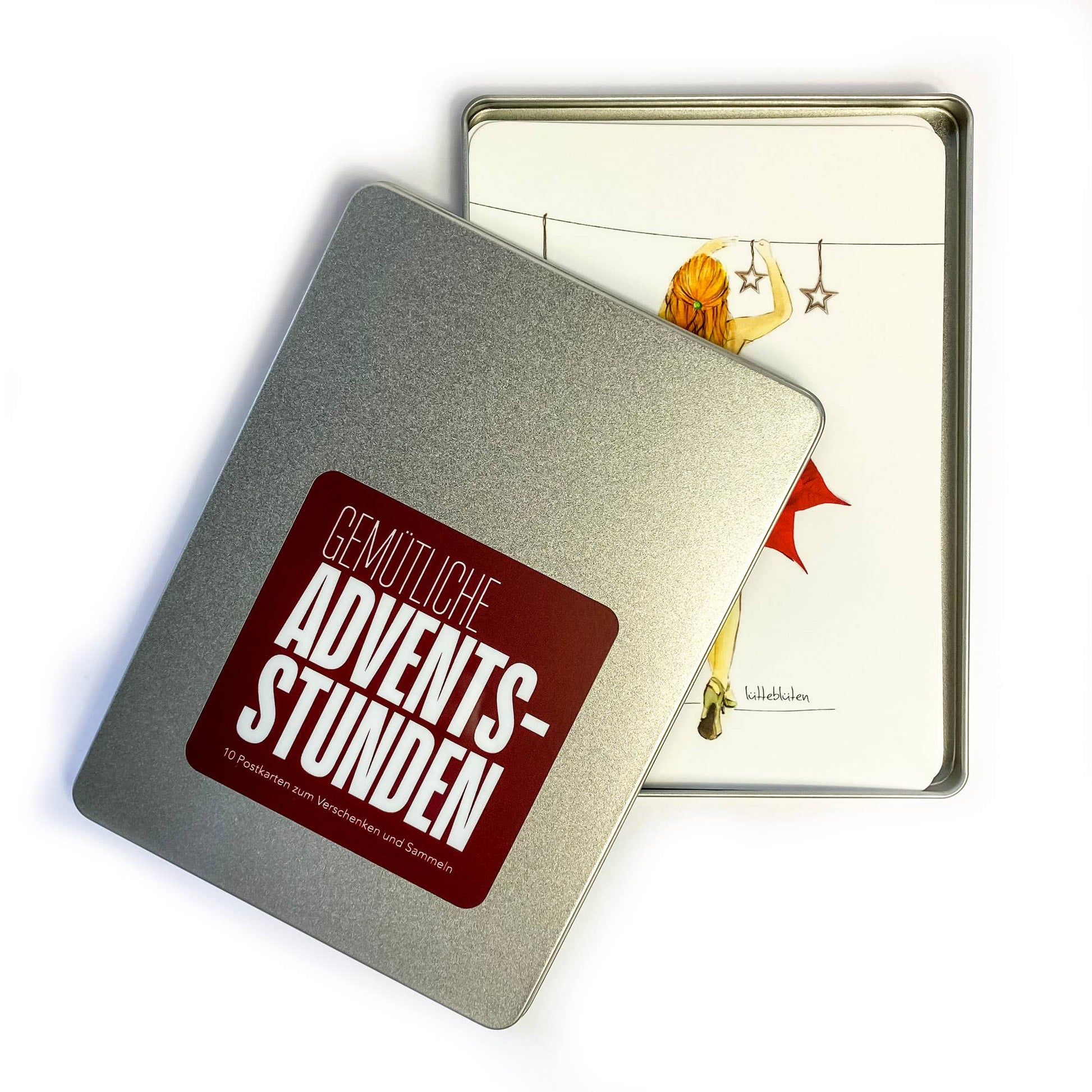 Set of 10 cards with Advent and Christmas motifs to give as a gift or collect in a high-quality metal gift box. 155x115x10mm incl. 10 postcards. Tinplate box, postcards have a paper weight of 350-400 g/m², are robust and durable. The cards have a velvety surface, are laminated on one side, are easy to write on, and have rounded corners.