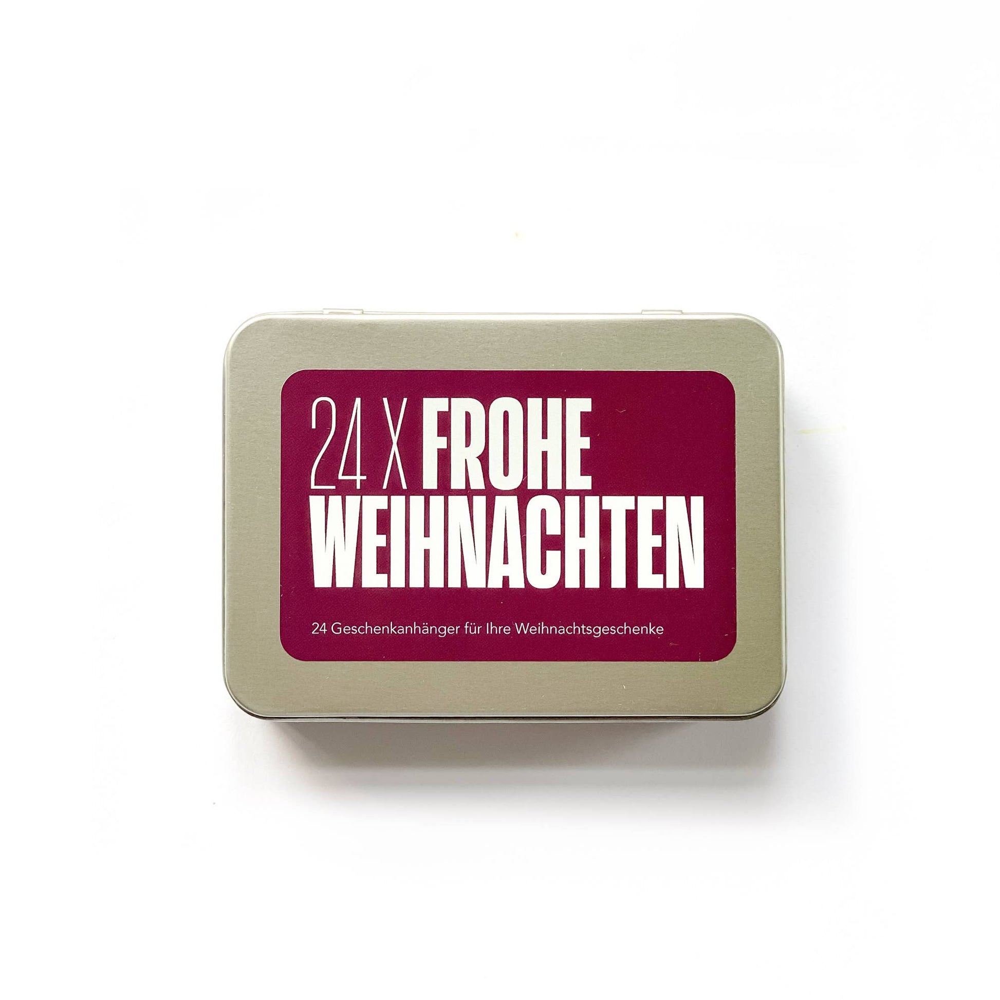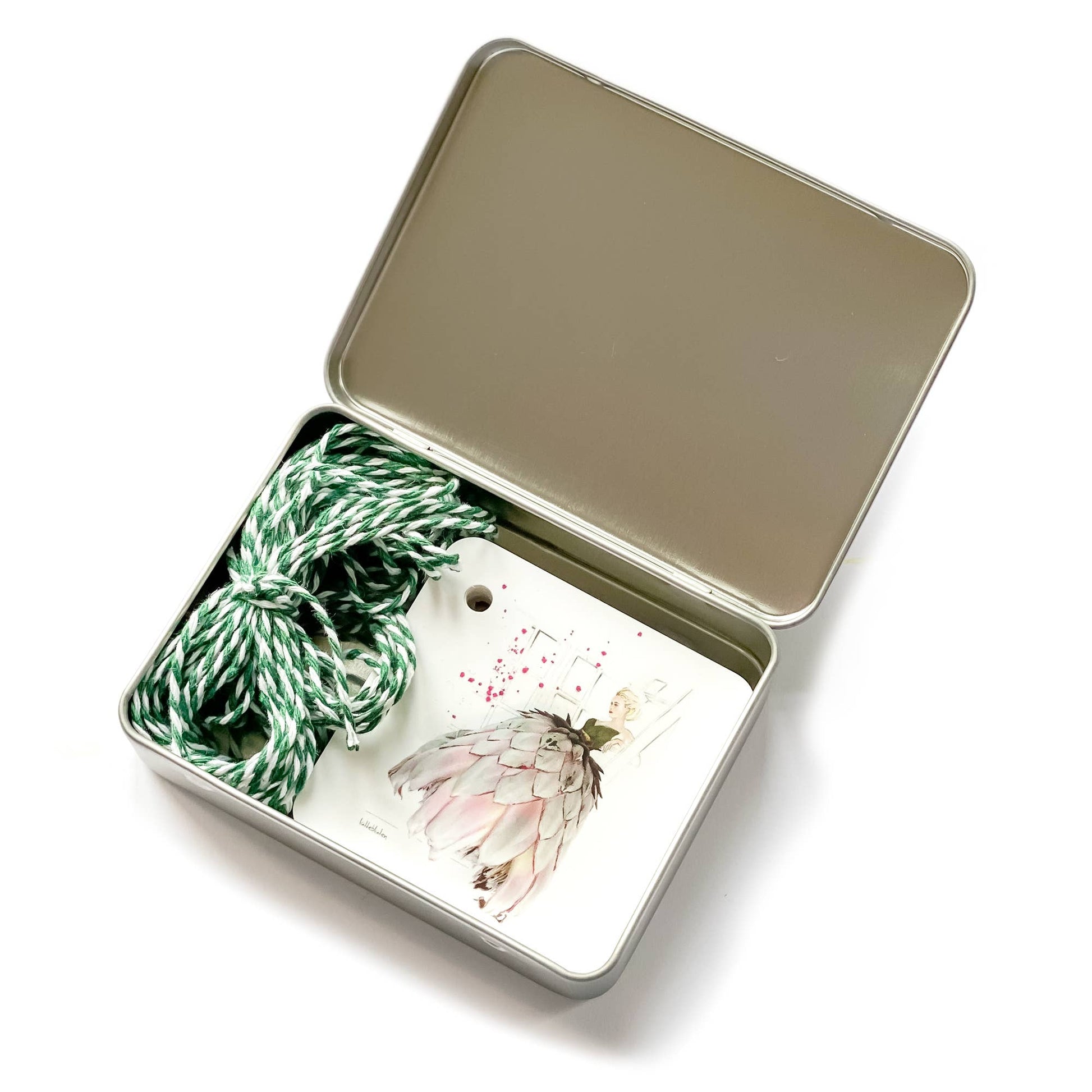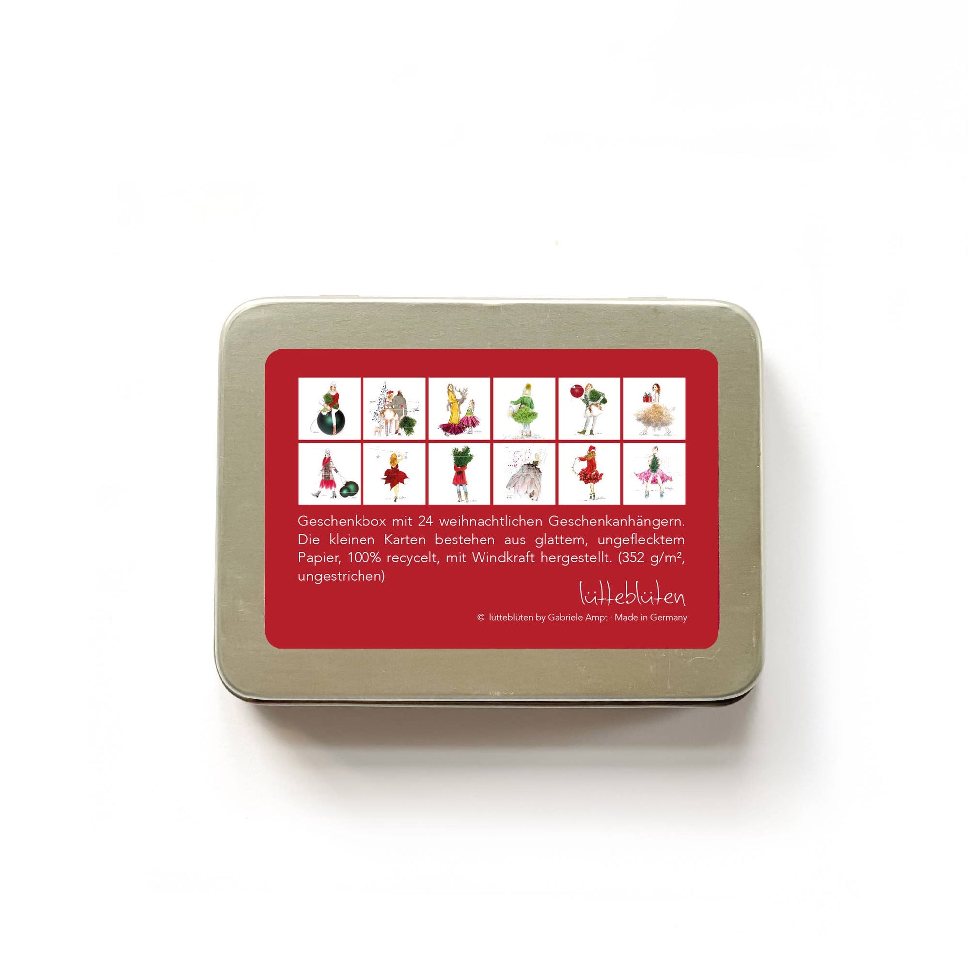 24 small square Christmas cards 65 x 65 mm are available in a box with baker's twine for writing on Christmas gifts or adding a small greeting. The cards have a hole in the top left corner for easy threading. The box contains 12 different designs, two of each. ... so ideal also Advent calendar The cards are 350 g/m² in size and have a matte finish and rounded corners. The rectangular metal box with a lid measures 102 x 75 x 20 mm.