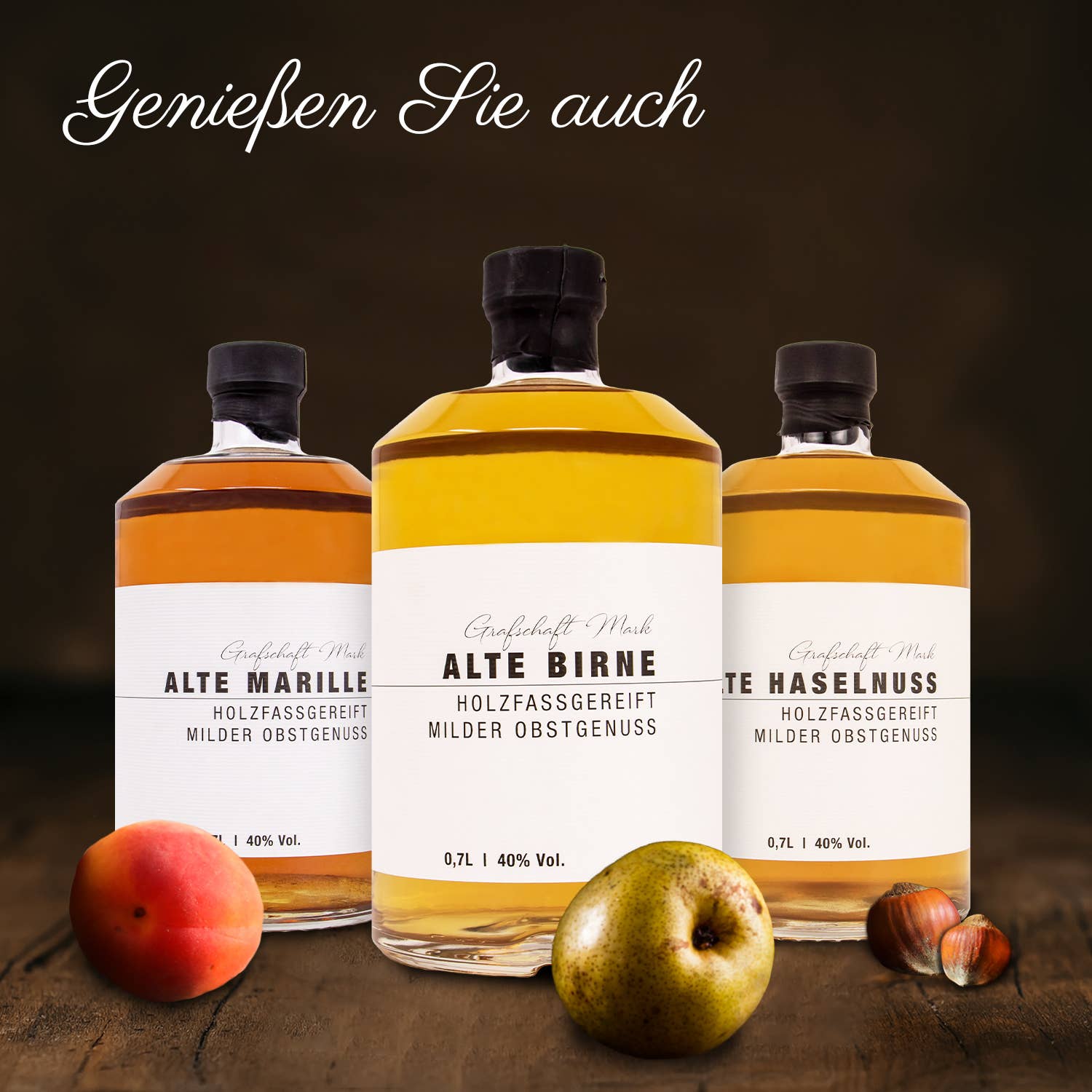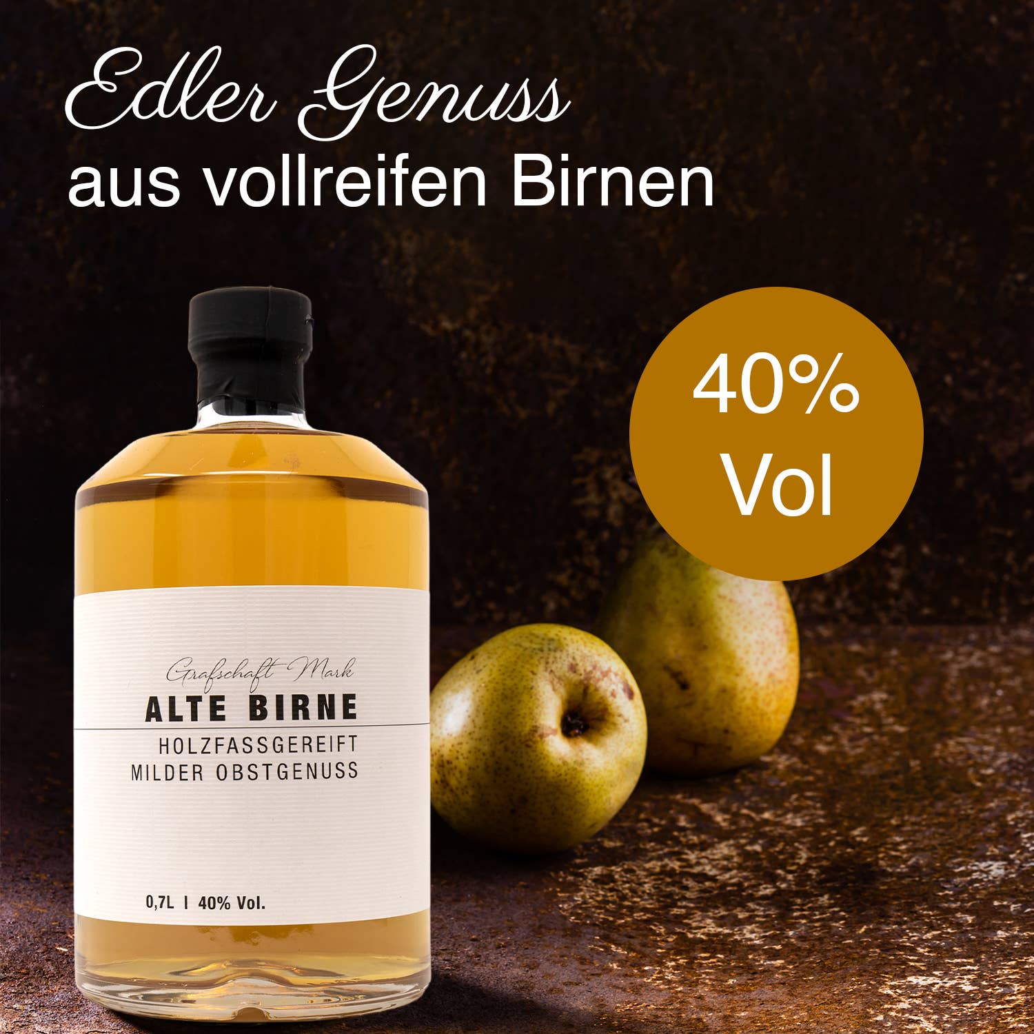 A special kind of schnapps: If you want to offer your guests something different than the classic fruit schnapps, the Grafschaft Mark schnapps in pear flavor is just the right choice. An excellent drink for in between meals, to liven up the mood or as a nightcap after a delicious meal. Only select, regional pears are used, which are then aged in barrels for several months under the best conditions to create a full-bodied pear schnapps. An extremely fine and exceptional fruit brandy that is best enjoyed neat. The Grafschaft Mark Brand welcomes you with a soft mouthfeel and noble pear aroma. Maturation in wooden barrels gives our pear brandy an exceptionally sensual structure and ensures a unique taste experience.