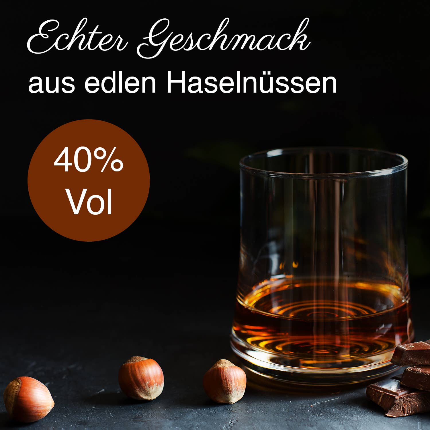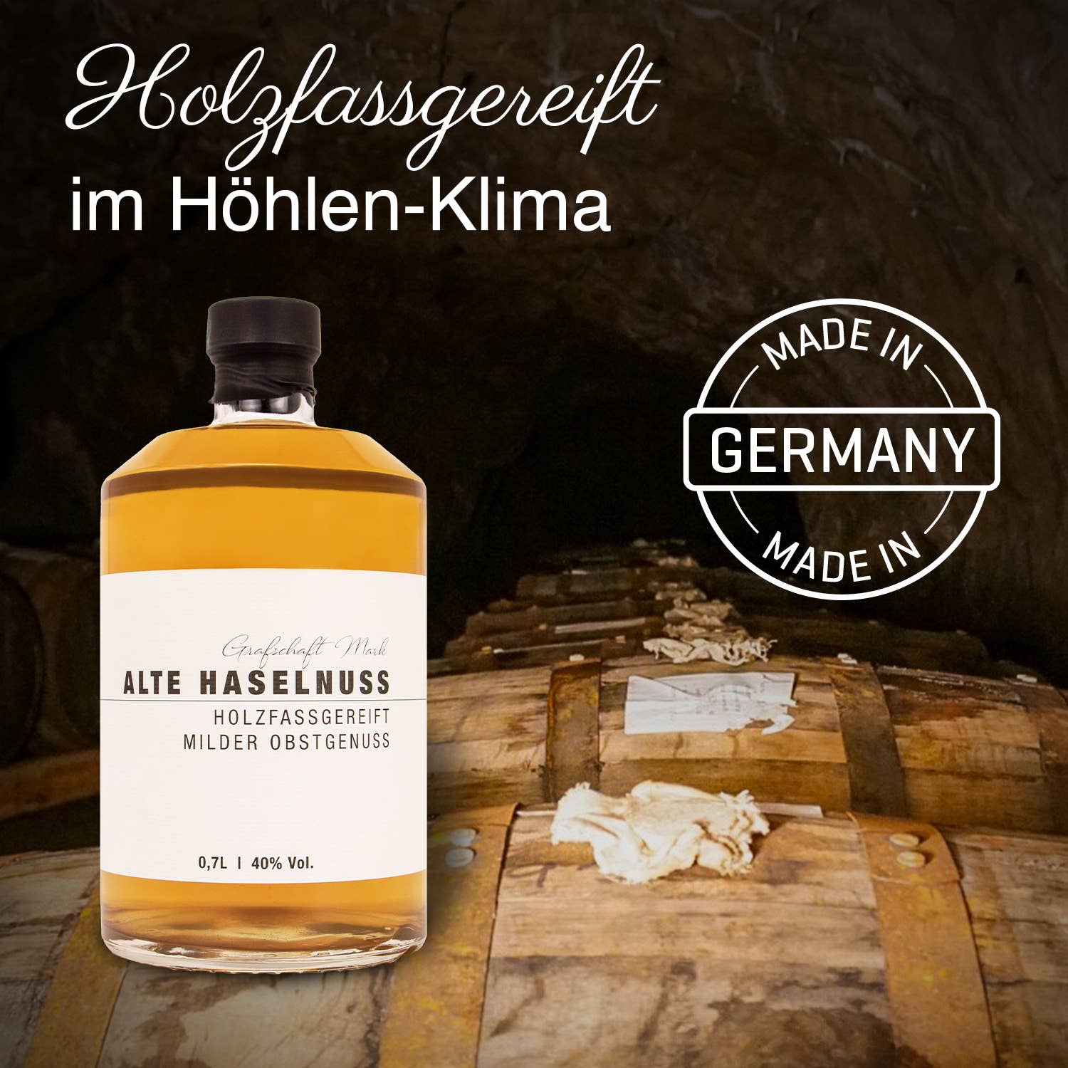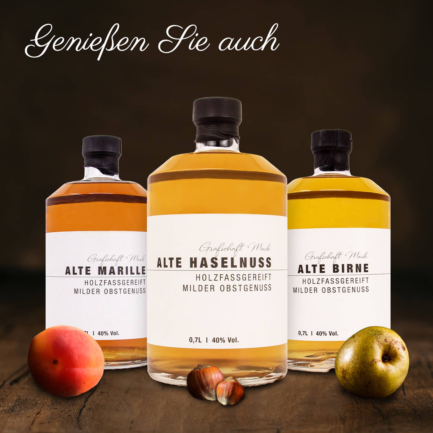 A special kind of schnapps: If you want to offer your guests something different than the classic fruit schnapps, the Grafschaft Mark schnapps in hazelnut flavor is just the right choice. An excellent drink for in between meals, to liven up the mood or as a nightcap after a delicious meal. Only select, regional hazelnuts are used, which are then aged in barrels for several months under the best conditions to create a full-bodied hazelnut schnapps. An extremely fine and exceptional fruit brandy that can be enjoyed neat but is also ideal for refining coffee and ice cream specialties as well as desserts. The Grafschaft Mark Brand welcomes you with a soft mouthfeel and a noble hazelnut aroma, which are captured by honey and delicate chocolate, giving the schnapps an exceptionally sensual structure.