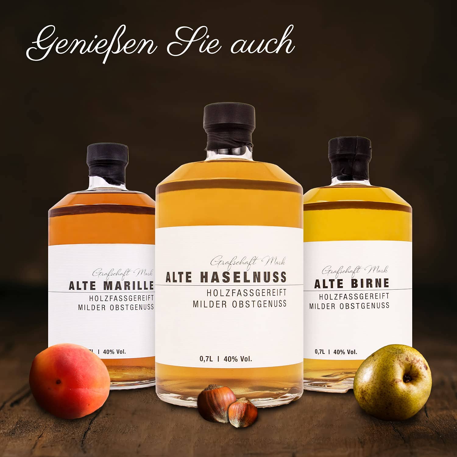 A special kind of schnapps: If you want to offer your guests something different than the classic fruit schnapps, the Grafschaft Mark schnapps in apple flavor is just the right choice. An excellent drink for in between meals, to liven up the mood or as a nightcap after a delicious meal. Only select, regional apples are used, which are then aged for several months in barrels under optimal conditions to create a full-bodied apple brandy. An extremely fine and exceptional fruit brandy that is best enjoyed neat. Like apple liqueur, Obstler Apfel is best enjoyed at a temperature of 16 to 18 °C. The Old Apple is like the nostalgic memory of the apple compote from Grandma's cellar. Every summer, only the best fruits were preserved, filled into thick-walled jars and vacuum-sealed with a red rubber ring under the lid.