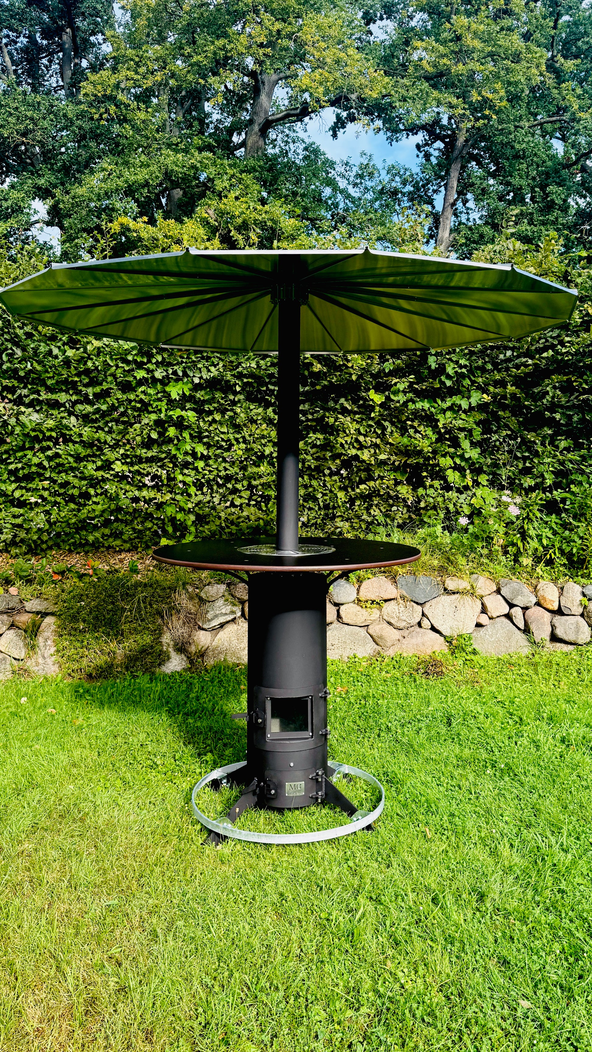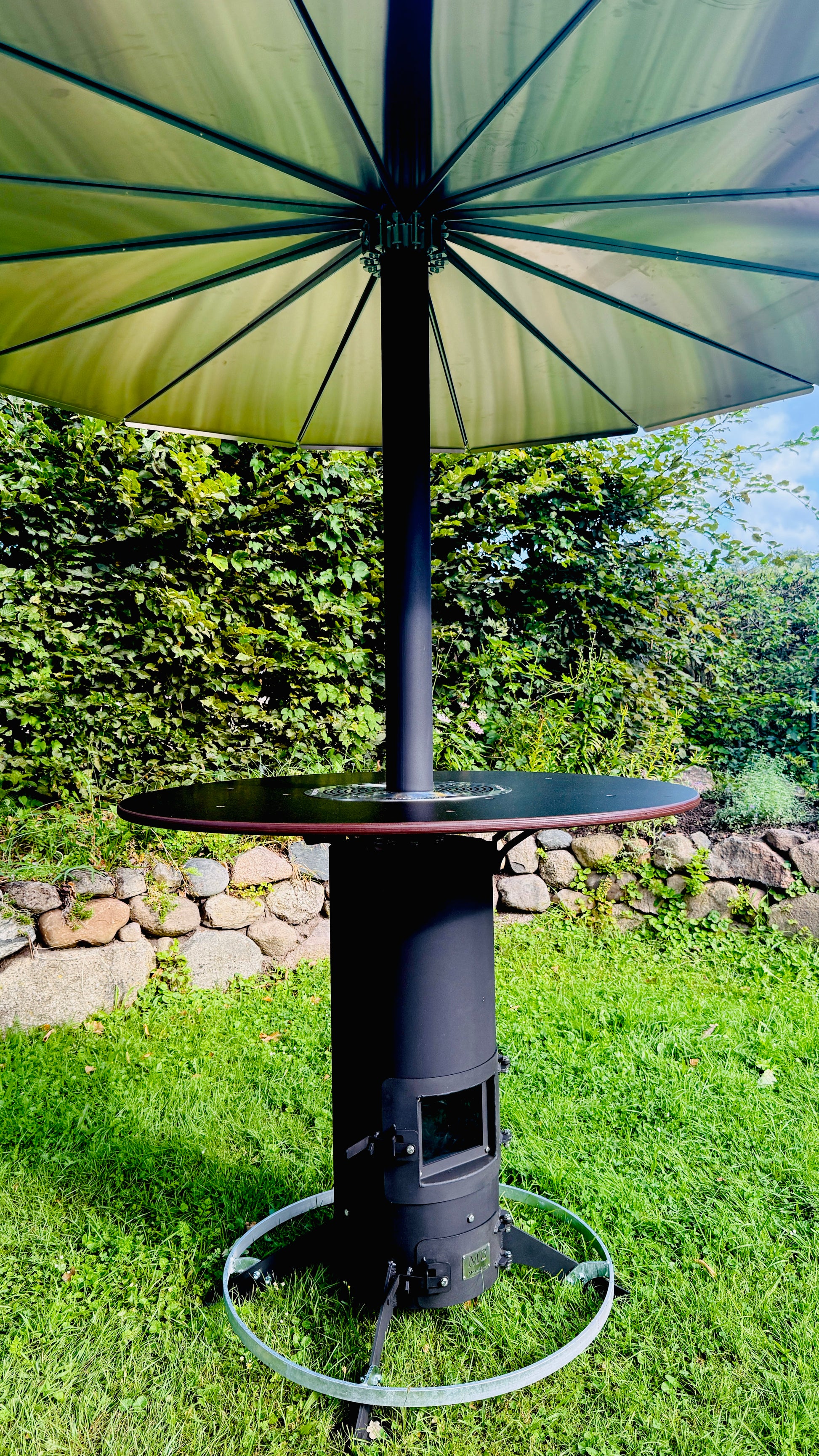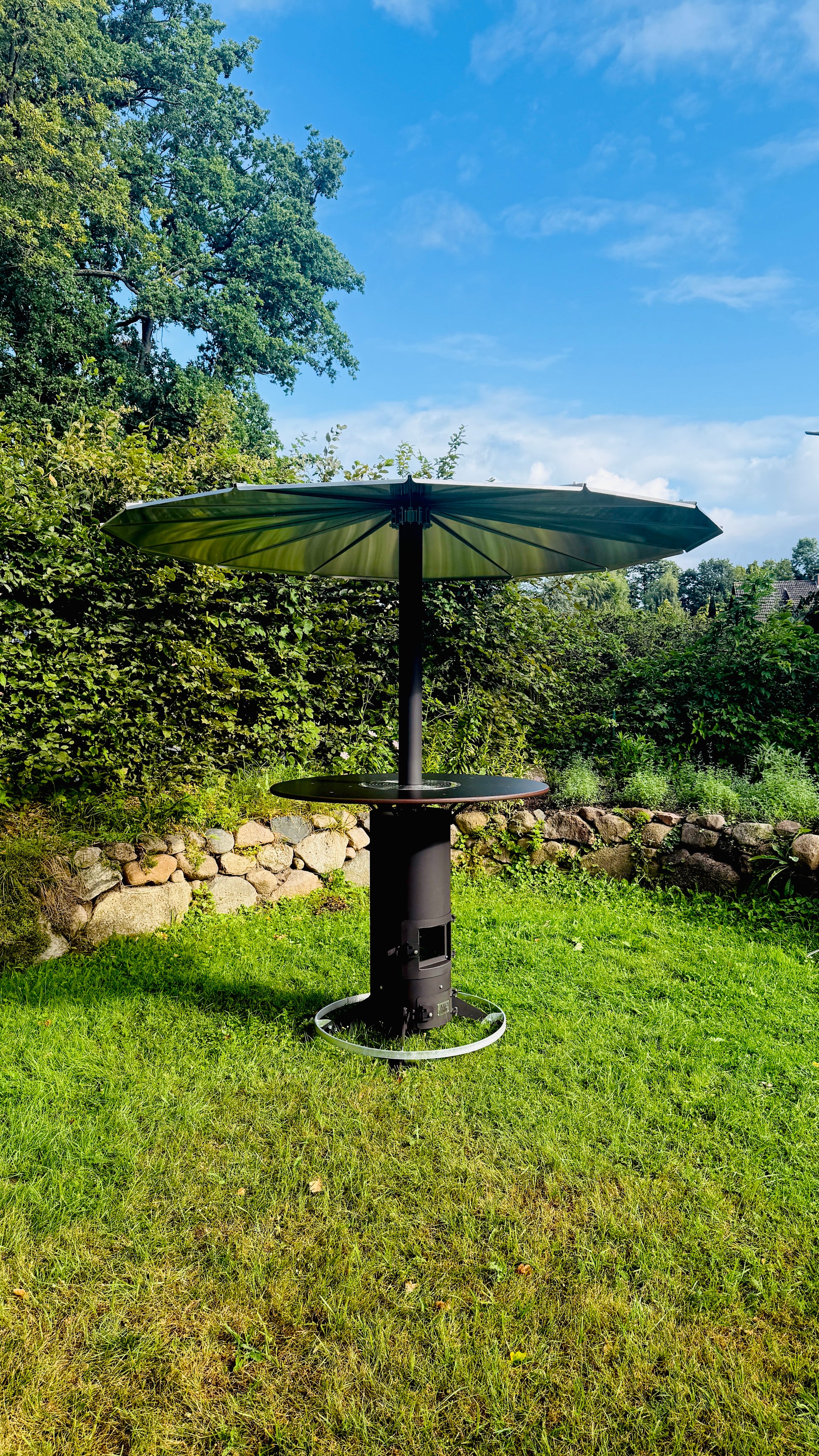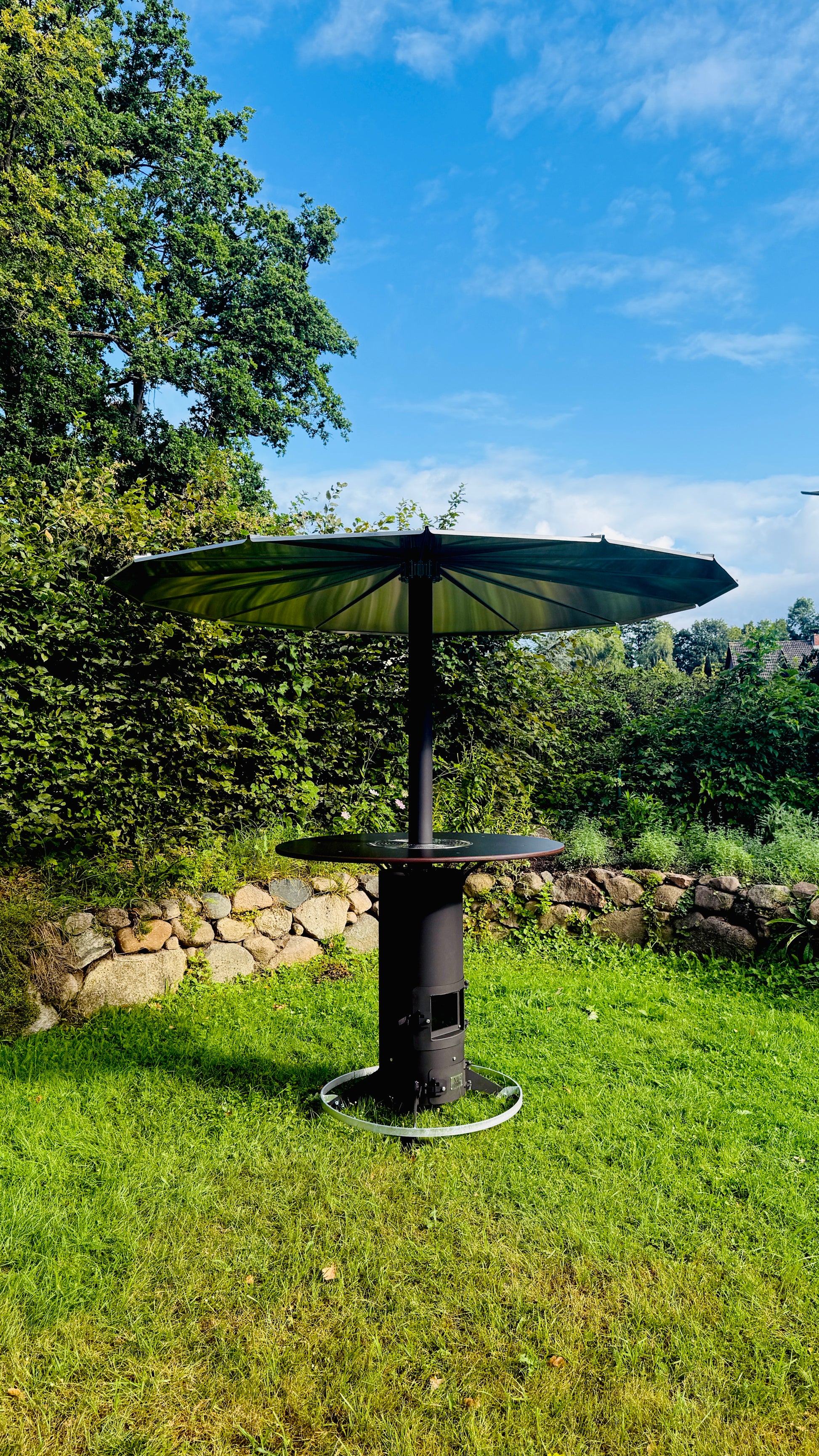 Heated outdoor bar table “Herrmann” with integrated vertical oven.