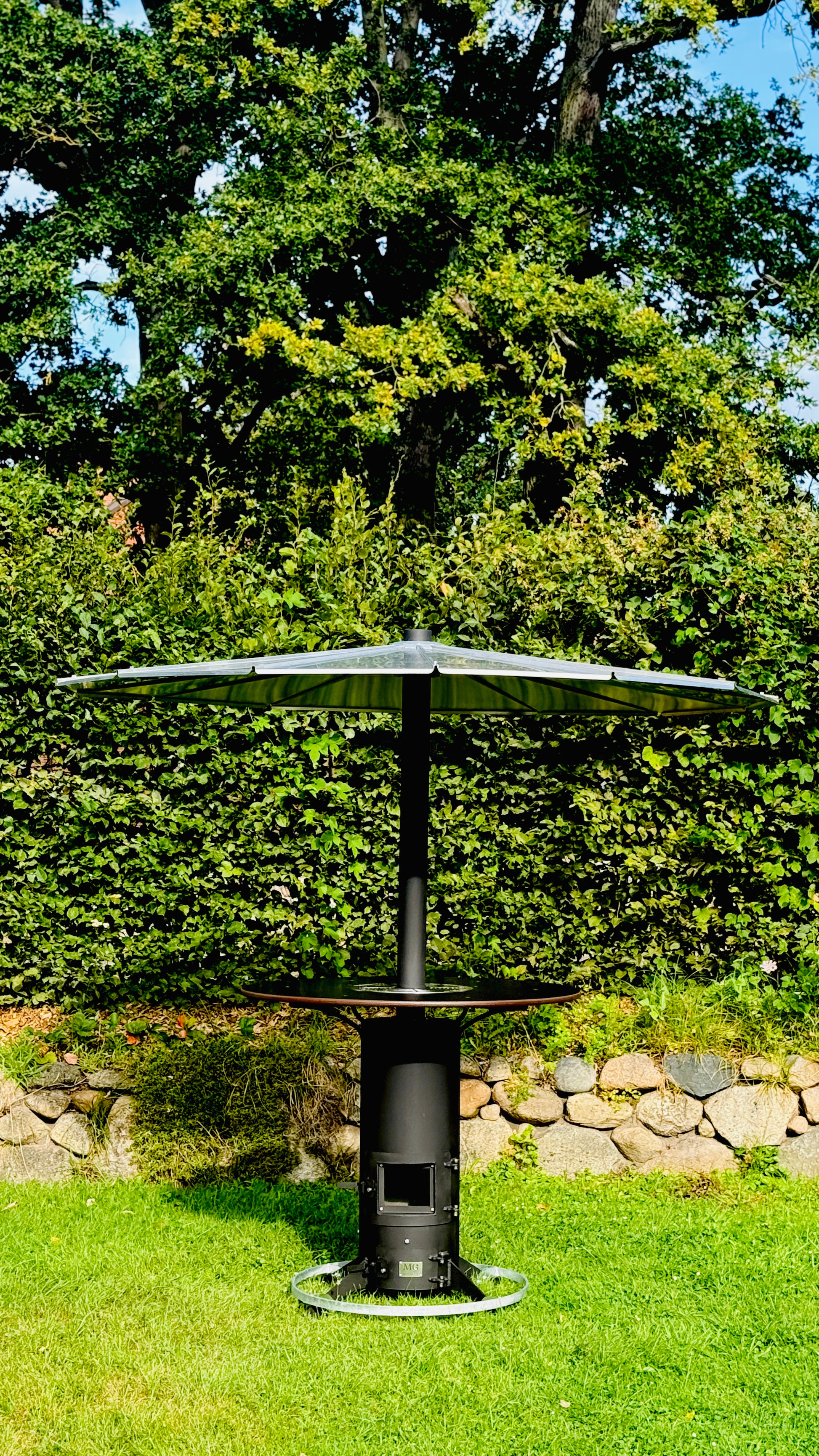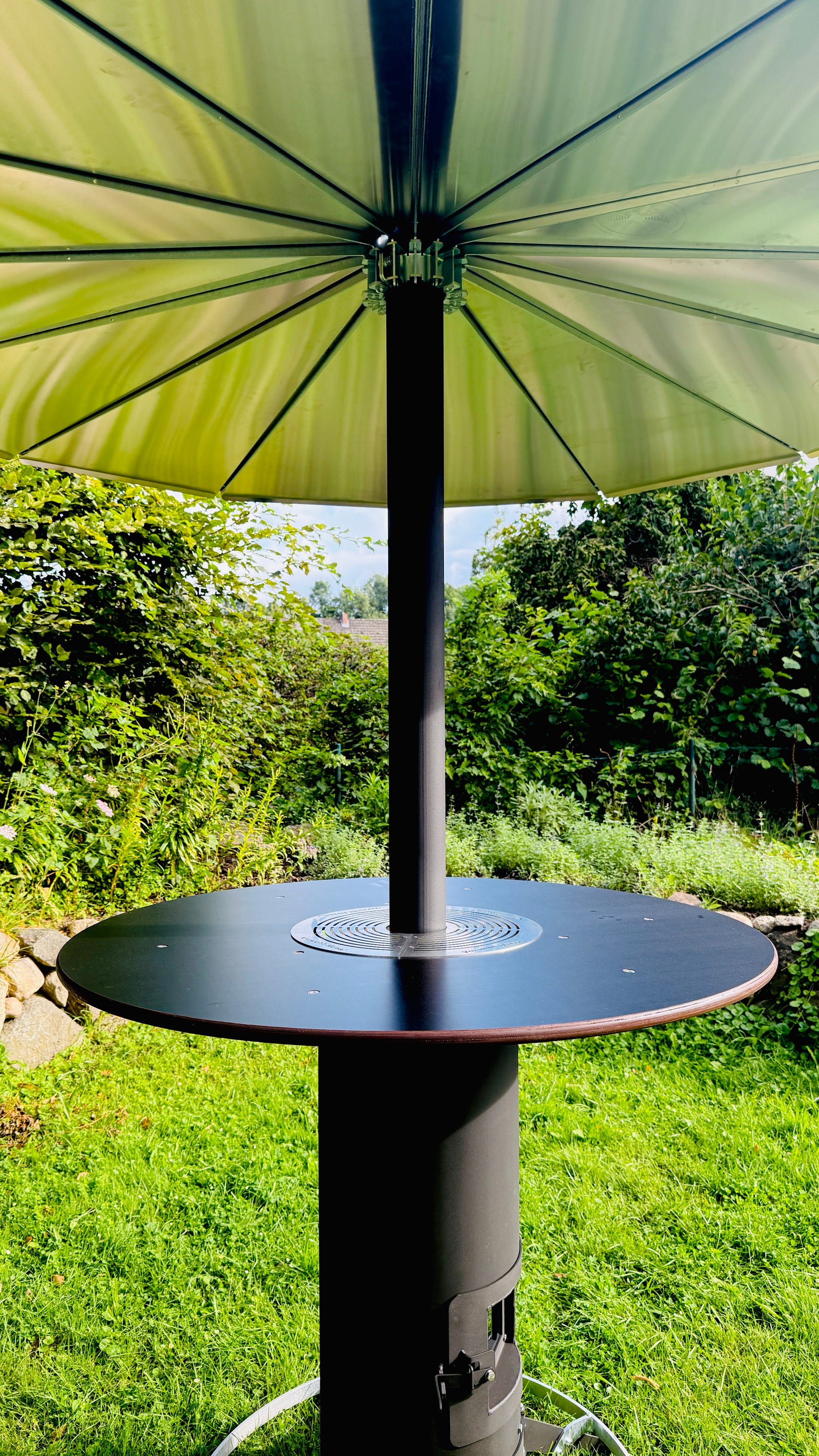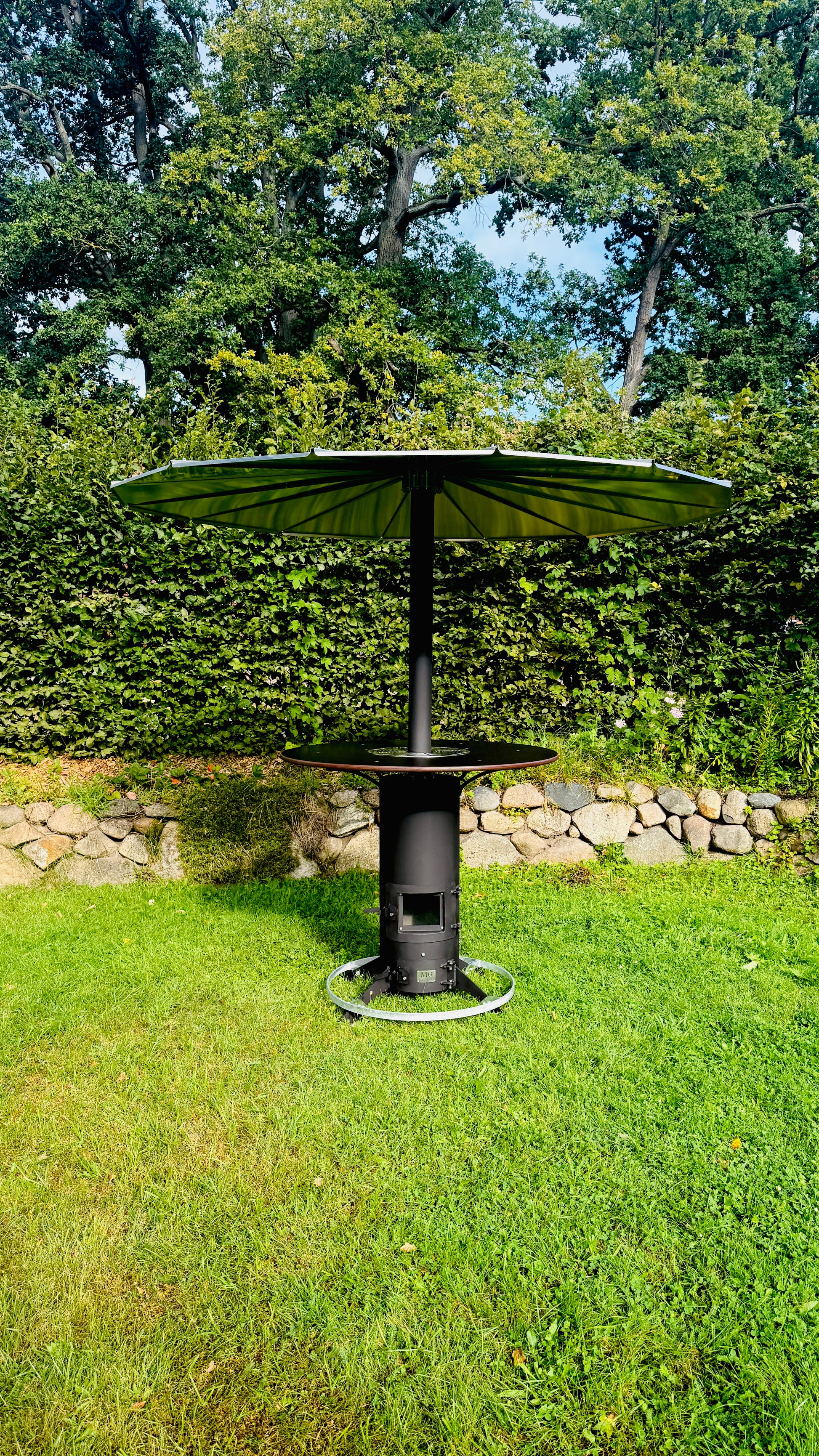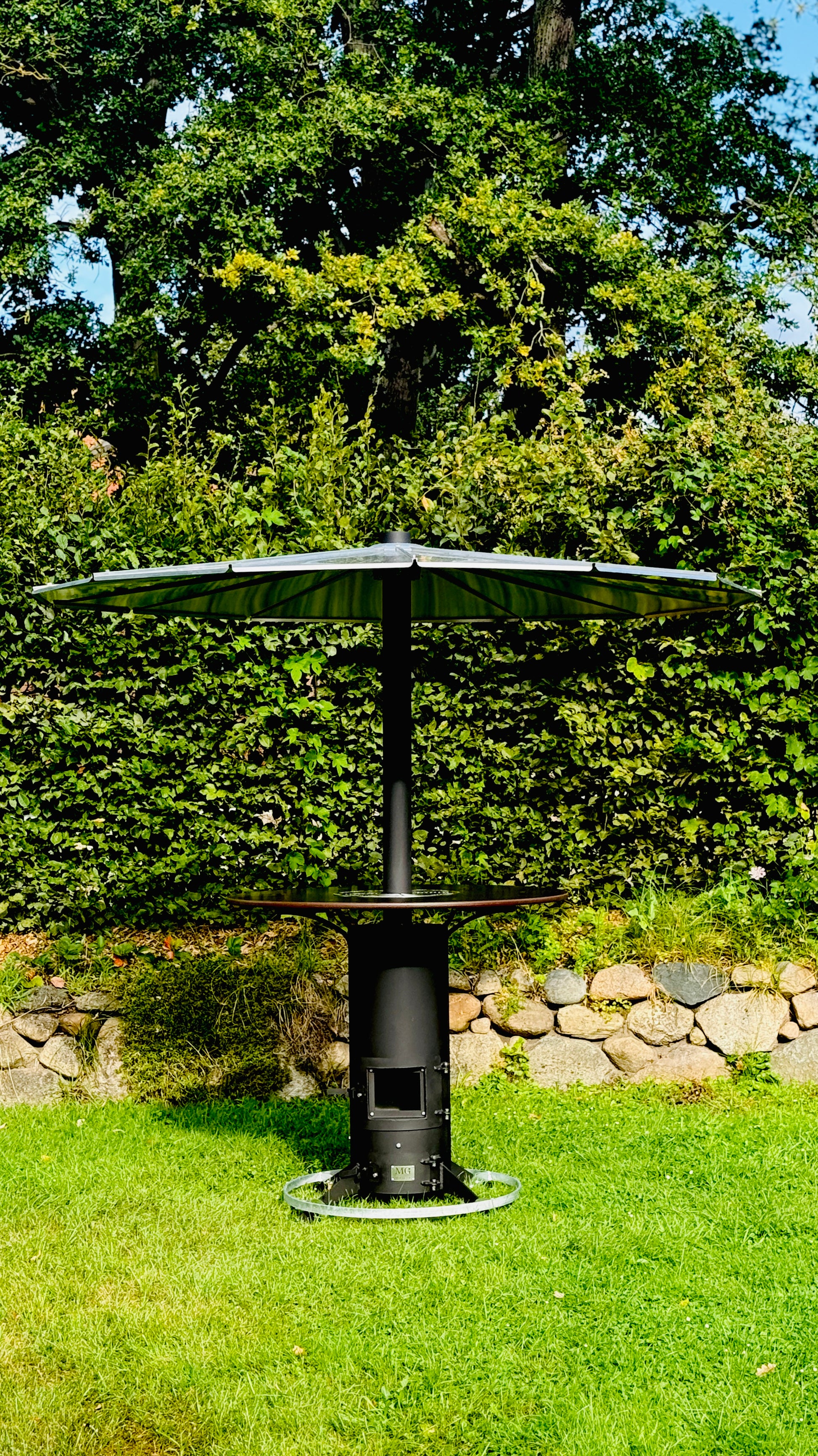 Heated outdoor bar table “Herrmann” with integrated vertical oven.