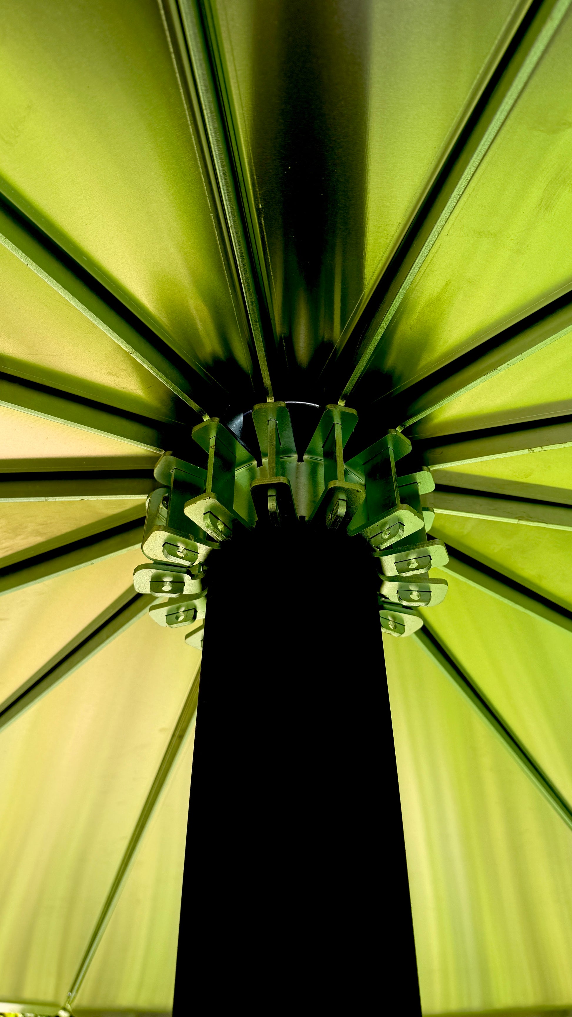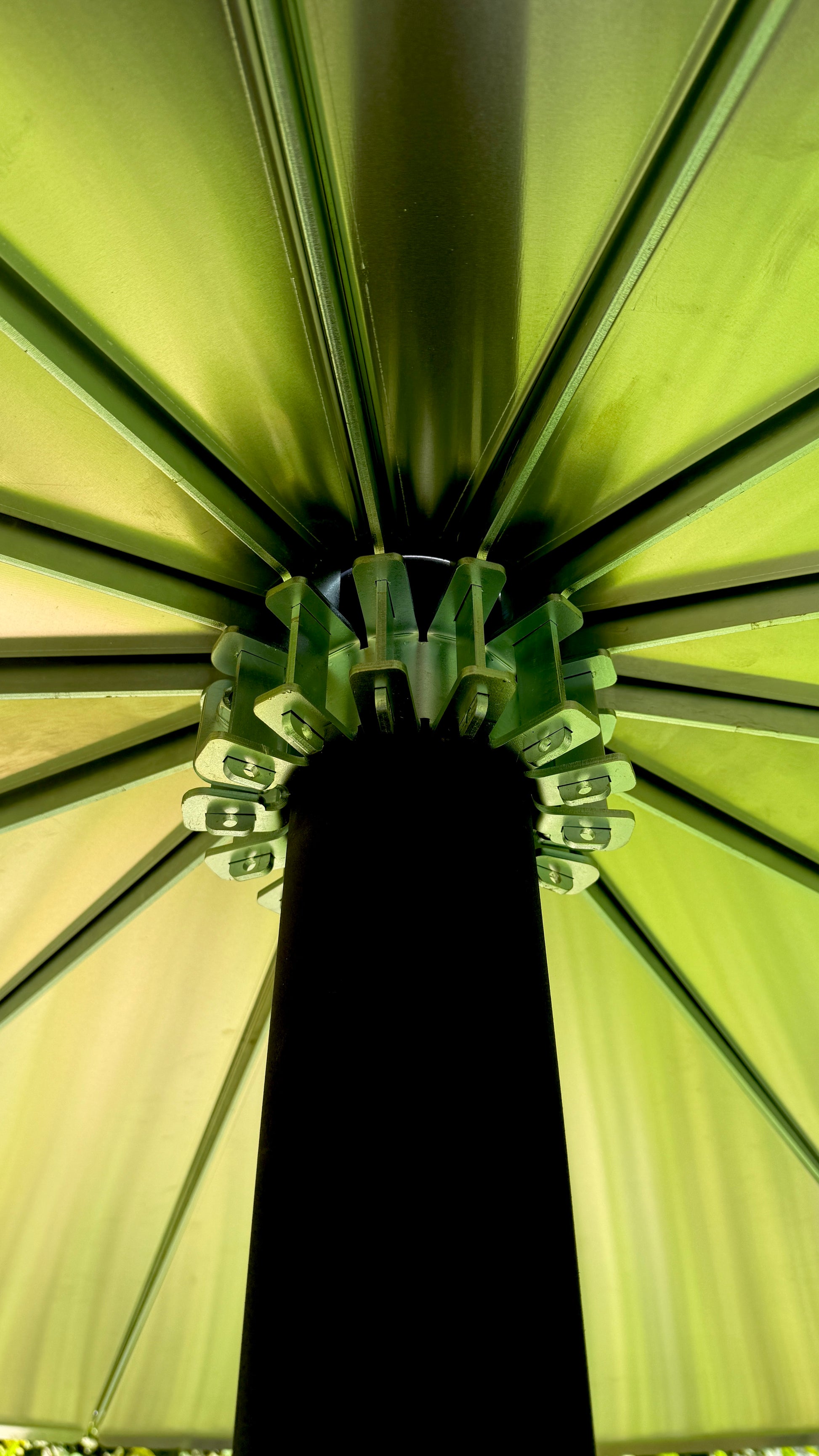 Optionally with roof construction, consisting of a clamp for the stove pipe, into which 14 brackets are inserted to hold 14 metal plate segments.