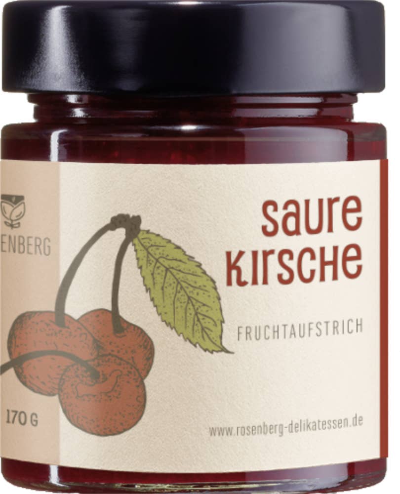 The sour cherry spread , sourced from Biofrucht Senst in Landsberg, has a balanced fruity-tart flavor and contains many small pieces of fruit. This spread is a popular classic among fruit spreads.