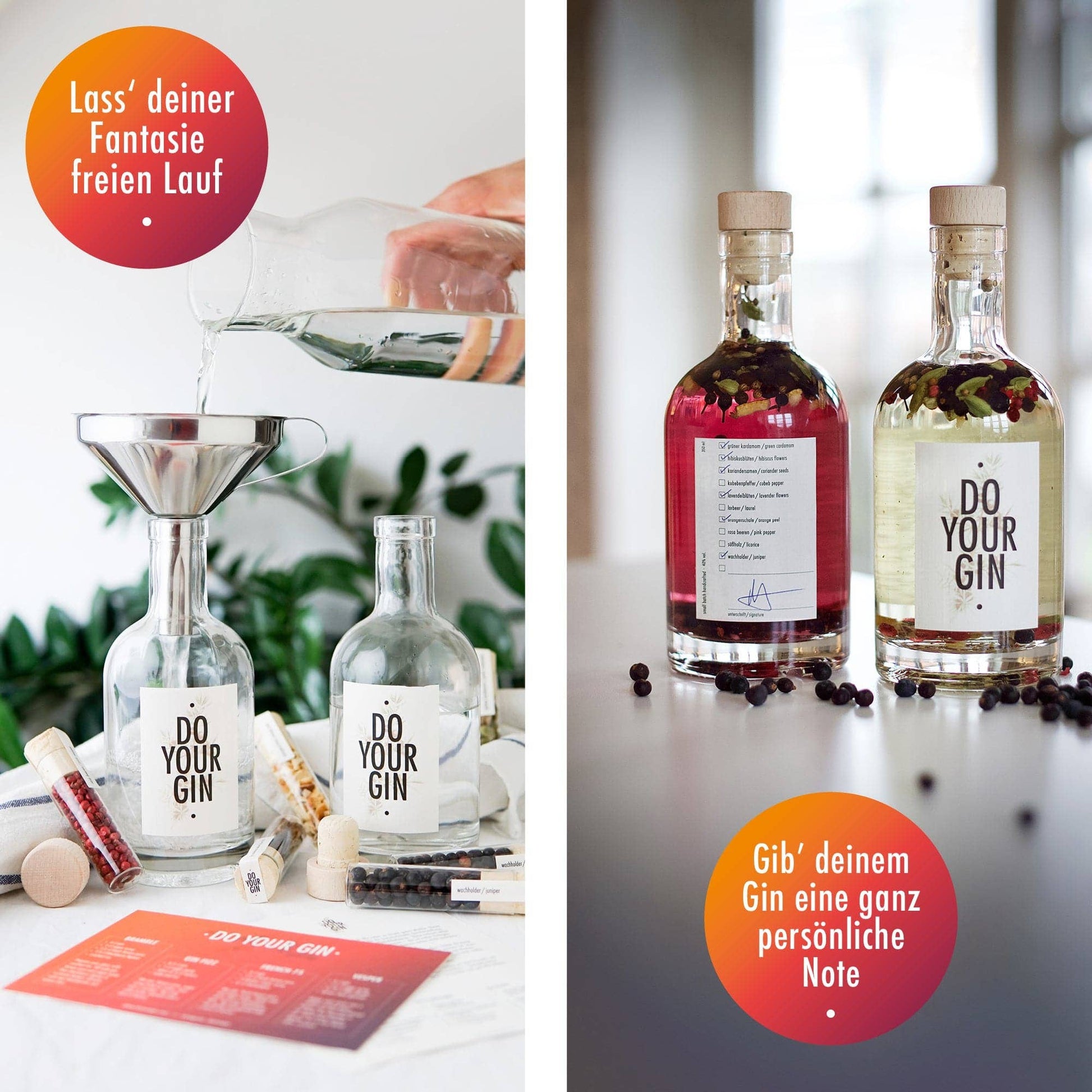 Gin tastes great! And the best part is with our high-quality DIY kit! With these ten exquisite spices, theoretically up to 370 million different flavors are possible. You won't find such an exceptional taste experience in any industrially produced gin. With the help of our kit, premium spices, and your favorite alcohol as a base, you can create your very own gin, tailored to your taste. Enjoy! * High-quality ingredients * Vegan, gluten-free and without additives * 100% recyclable materials * Made in Europe and CO2 neutral * Plastic-free * Handmade in Europe Contents * 10 x spices in twelve glass tubes (juniper berries x 3, coriander seeds, liquorice root, cubic pepper, hibiscus, rose pepper, orange peel, bay leaves, green cardamom, English lavender) * 2 x empty bottles with Do Your Gin label * 1 x funnel * 3 x recipe ideas Start your personal gin with a neutral alcohol.