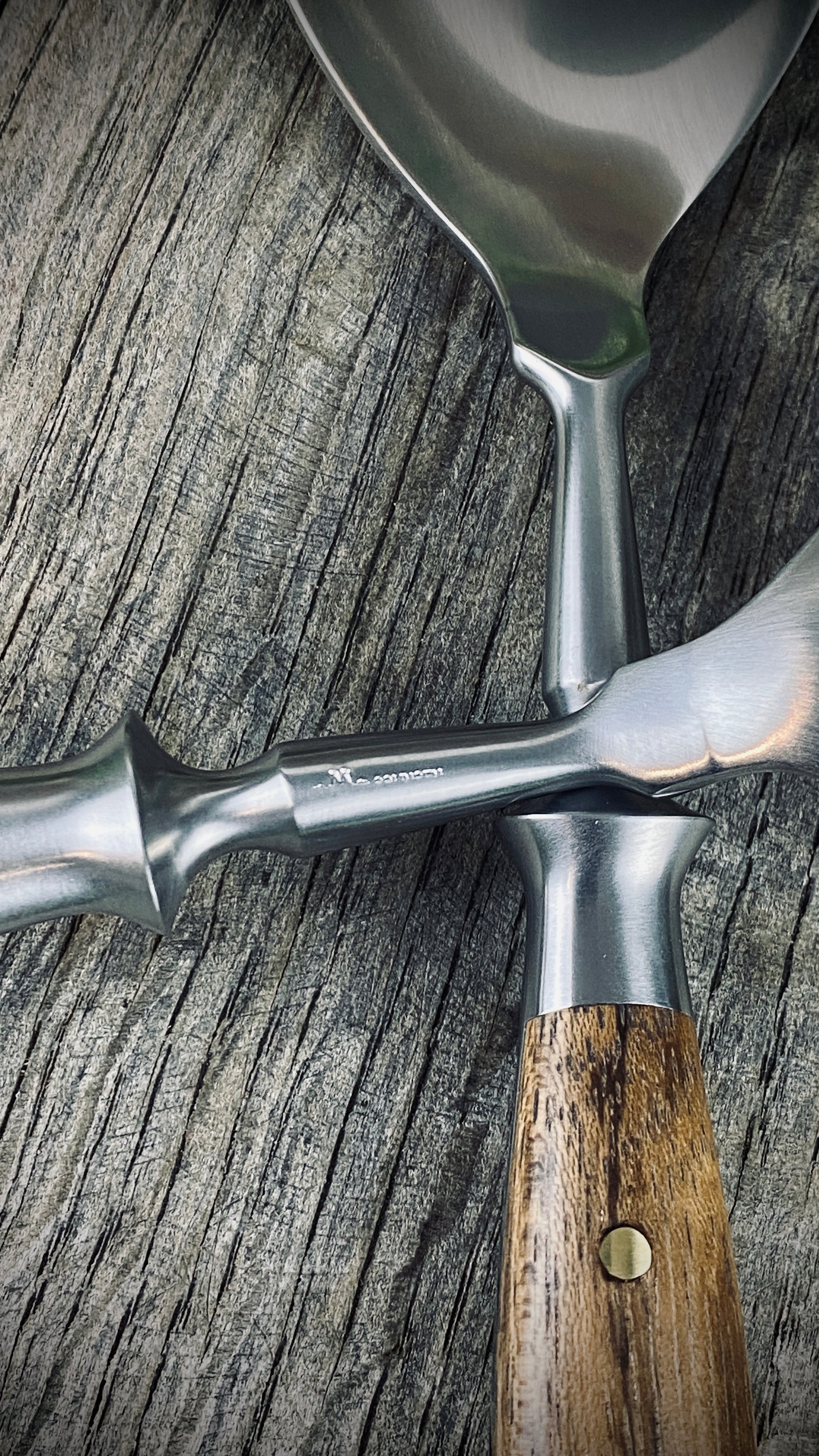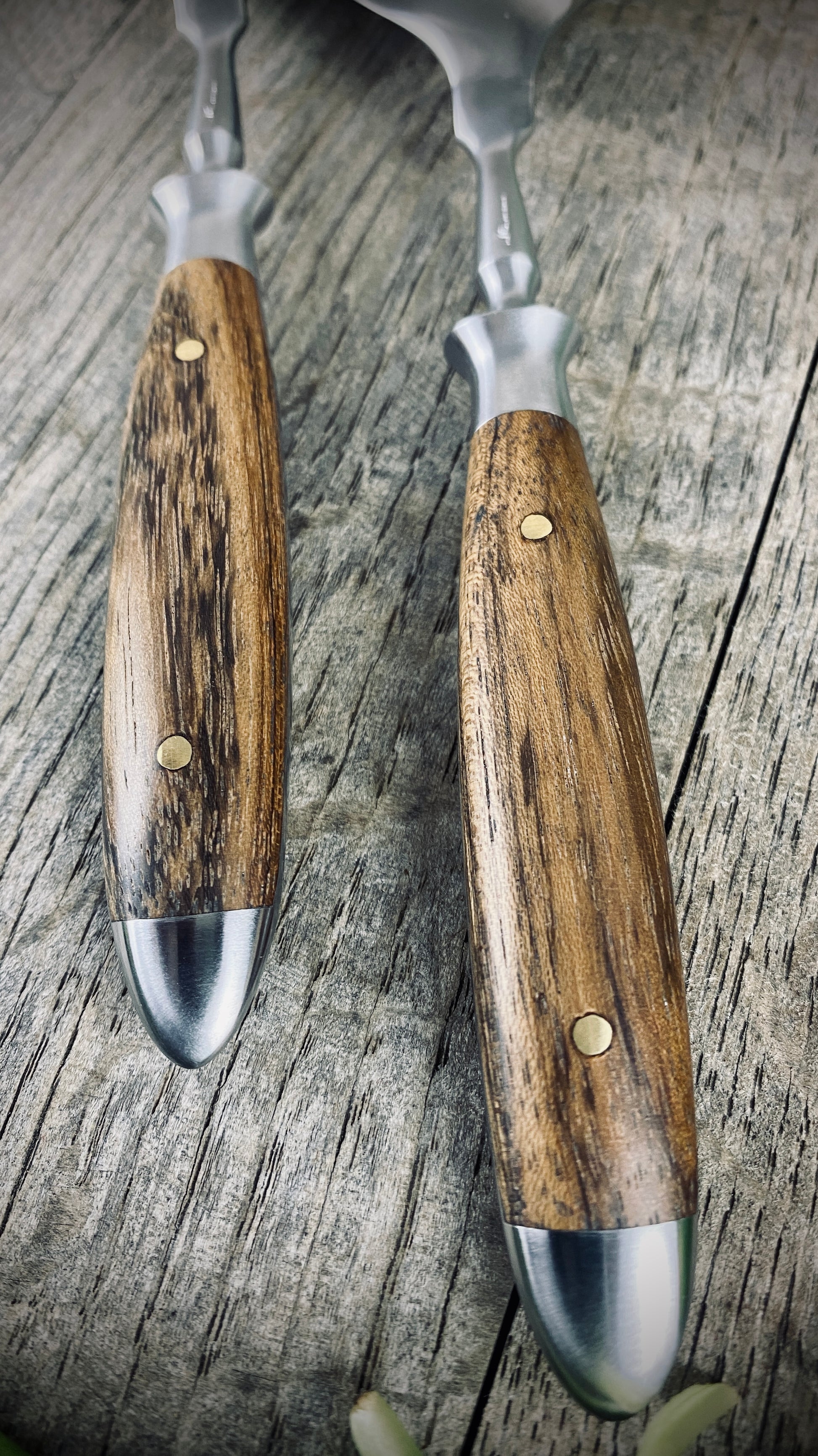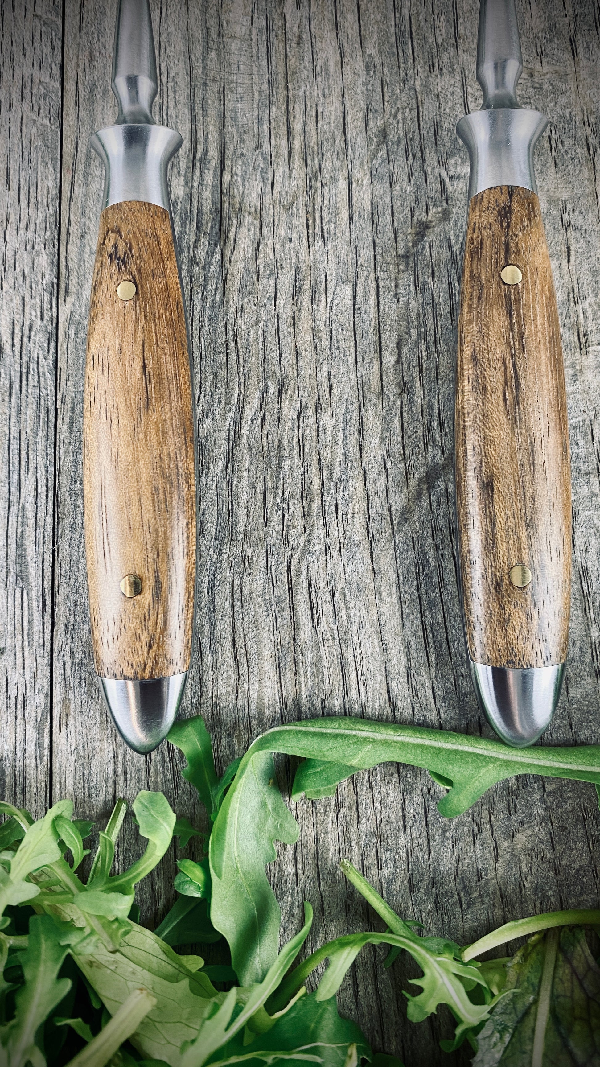 Immerse yourself in the timeless elegance of Eichenlaub's handcrafted salad servers. Featuring genuine oak handles double-riveted, this unique cutlery set adds a traditional charm to your table setting. Each piece is crafted by skilled artisans with attention to detail to ensure the highest quality. Eichenlaub uses over 120 production steps before it can beautify your table. The clean design of the Backen cutlery—steel-framed handles with two small rivets—was first introduced into series production in 1910 by August Merten, the founder of the Eichenlaub brand.