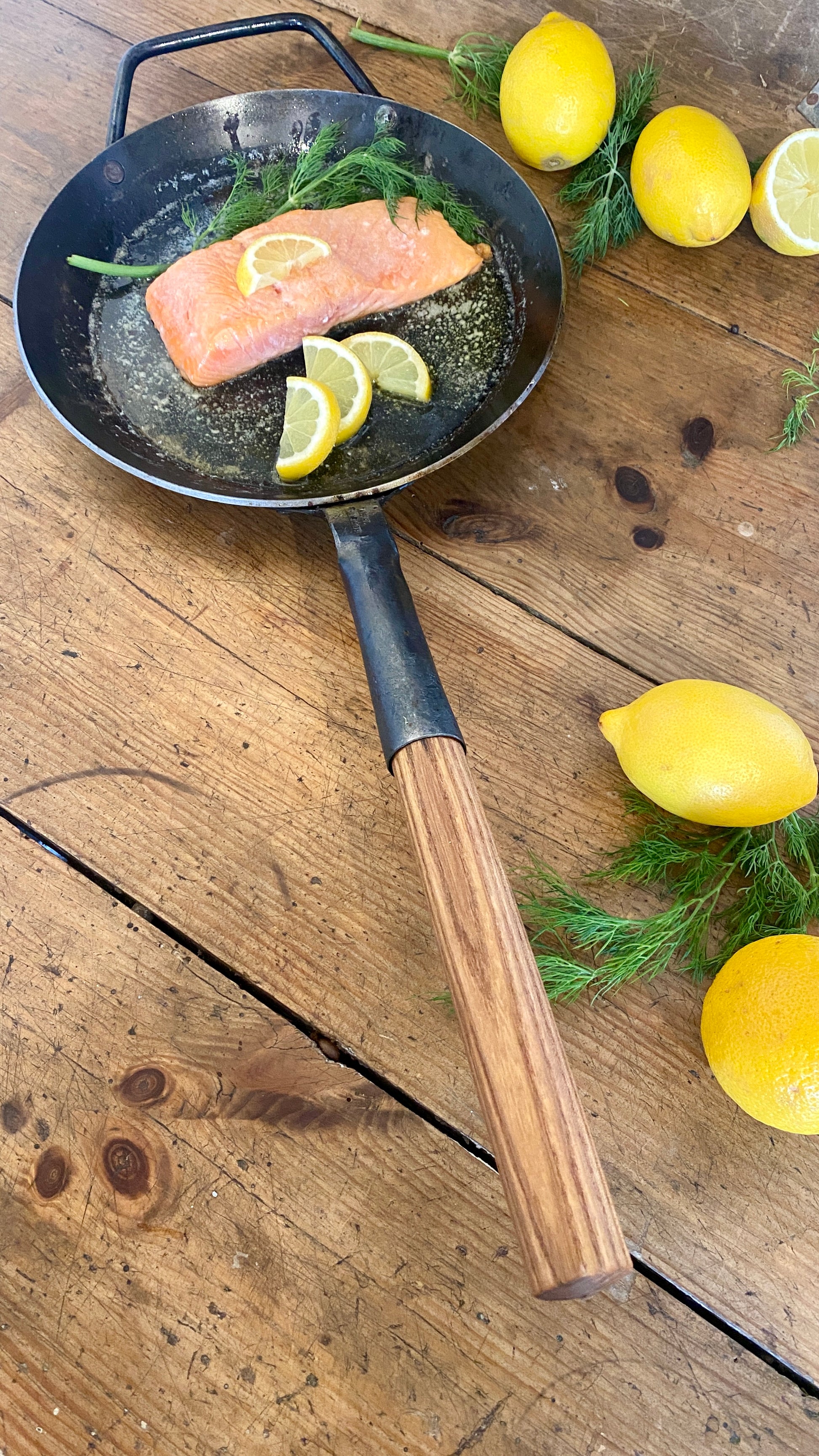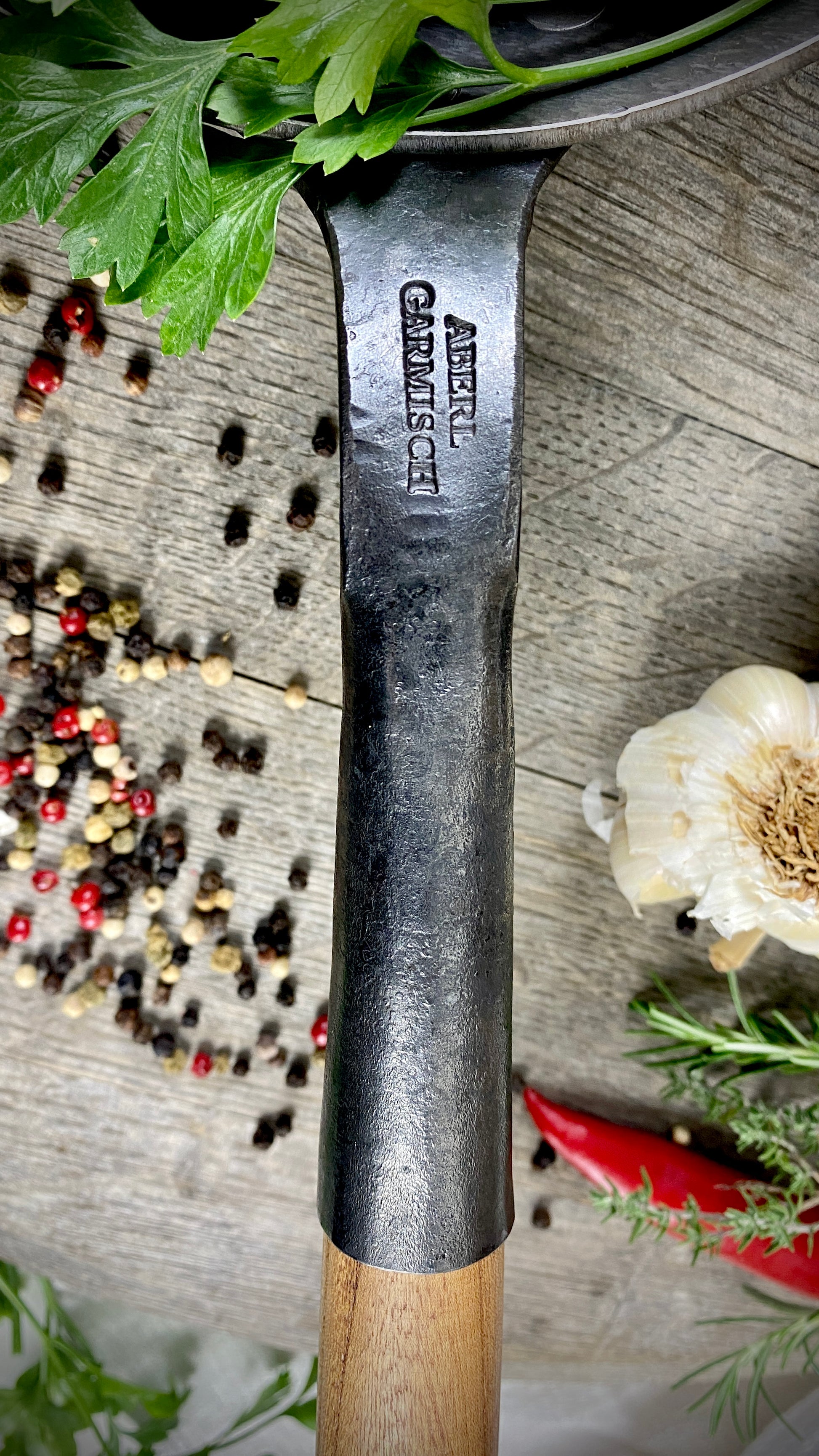 The centerpiece of the range: pans made of 3 mm thick wrought iron, with or without wooden handles, optionally with a hooked handle or two handles. They are completely uncoated, have a natural scale layer, and – unlike other iron pans – do not require seasoning. This means they're ready for use right away and offer an authentic frying experience from the very first moment.