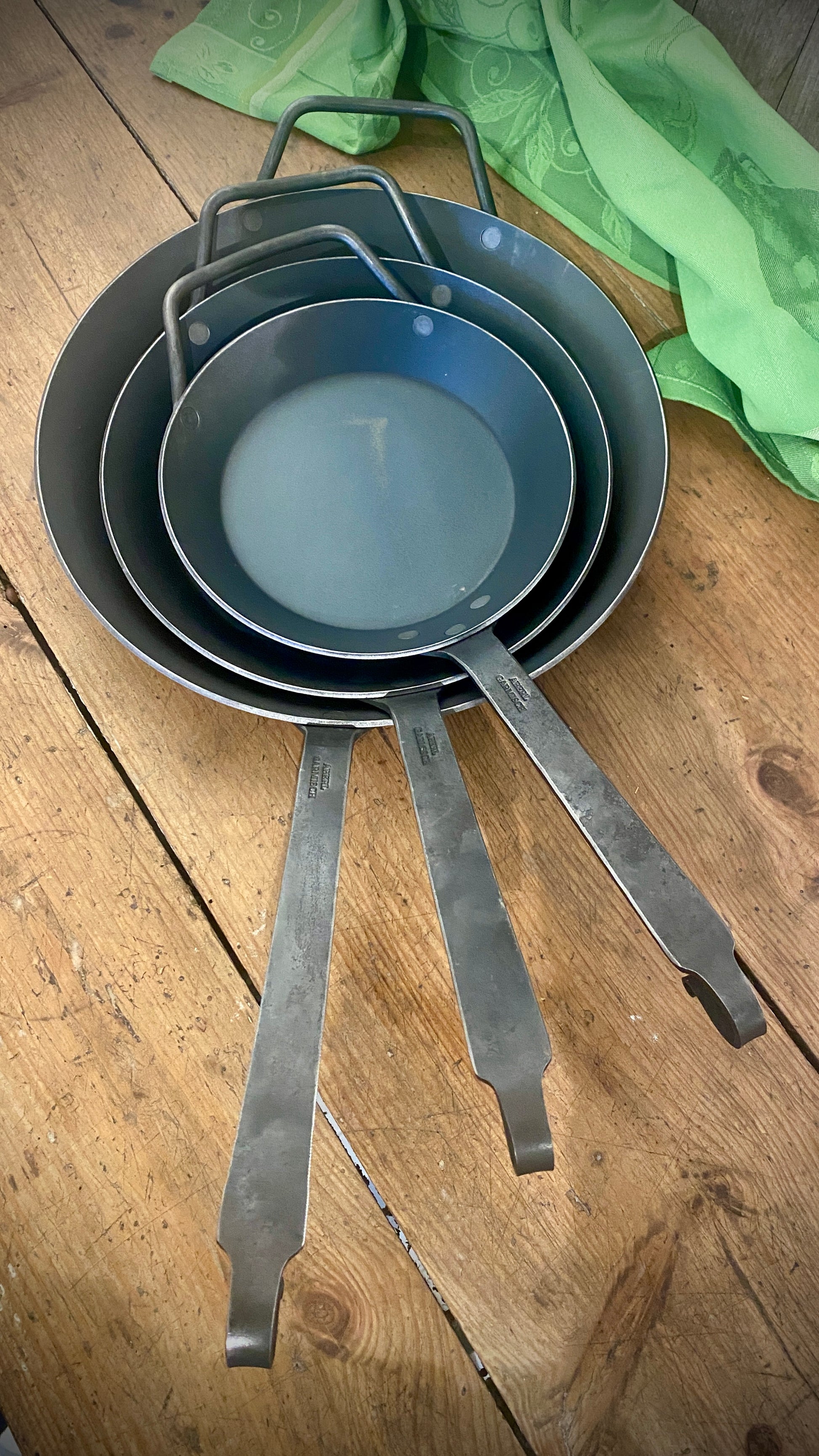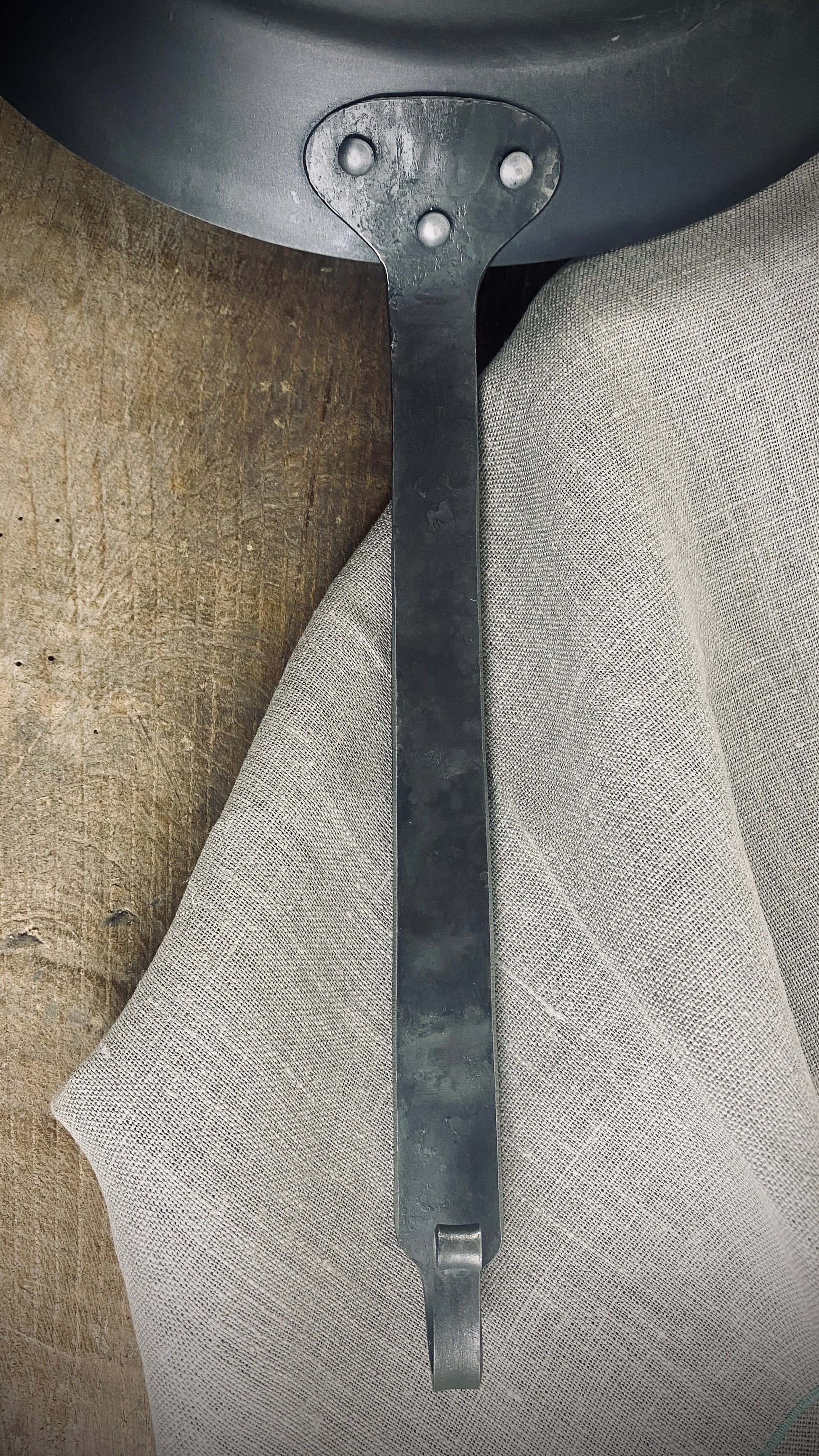The counter handle and the forged hook handle not only give the pans a rustic charm, but also offer a comfortable and secure grip.