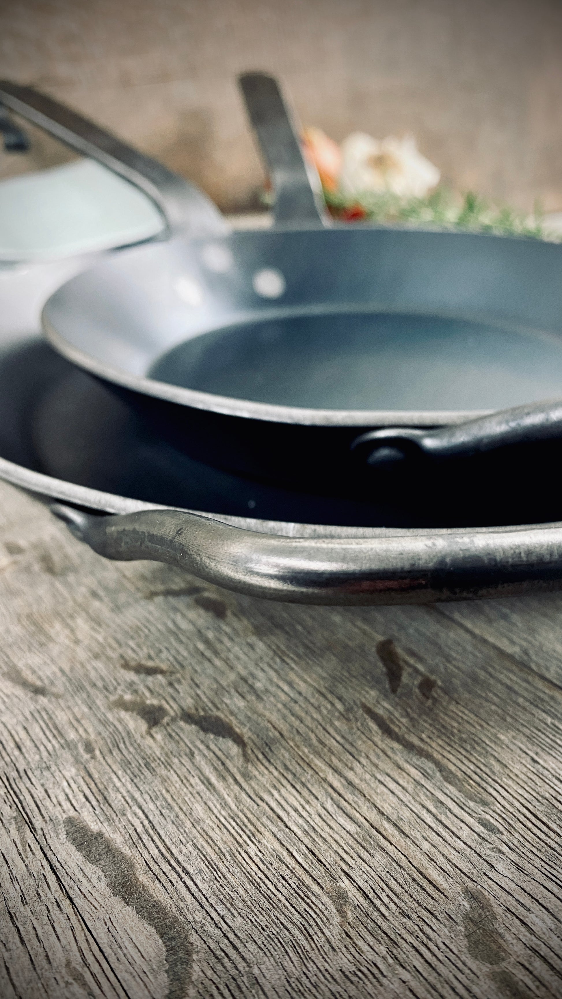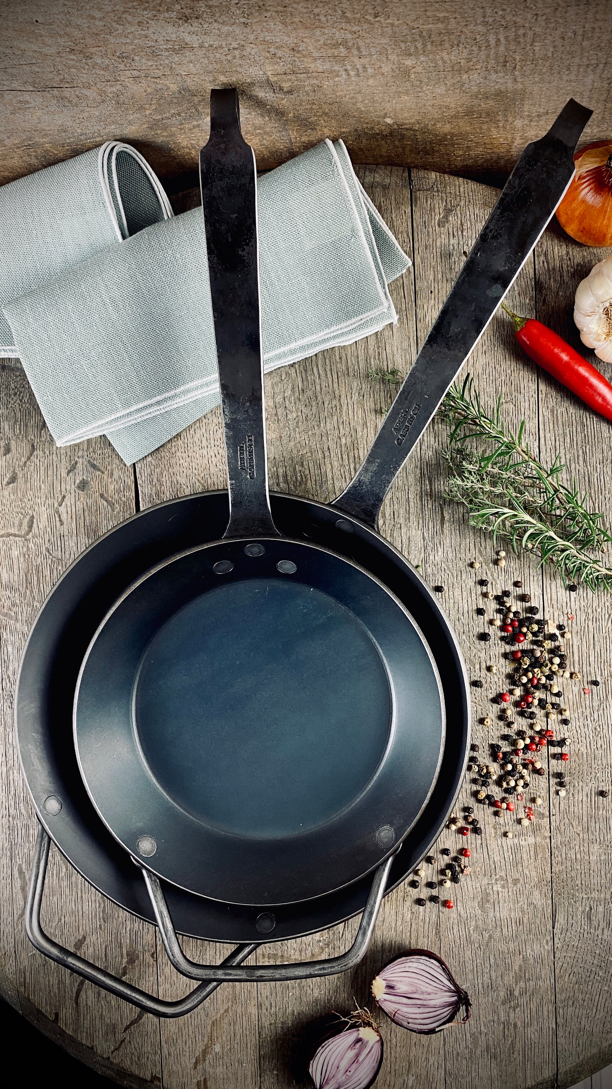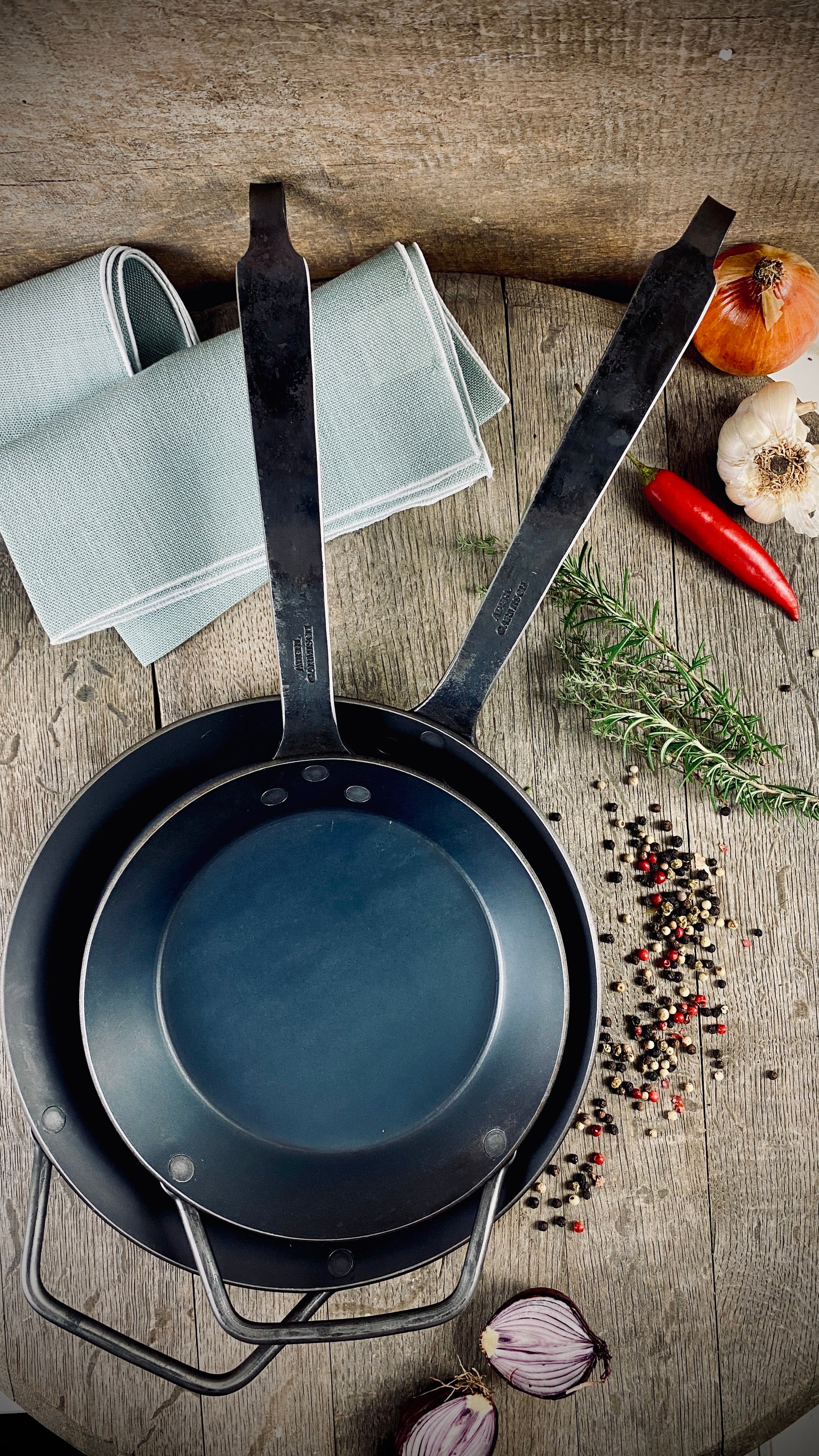 The centerpiece of the range: pans made of 3 mm thick wrought iron, with or without wooden handles, optionally with a hooked handle or two handles. They are completely uncoated, have a natural scale layer, and – unlike other iron pans – do not require seasoning. This means they're ready for use right away and offer an authentic frying experience from the very first moment.
