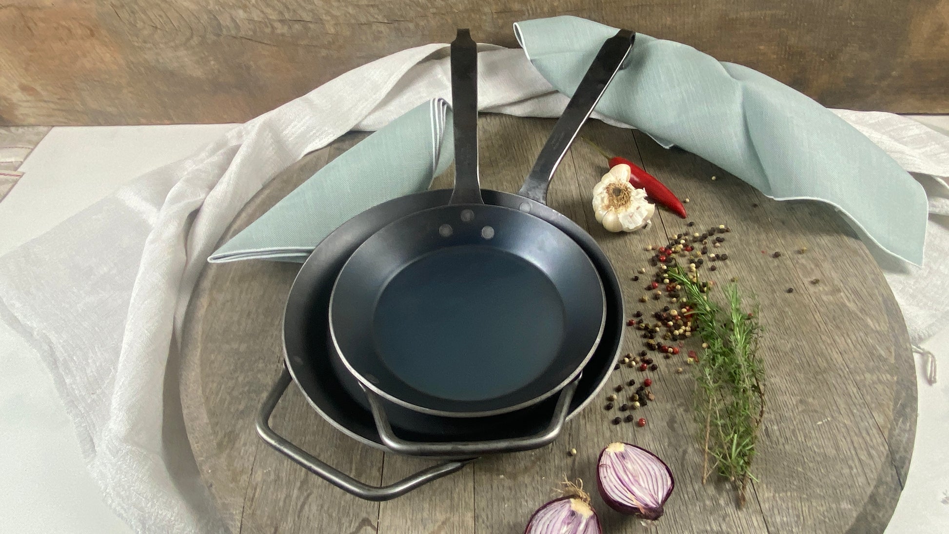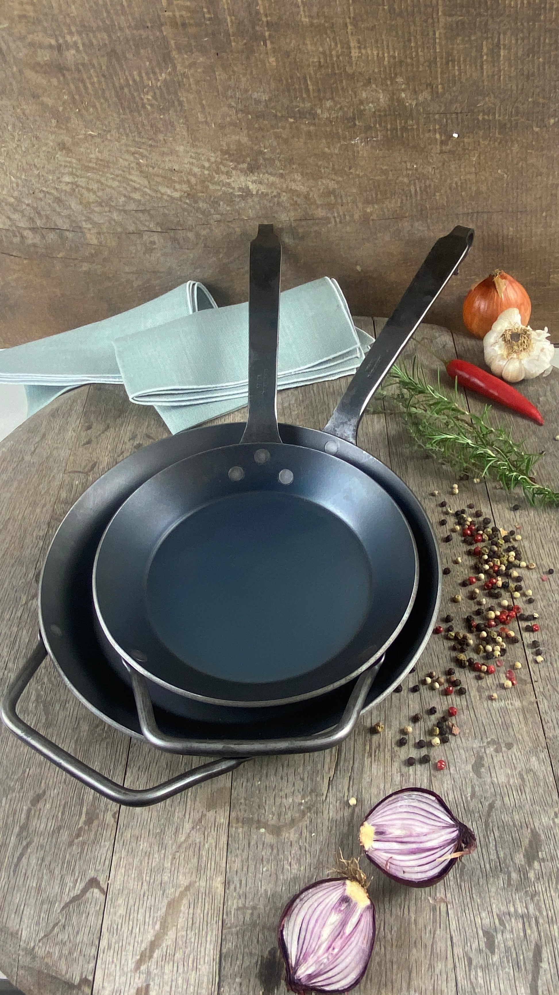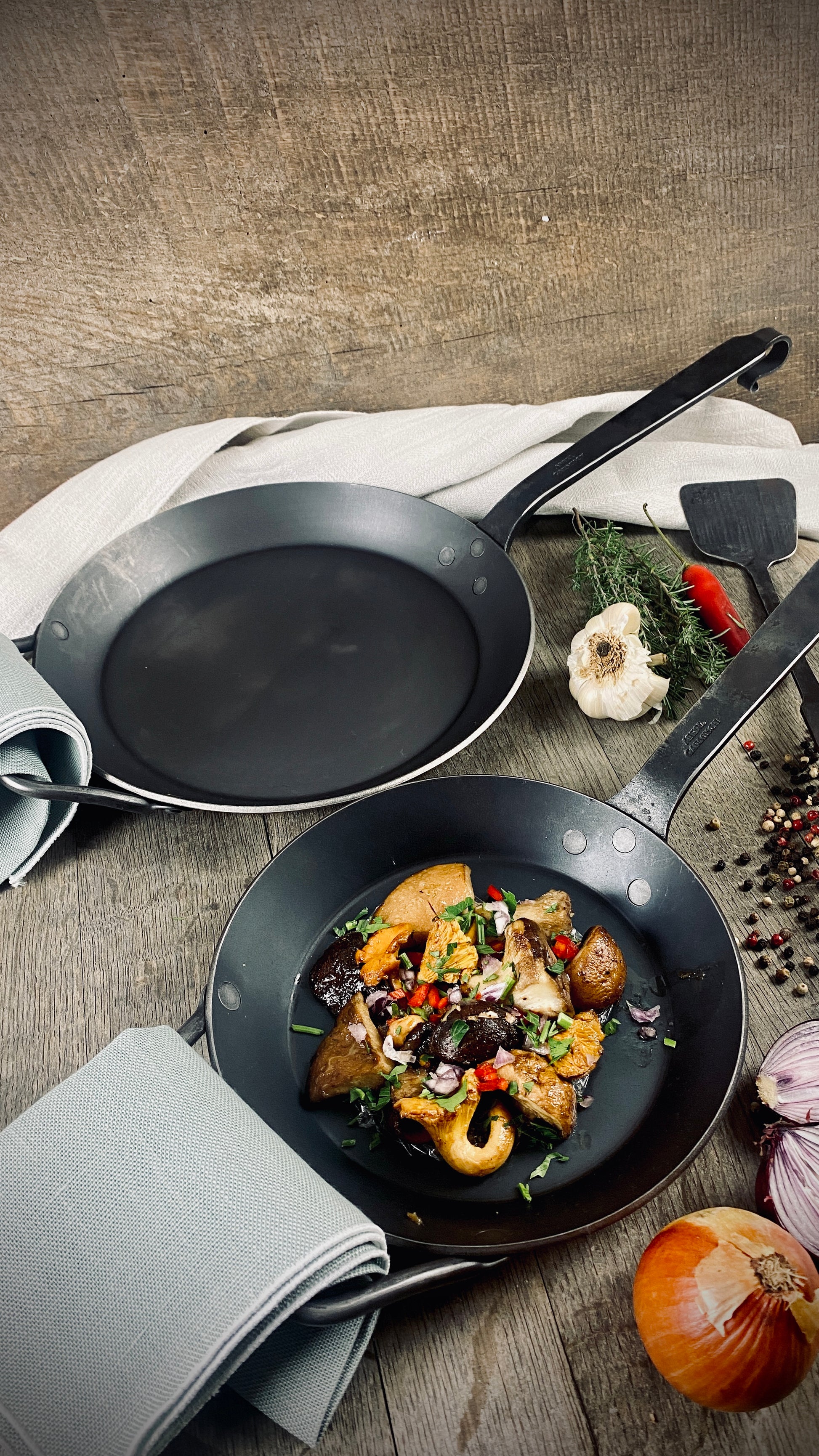 The centerpiece of the range: pans made of 3 mm thick wrought iron, with or without wooden handles, optionally with a hooked handle or two handles. They are completely uncoated, have a natural scale layer, and – unlike other iron pans – do not require seasoning. This means they're ready for use right away and offer an authentic frying experience from the very first moment.