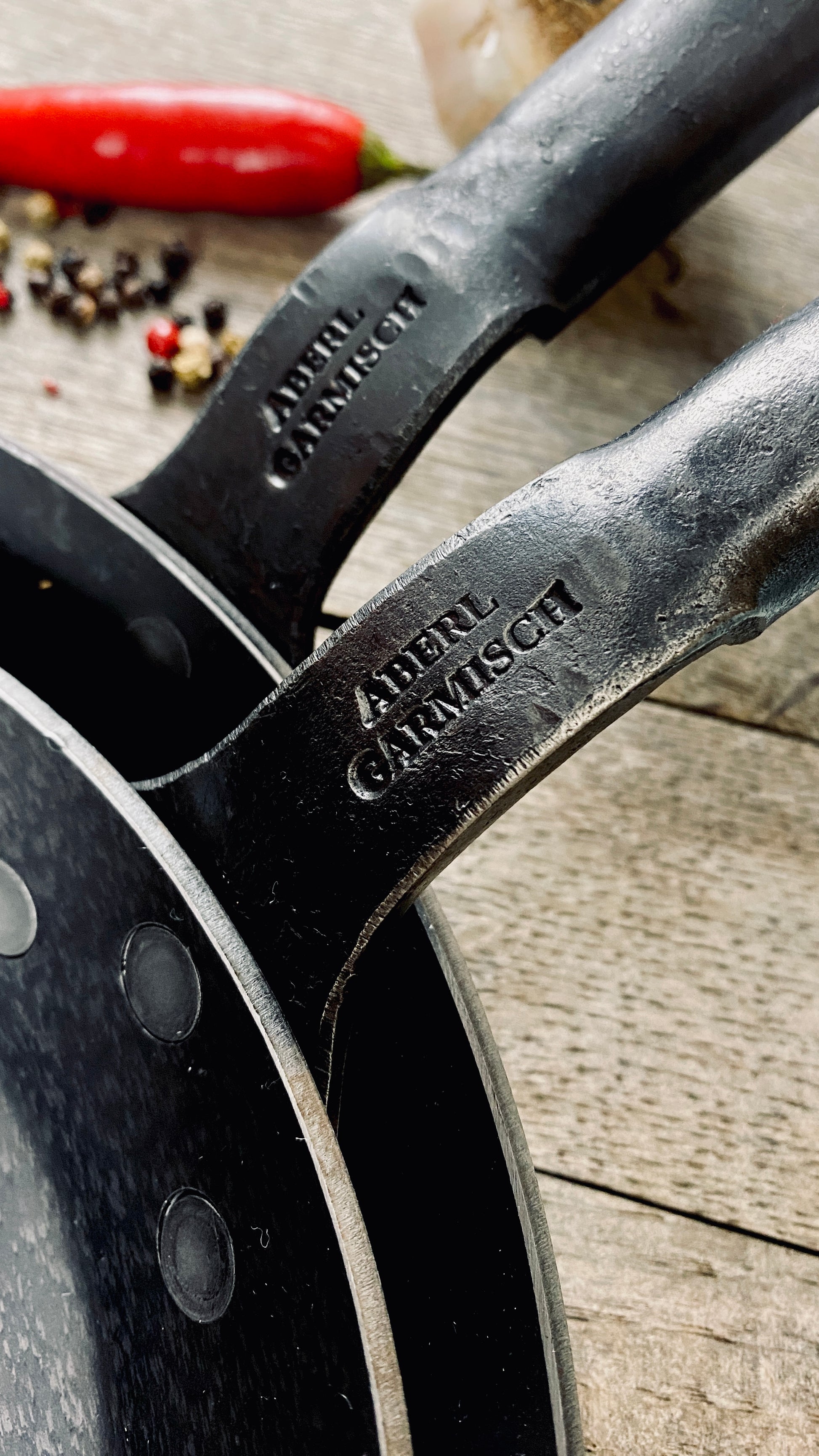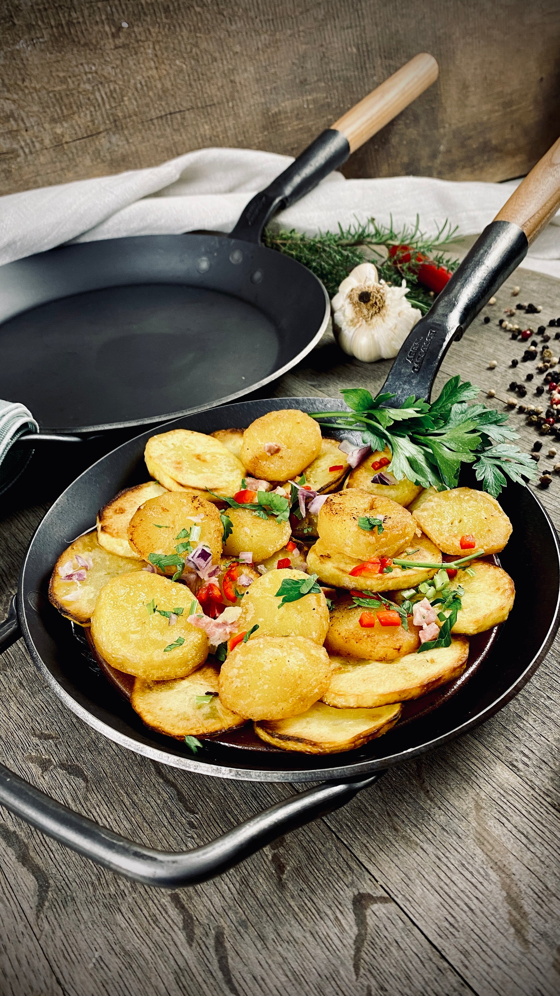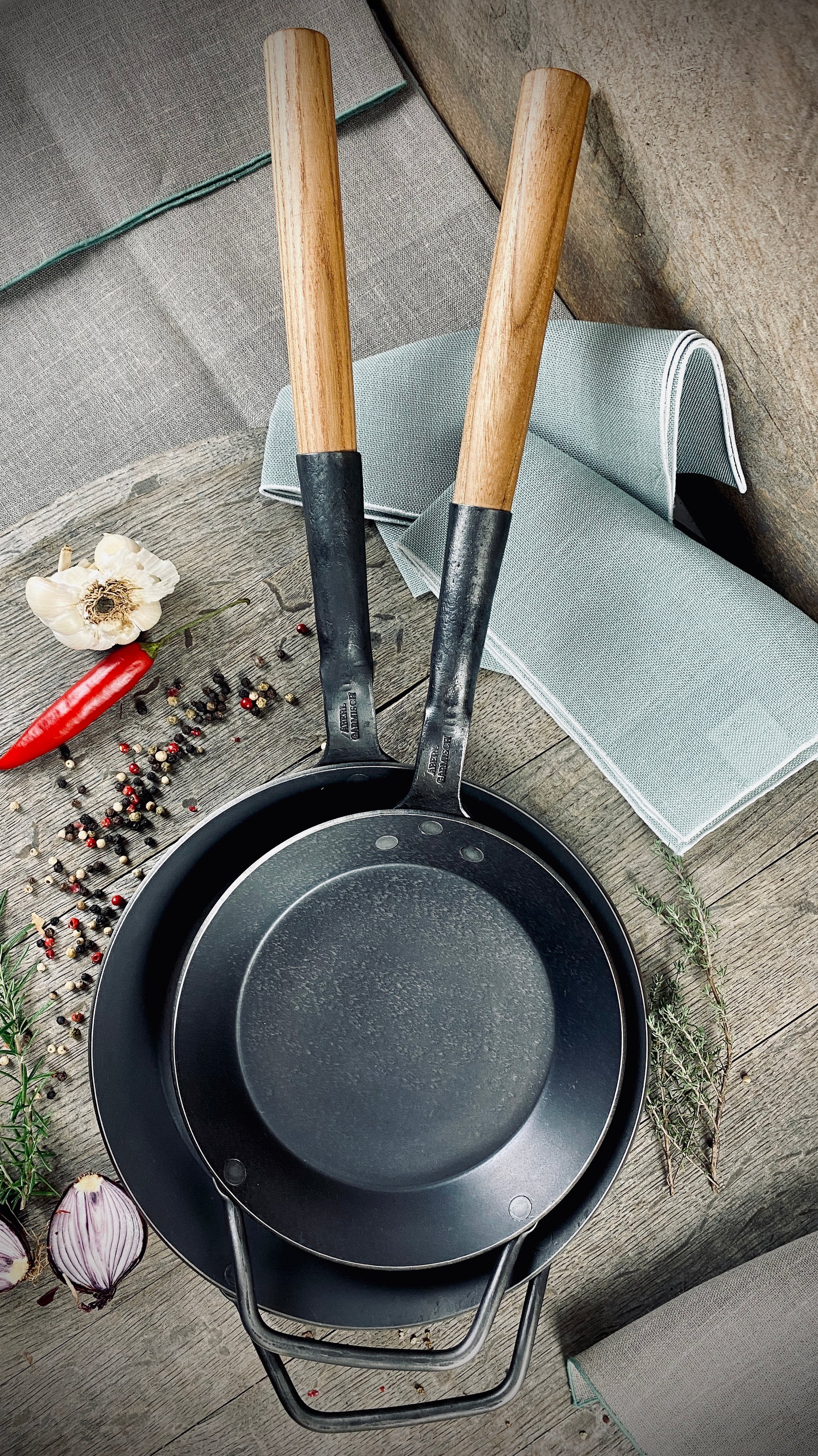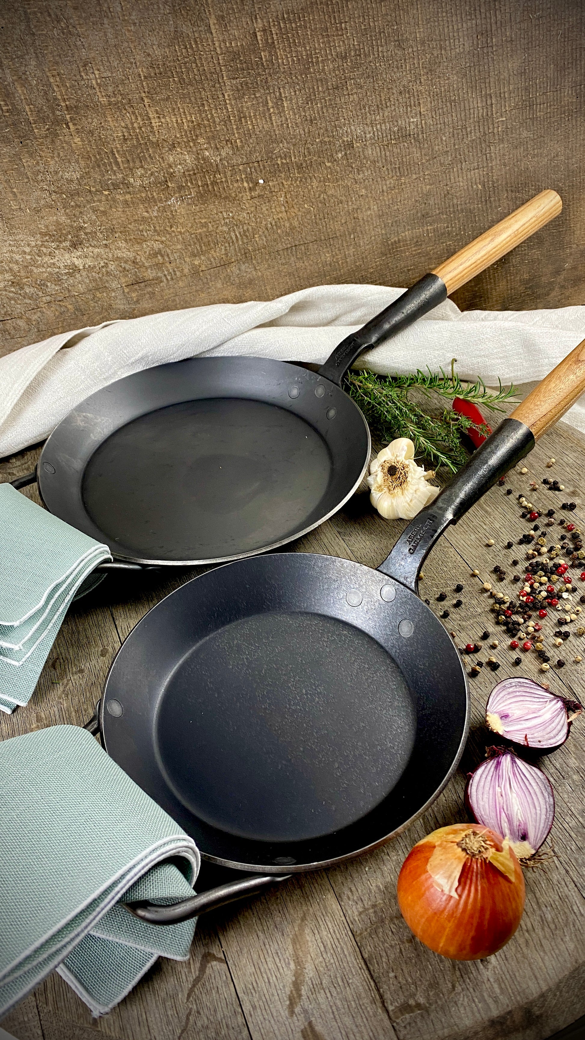 The centerpiece of the range: pans made of 3 mm thick wrought iron, with or without wooden handles, optionally with a hooked handle or two handles. They are completely uncoated, have a natural scale layer, and – unlike other iron pans – do not require seasoning. This means they're ready for use right away and offer an authentic frying experience from the very first moment.