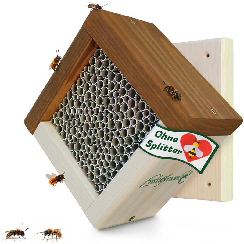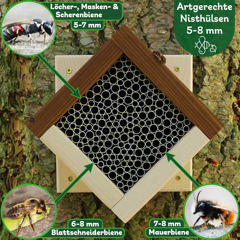 The various nesting boxes with a diameter of 5–8 mm are 100% splinter-free and appeal to almost every native wild bee species: