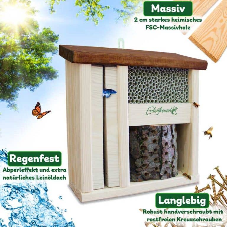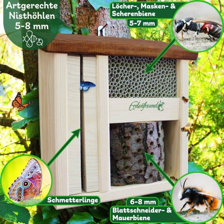 The professional nesting tubes are extra water-repellent and made of particularly ecological grass paper. The nesting holes in the natural wooden block were drilled by hand using professional wood drills, super fine and splinter-free . This creates a safe and long-lasting nesting place for wild bees.