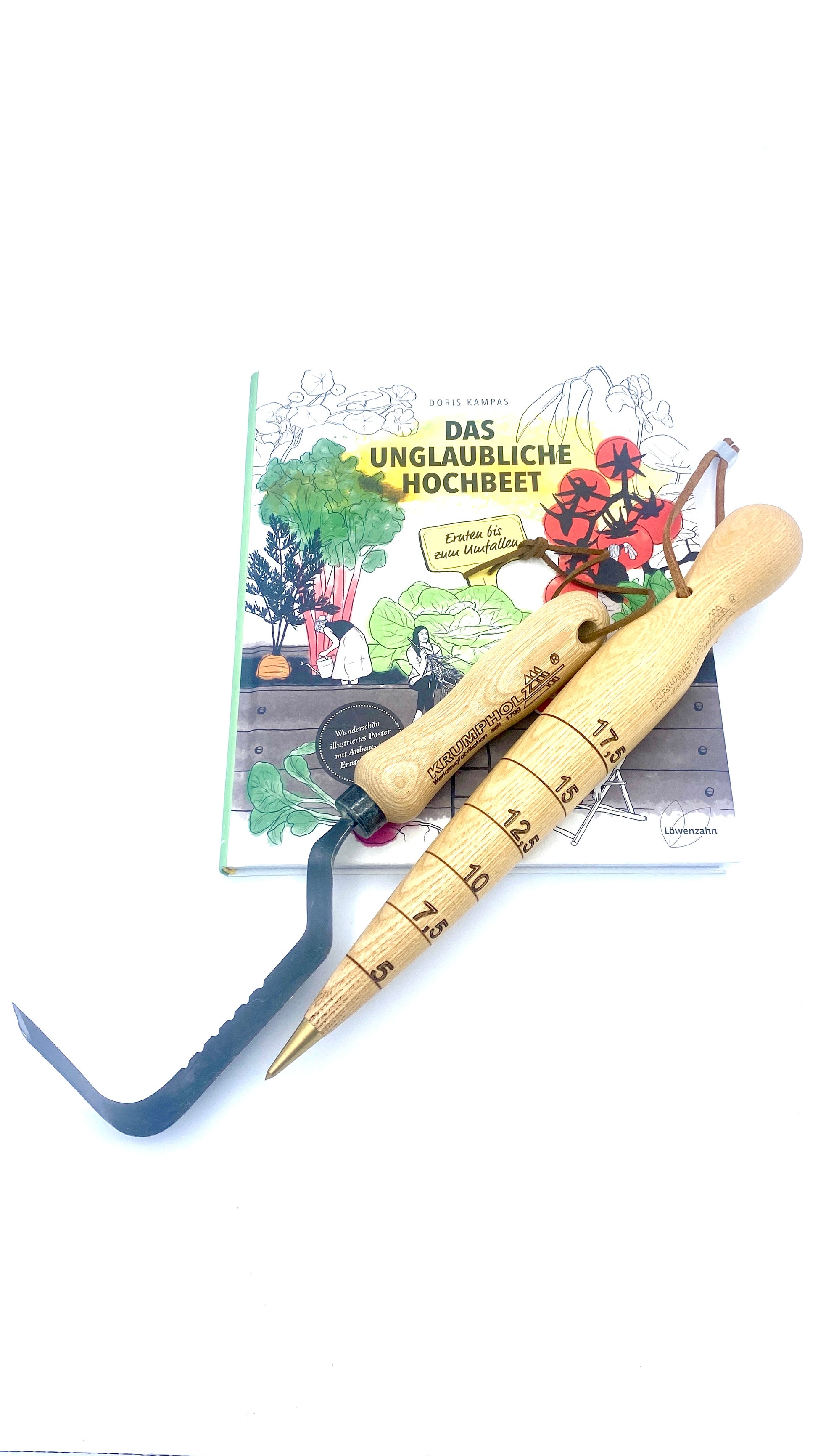 This set combines three essential companions for anyone who enjoys tending their garden with efficiency. The Krumpholz weeding fork with root saw and ash handle is the ideal tool for removing weeds precisely and cutting through even deep-seated roots. The set is complemented by a planting stick with a brass tip , which allows for precise planting holes for vegetables, herbs, and flower bulbs. The robust brass tip ensures effortless penetration into the soil, while the engraved scale indicates the exact planting depth.