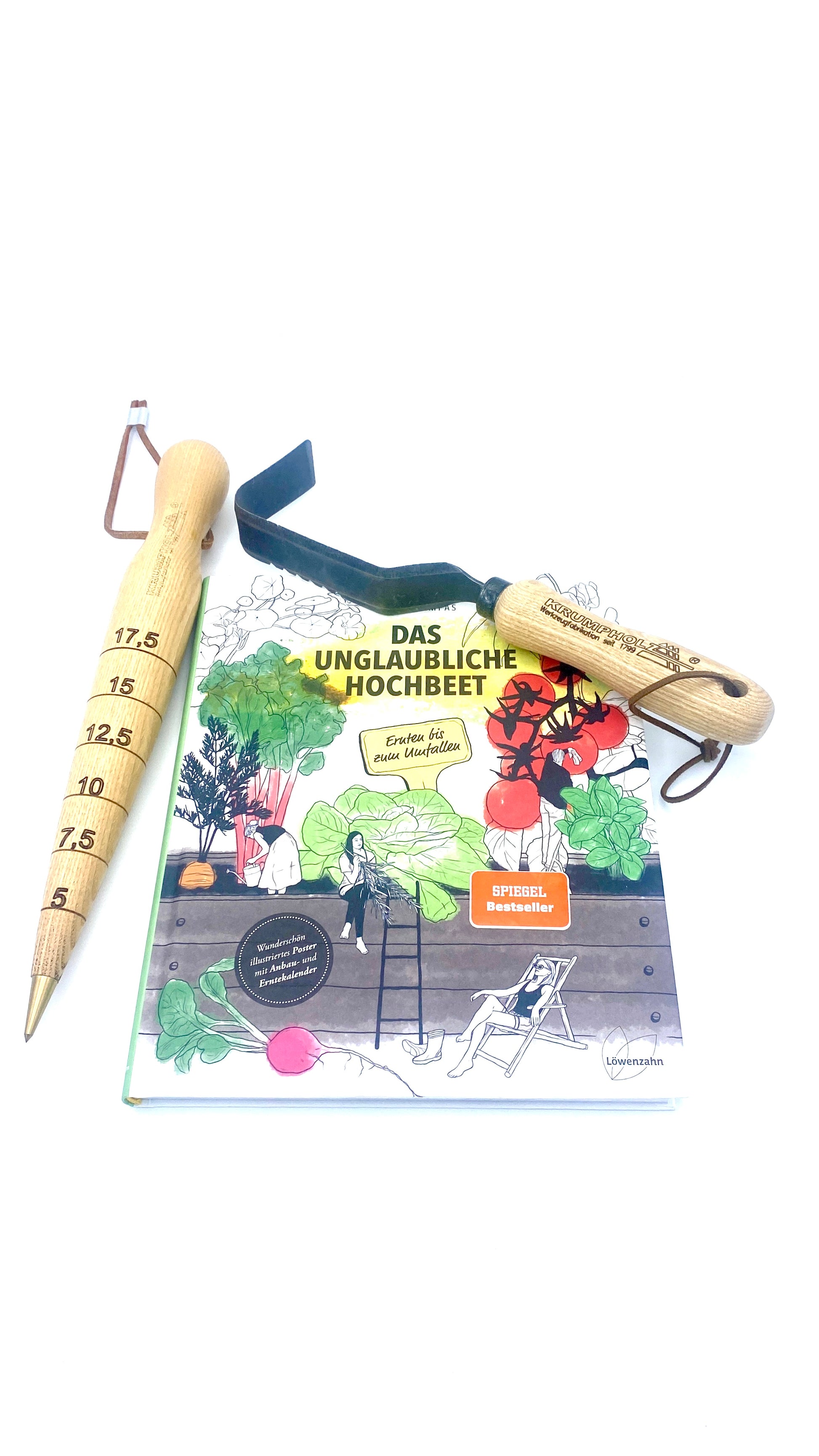 A high-quality garden tool set from Krumpholz and the inspiring book The Incredible Raised Bed – lovingly packaged from our gift factory.