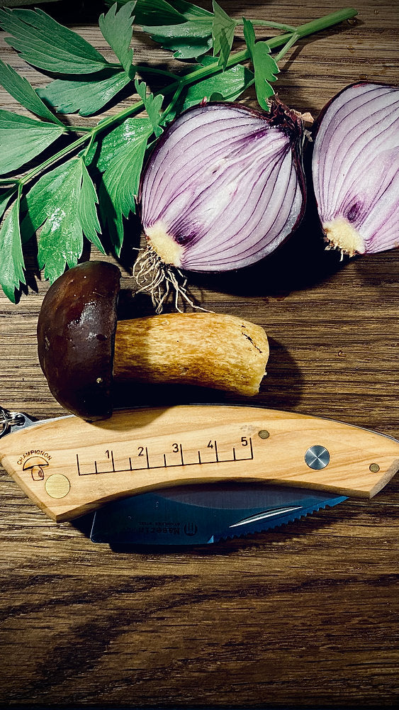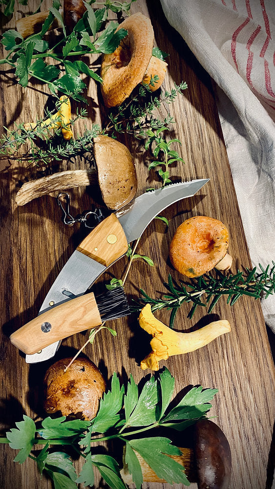- 1x Maserin mushroom knife (olive wood handle, stainless steel blade, brush)