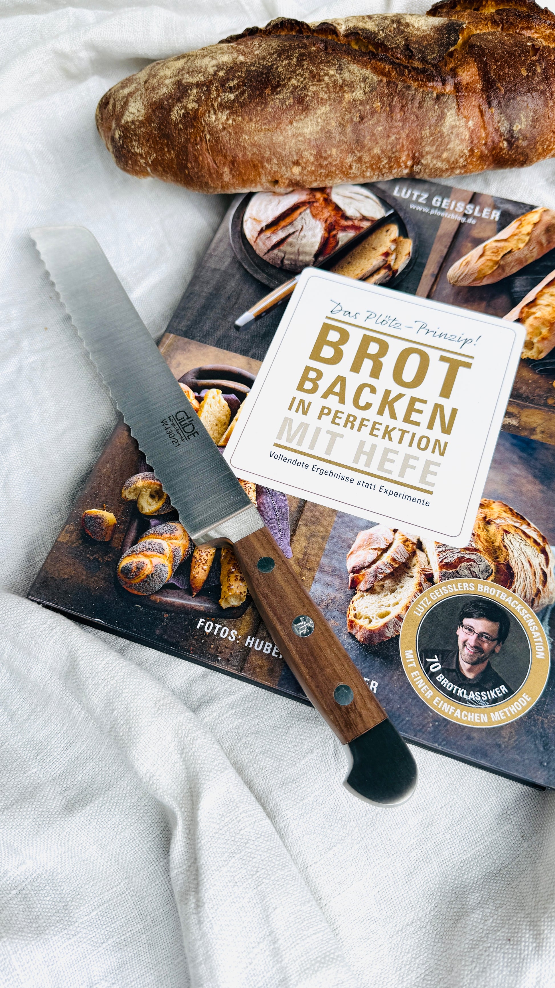 Geschenkset „Backkunst & Genuss“ – Buch „Brot backen in Perfektion“ & Gude Brotmesser Alpha (Walnuss, ca. 21 cm)