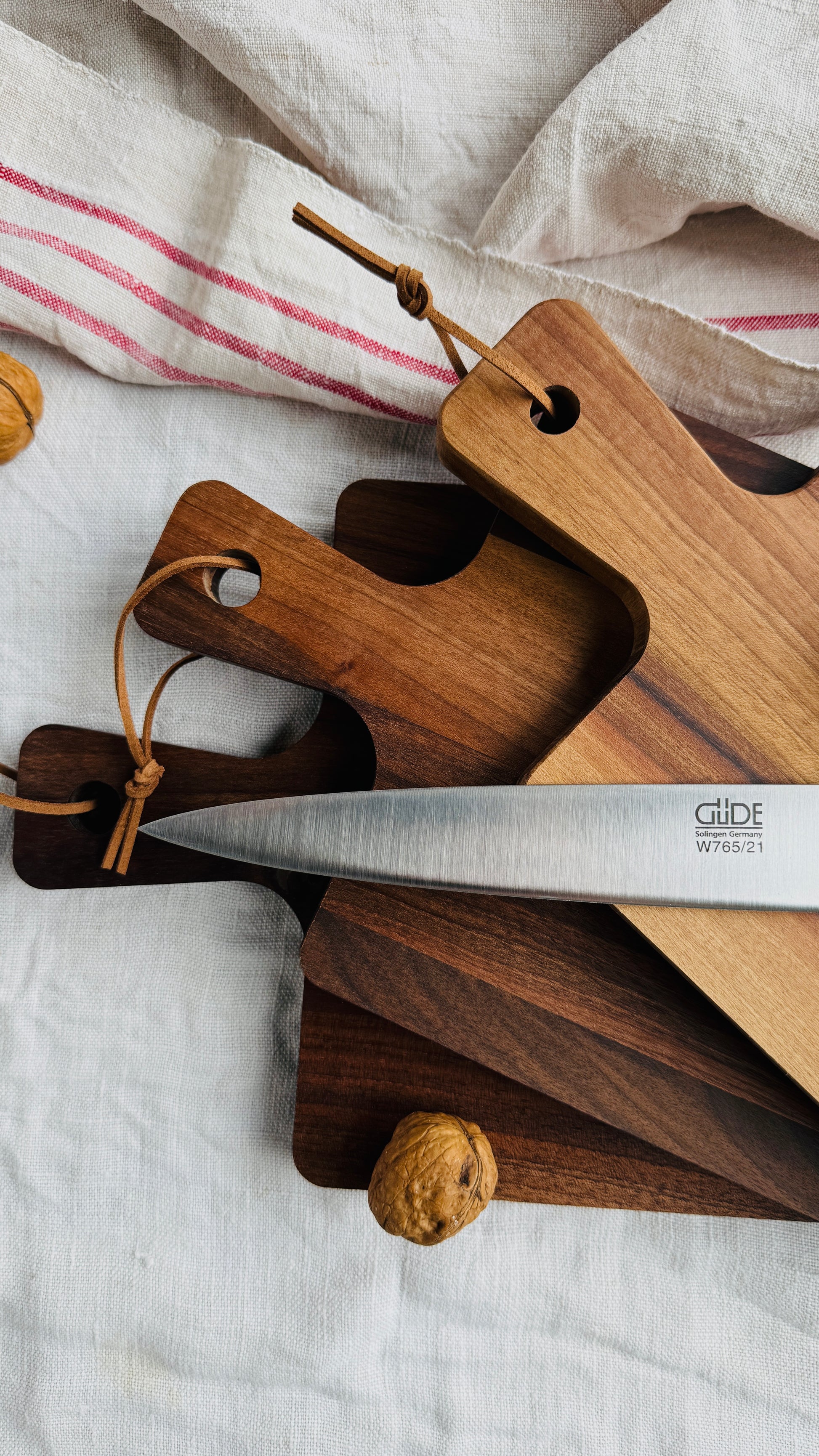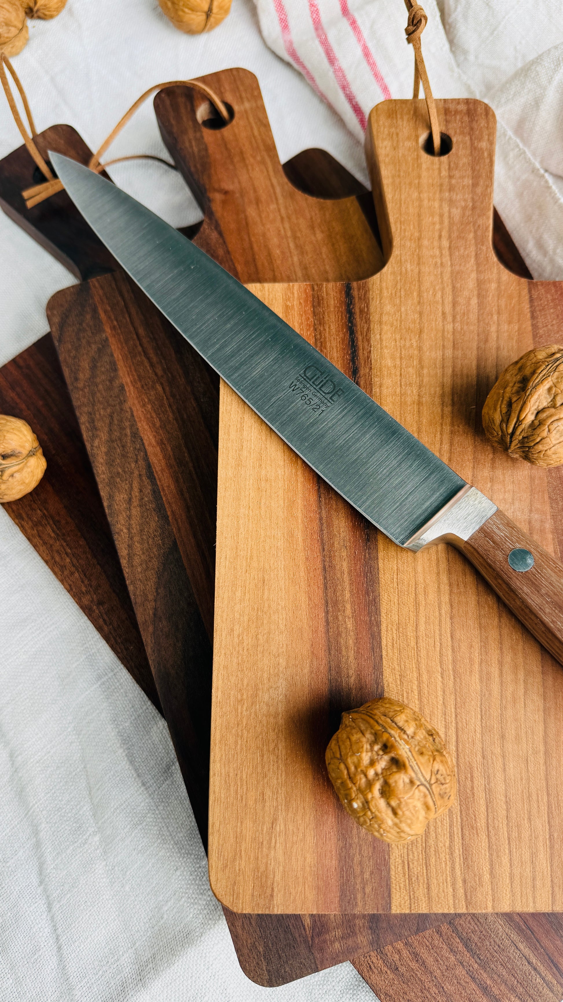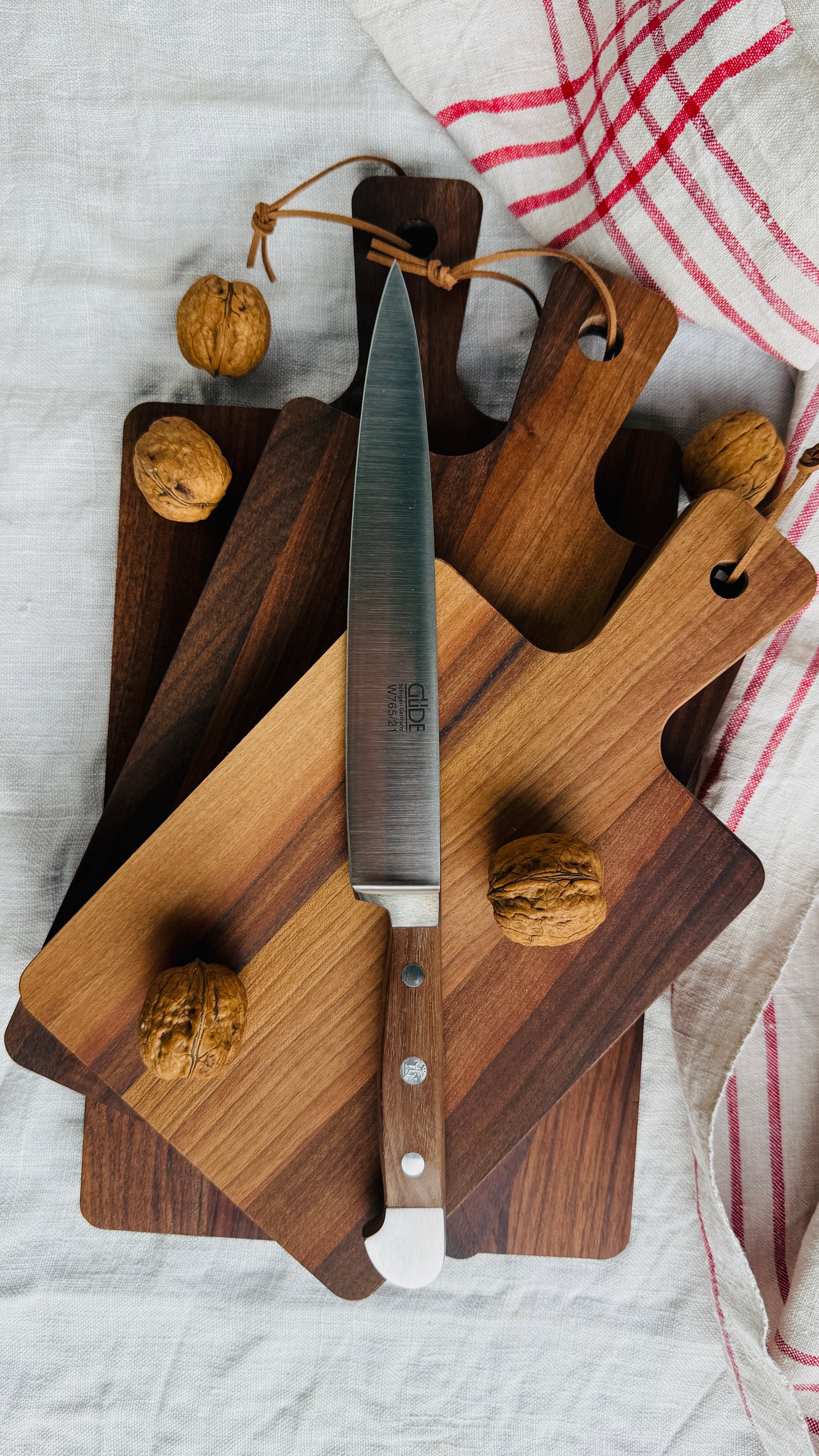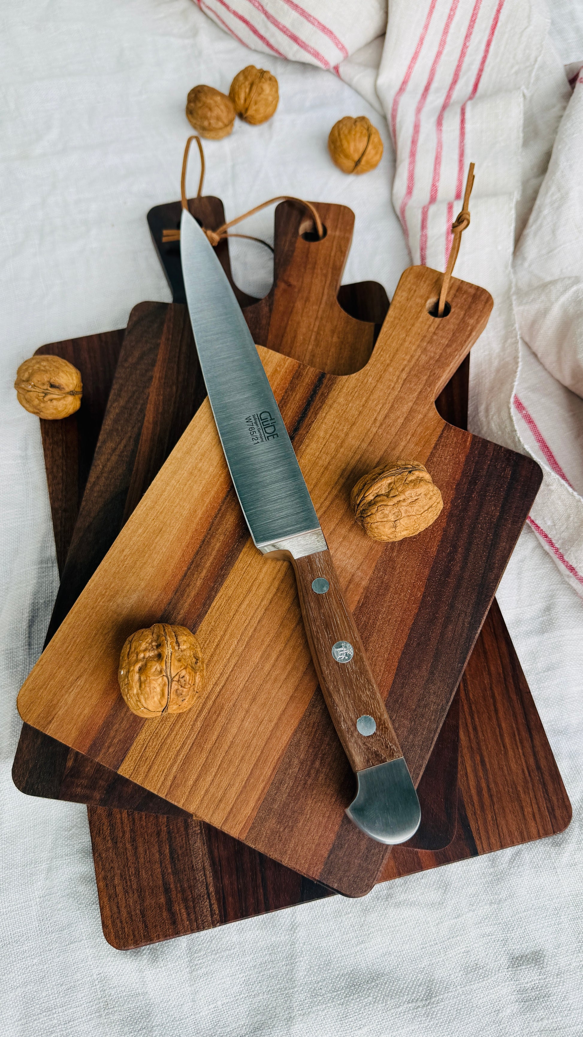 Gift set - Precision meets elegance – the Güde ham knife Alpha Walnut (21 cm) with the three walnut/beech boards is an experience in the kitchen
