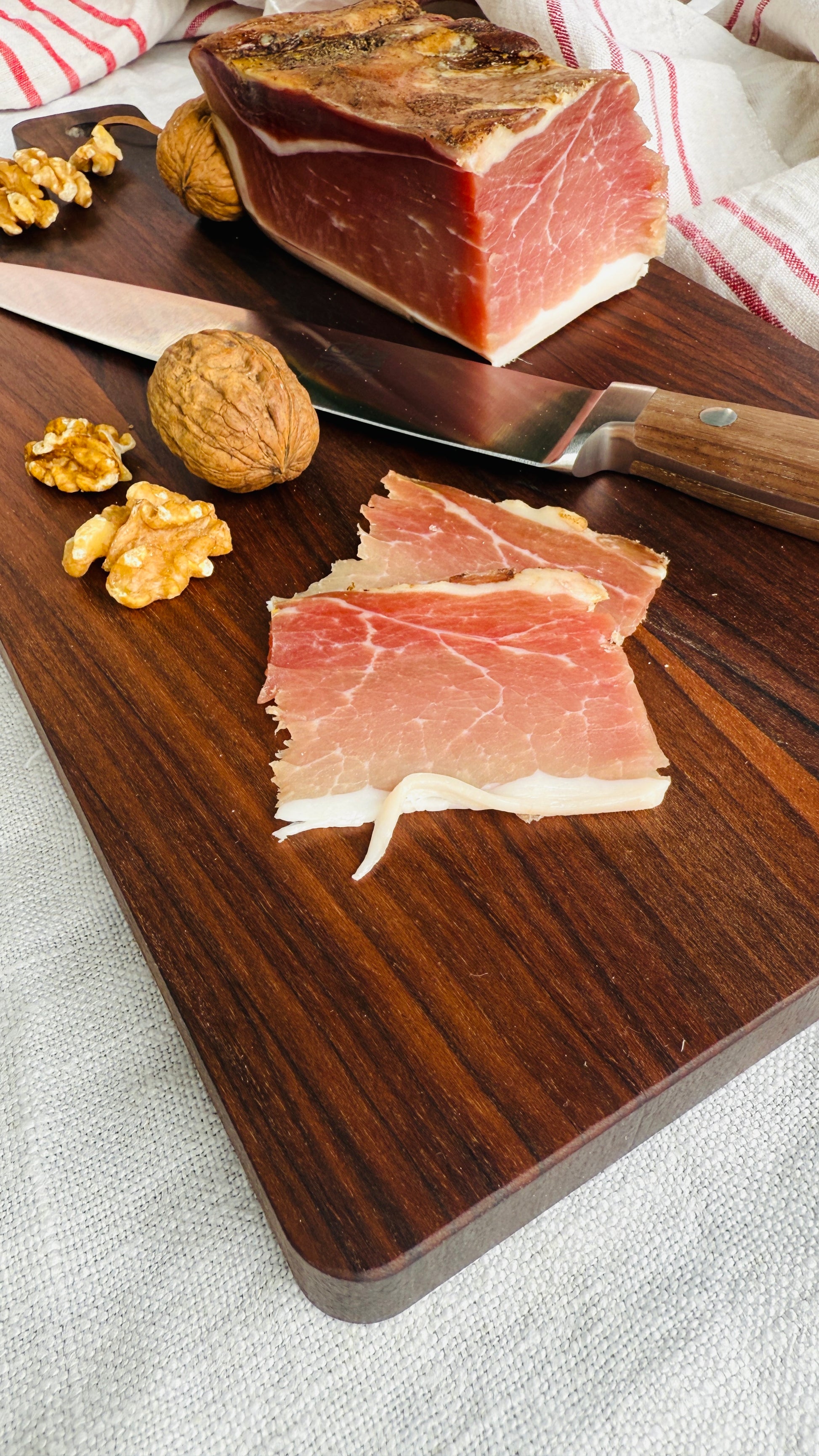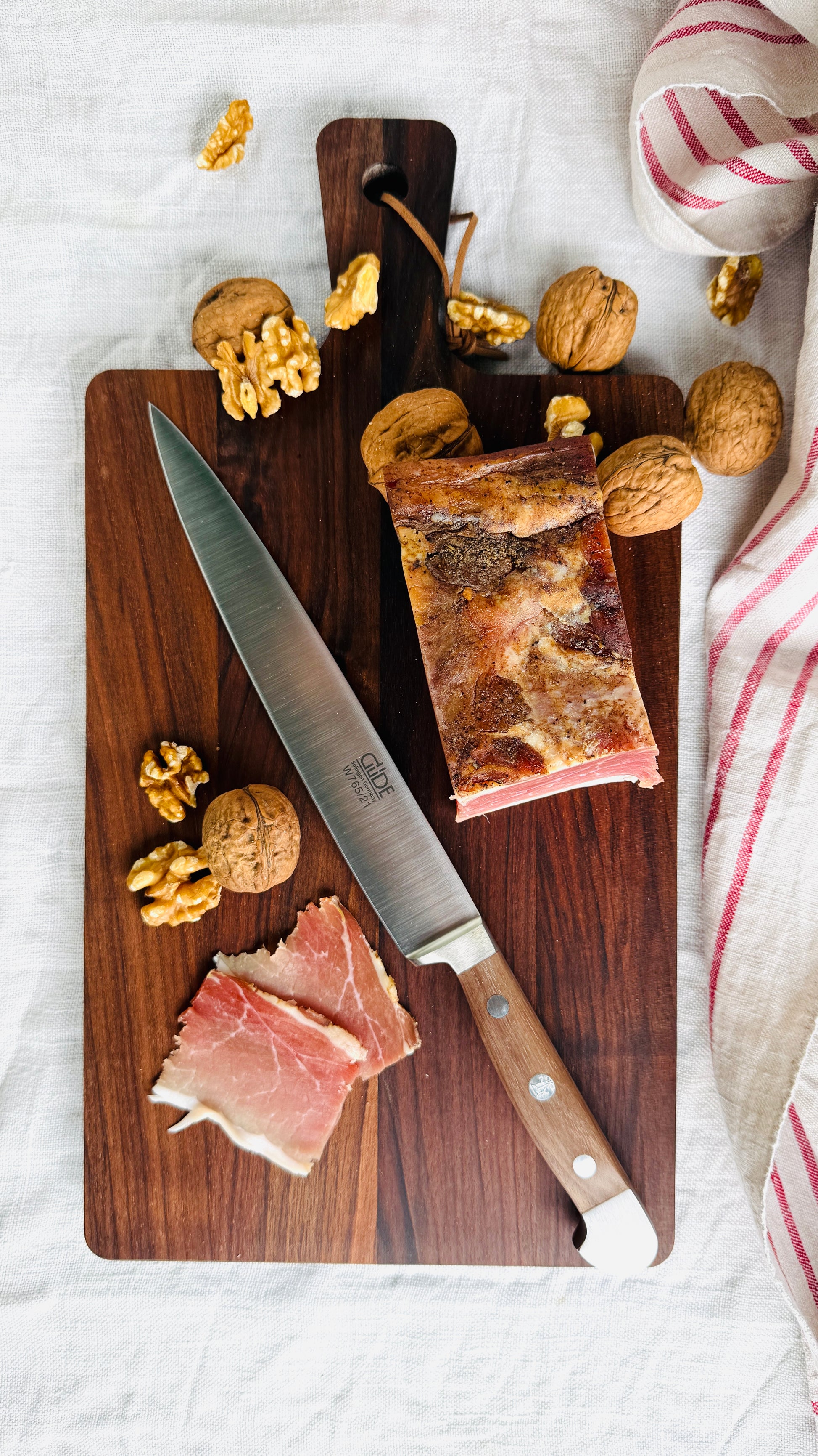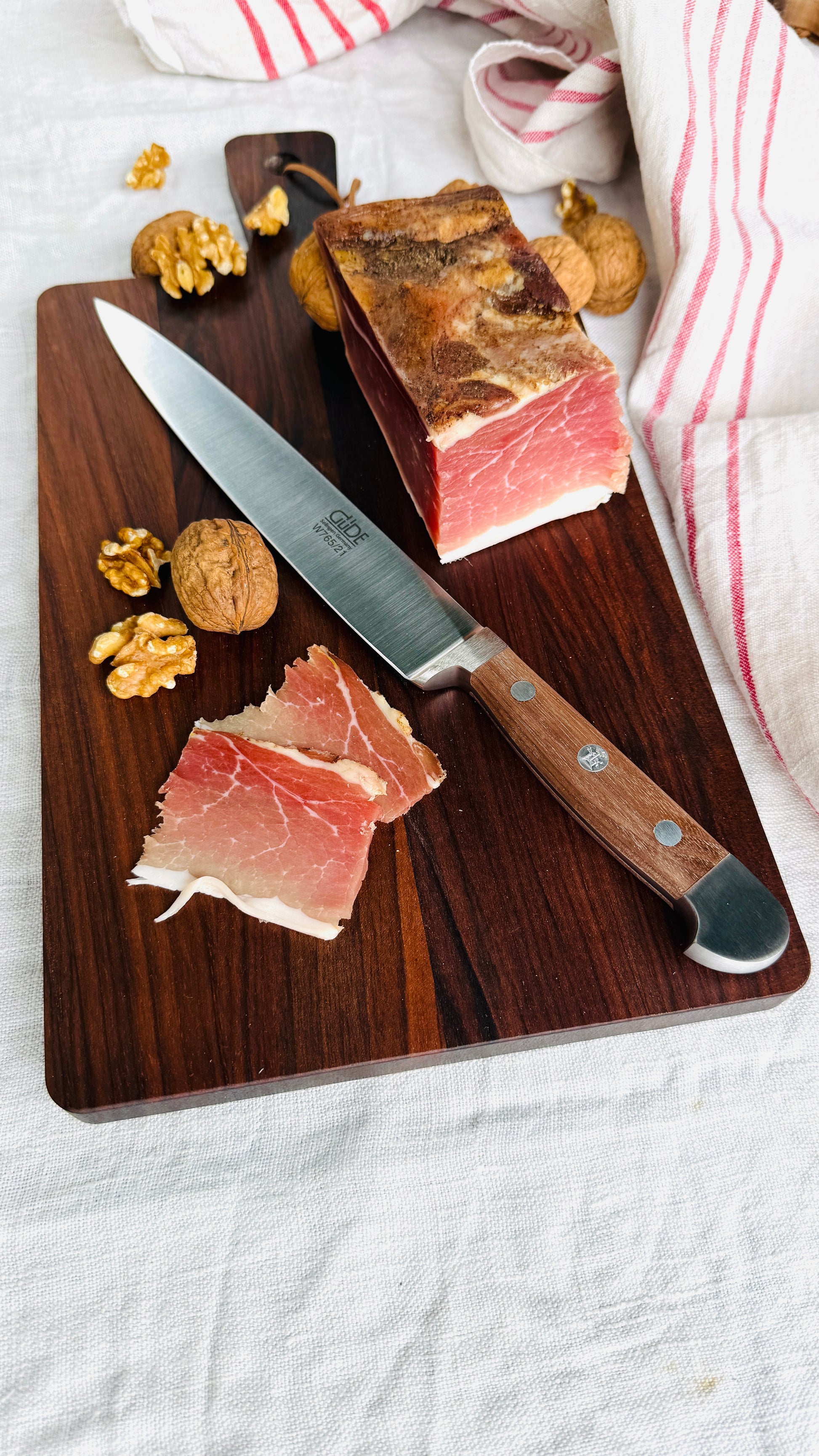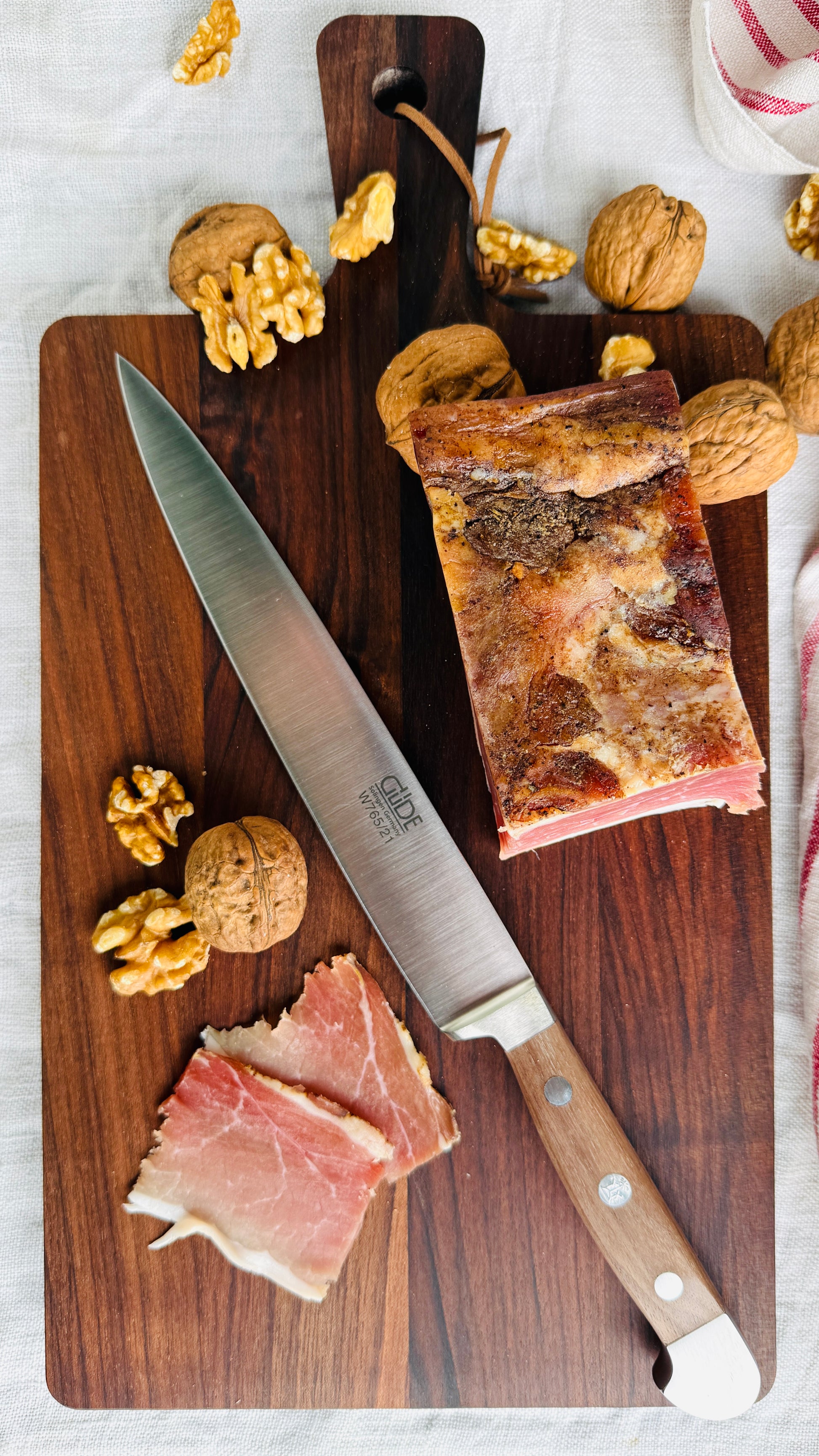 Gift set - Precision meets elegance – the Güde ham knife Alpha Walnut (21 cm) with the walnut/beech board and a smoked piece of ham from the Schulz country butcher shop