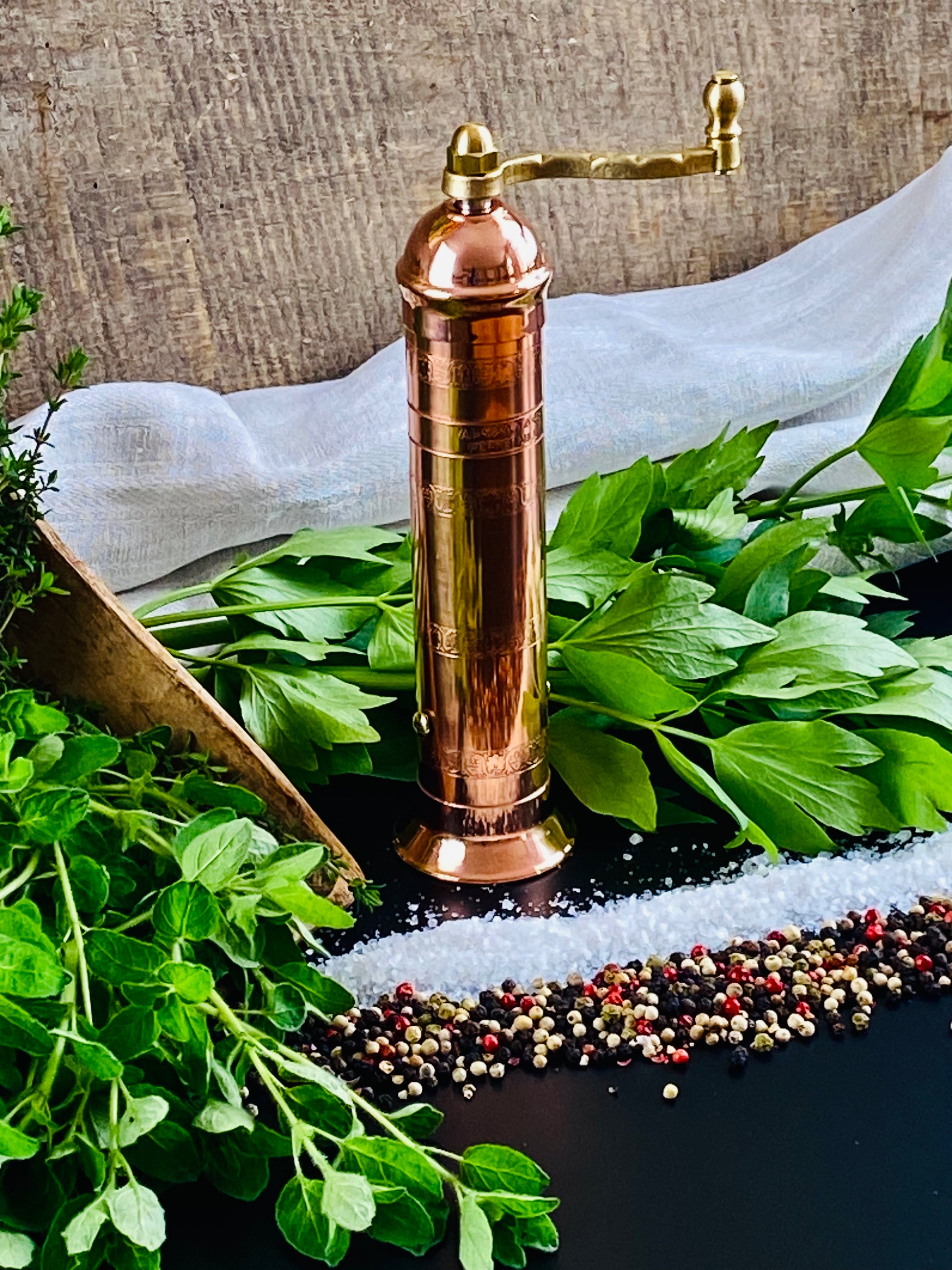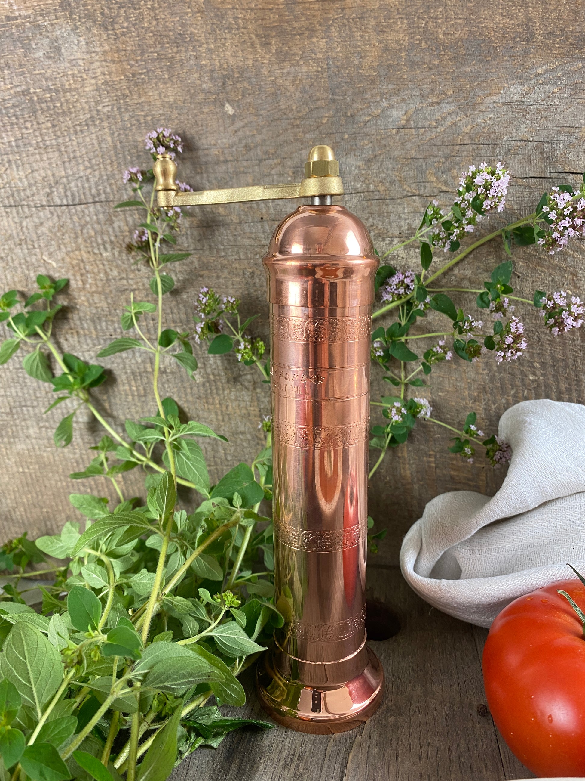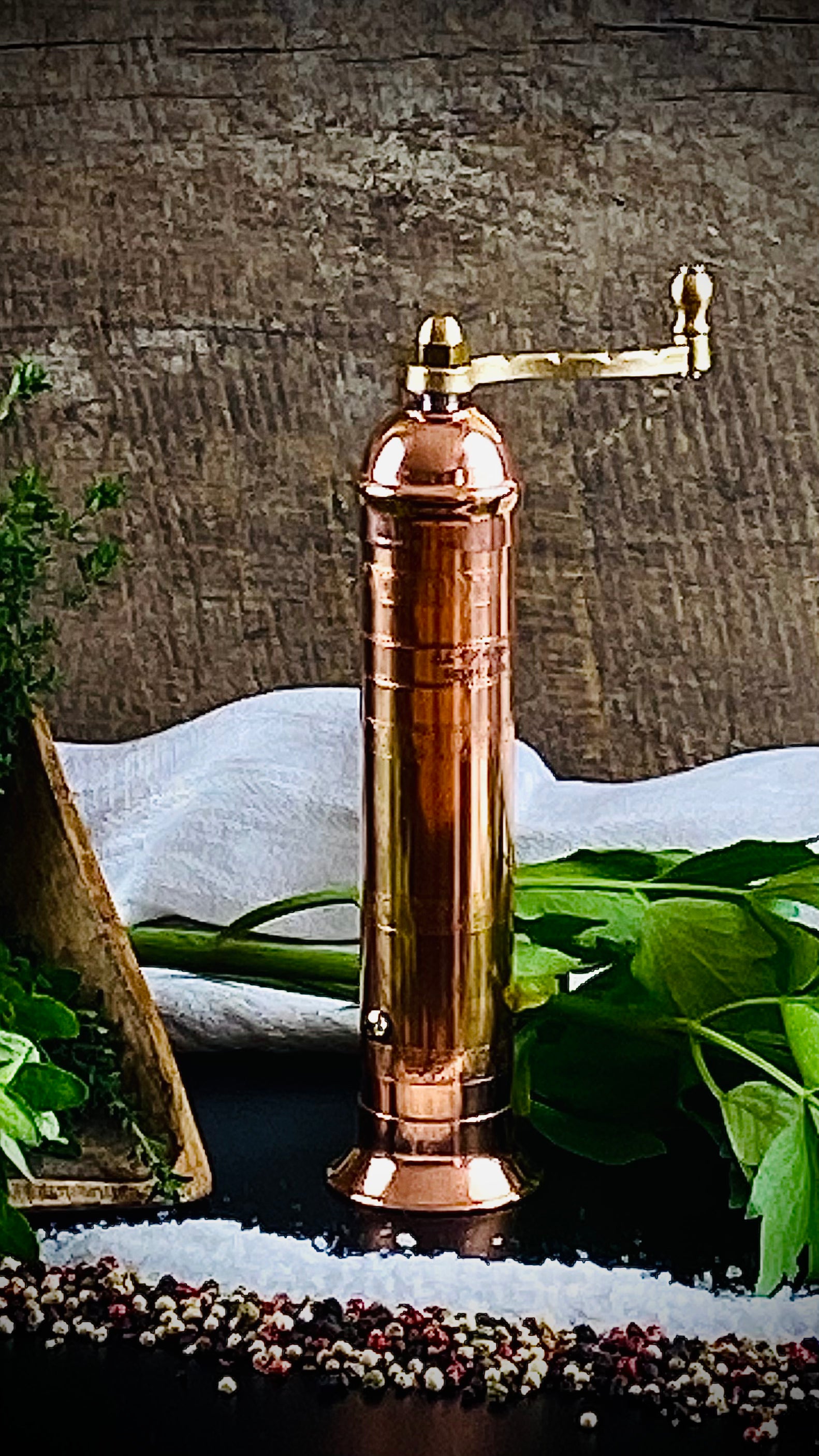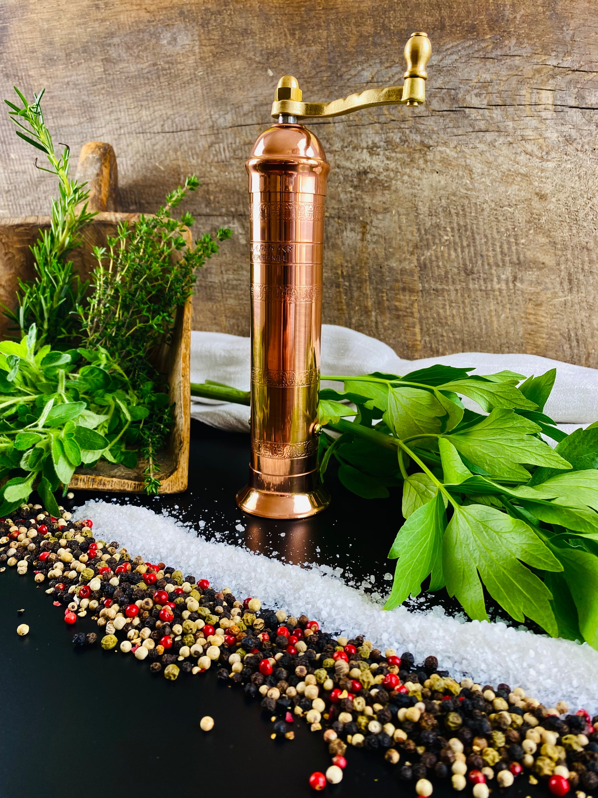 High-quality spice mill, handmade from copper. The mill weighs approximately 230 g, is approximately 23 cm high, and has a diameter of approximately 5.5 cm. It is made of solid copper and features a cast iron grinder for perfectly grinding your spices. The mill is not decorated.