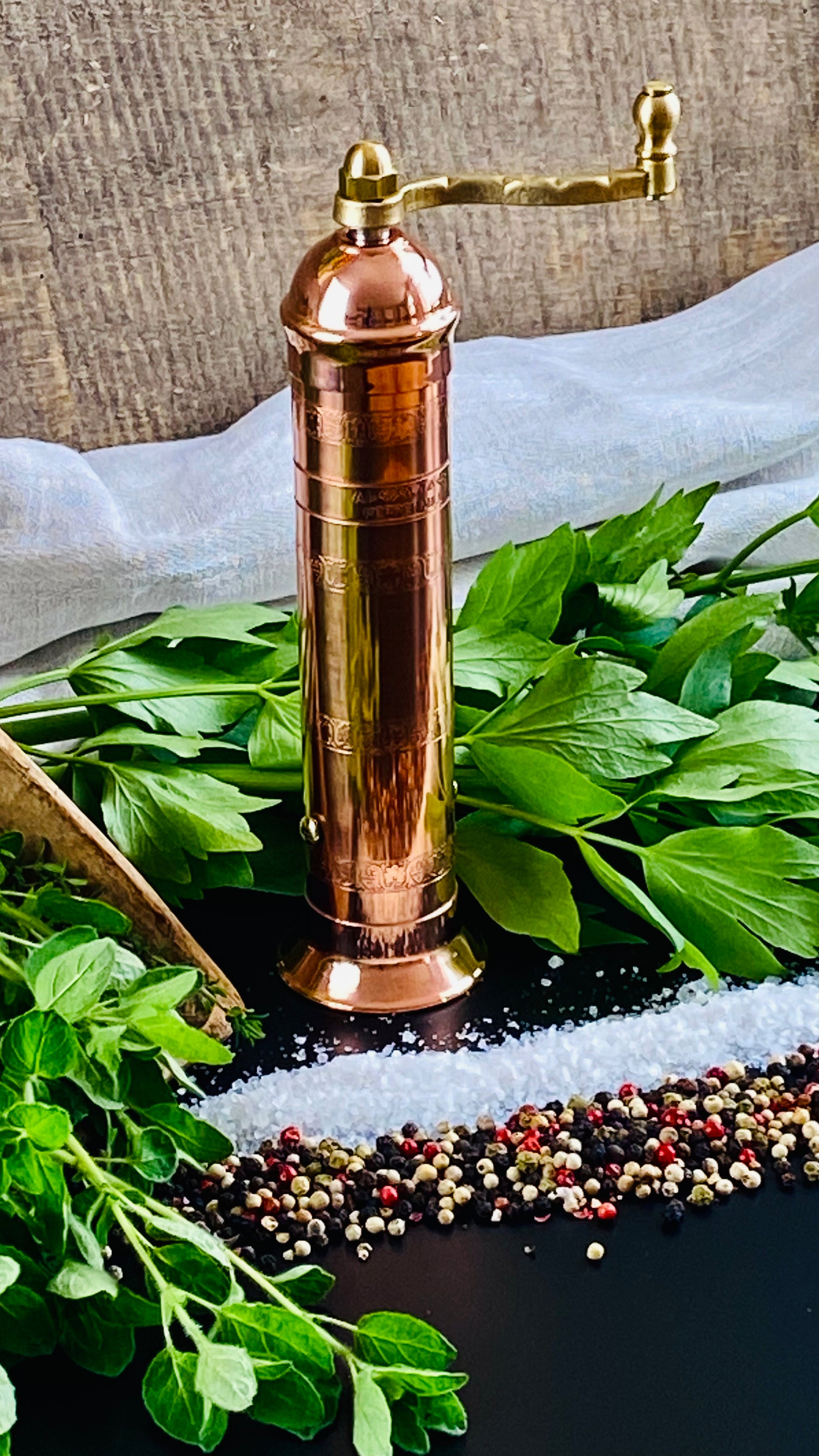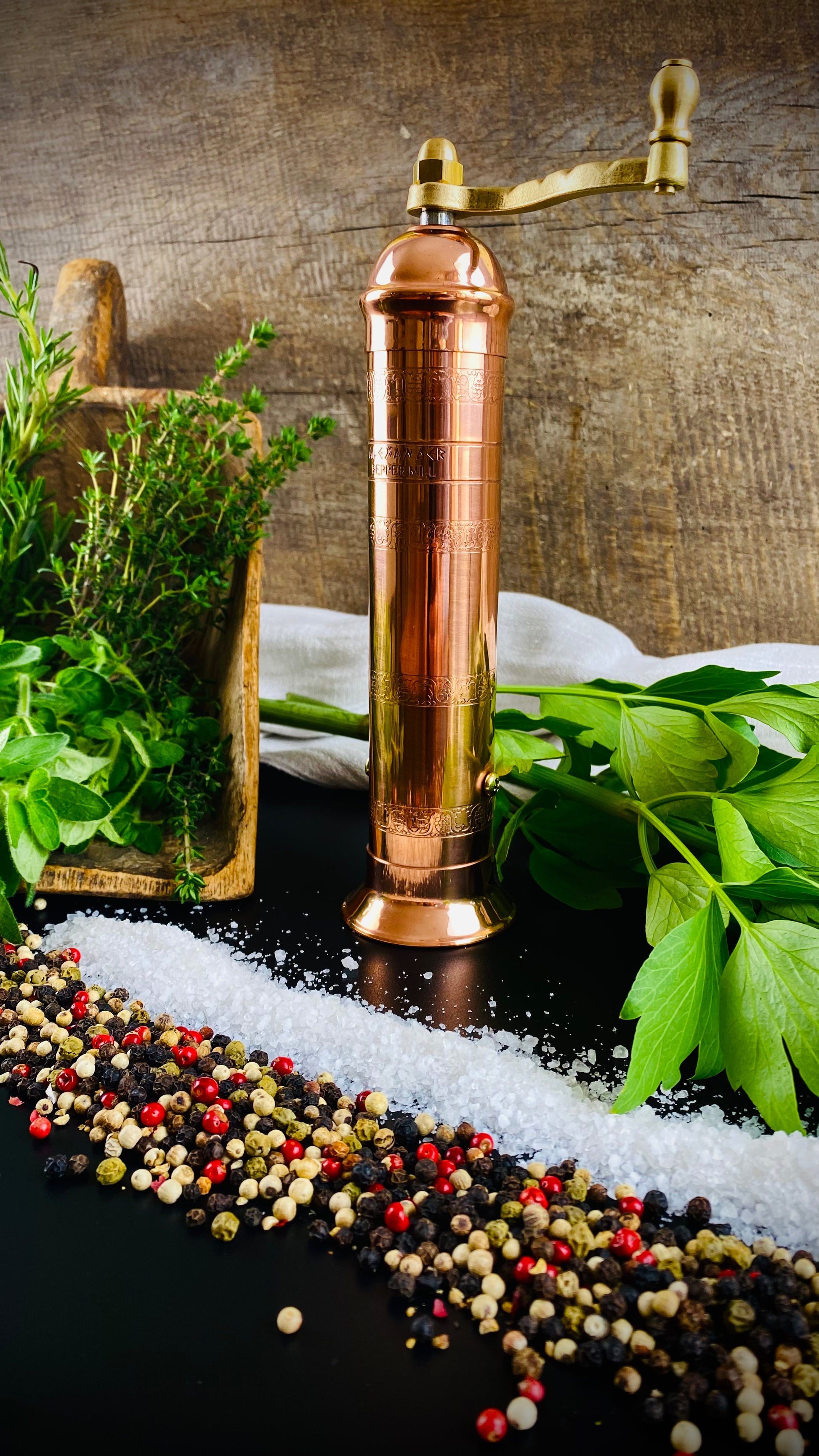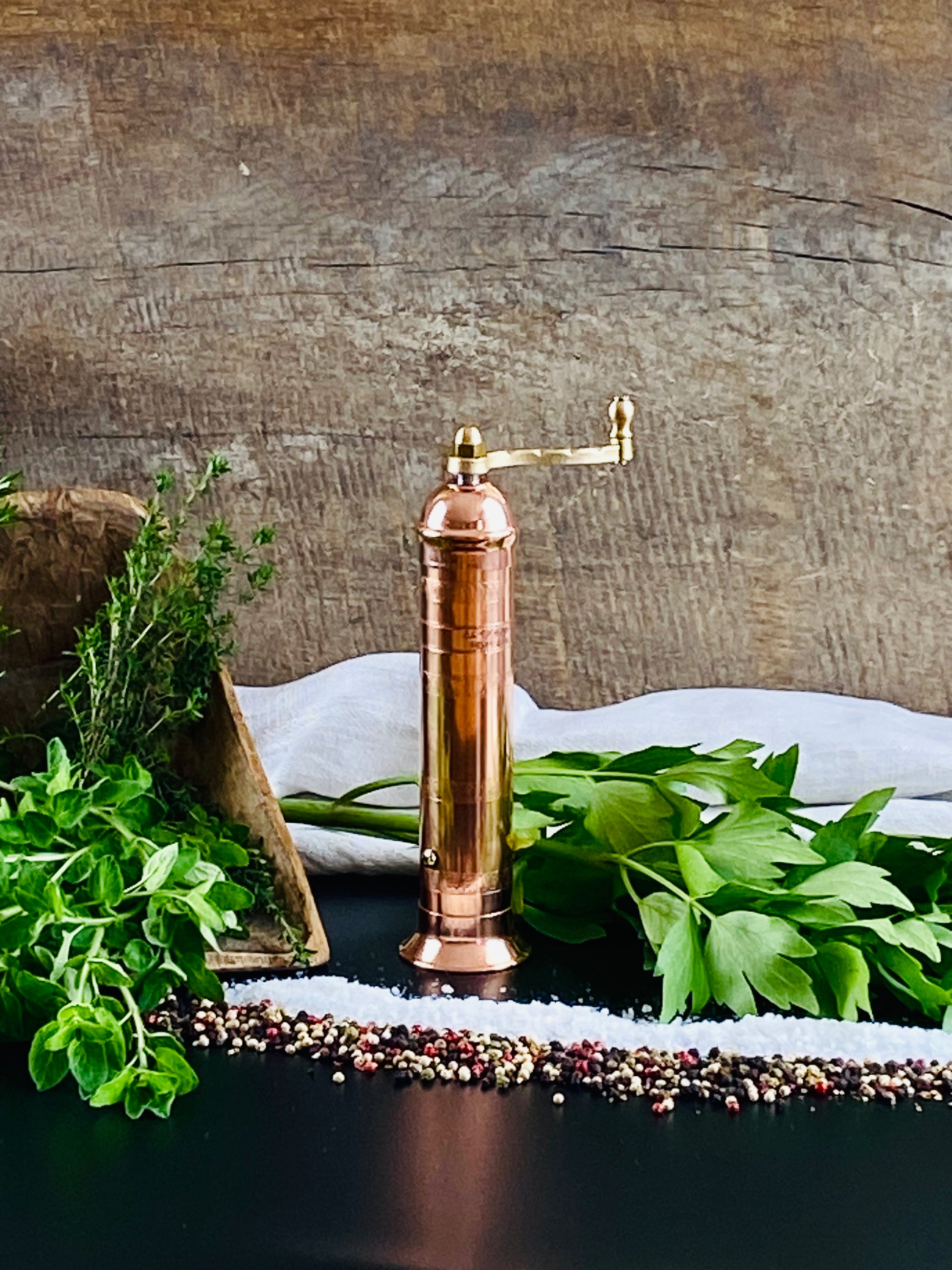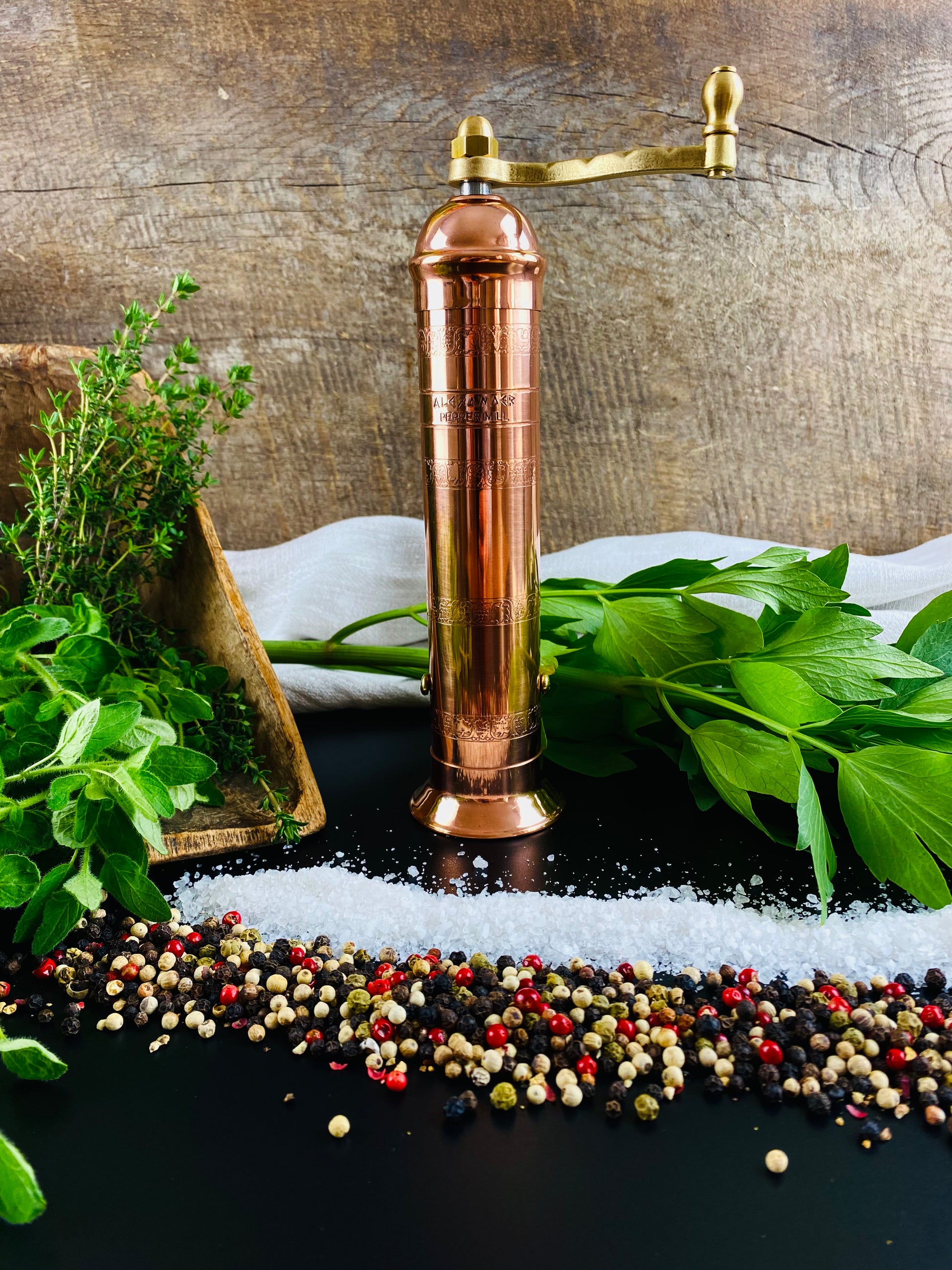 High-quality spice mill, handmade from copper. The mill weighs approximately 230 g, is approximately 23 cm high, and has a diameter of approximately 5.5 cm. It is made of solid copper and features a cast iron grinder for perfectly grinding your spices. The mill is not decorated.