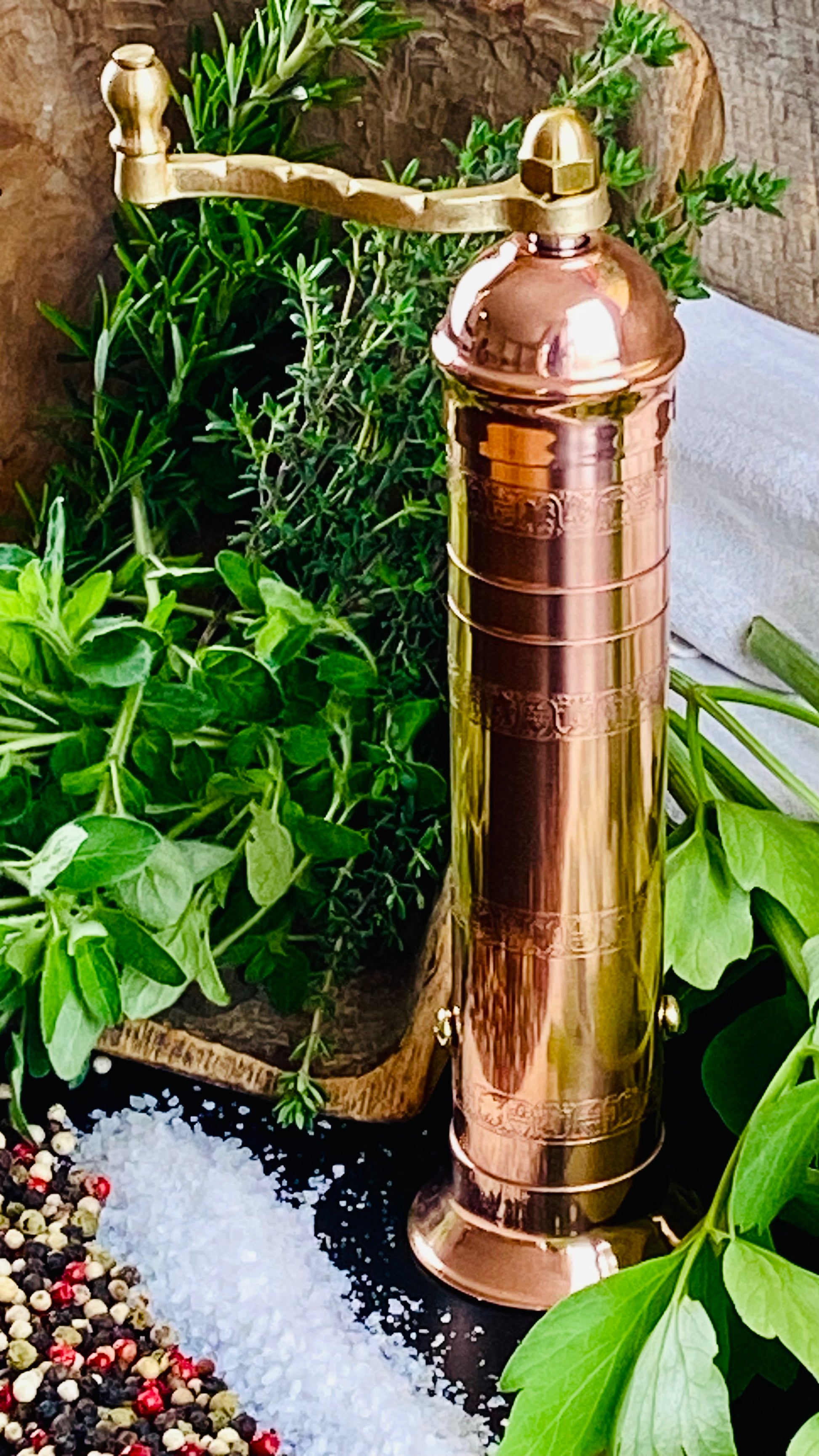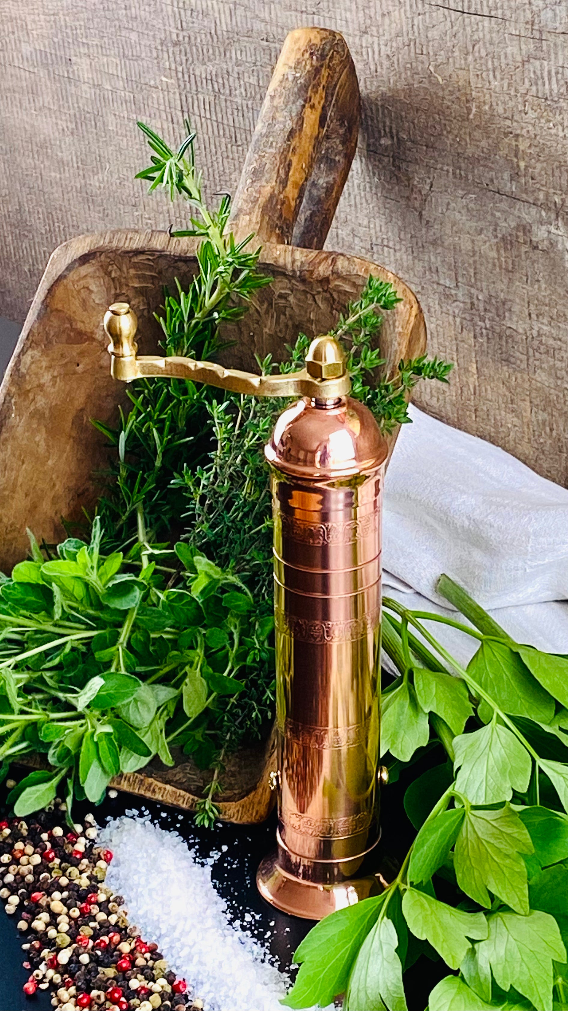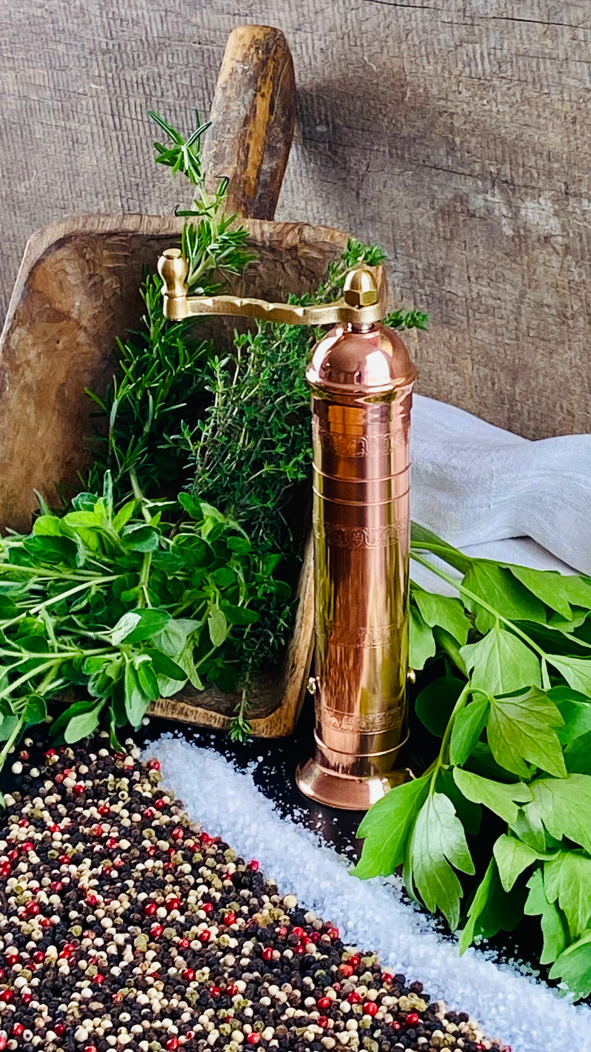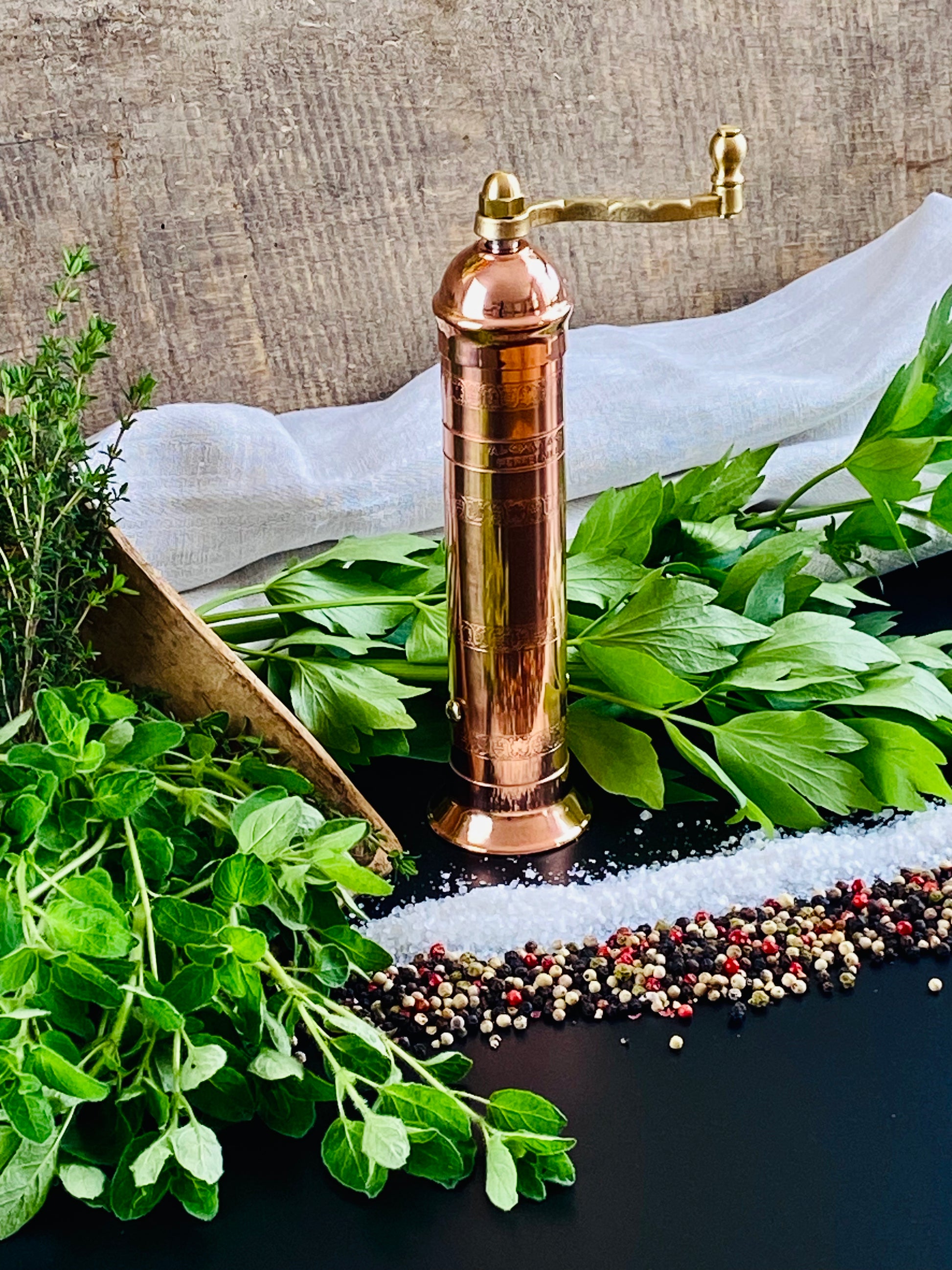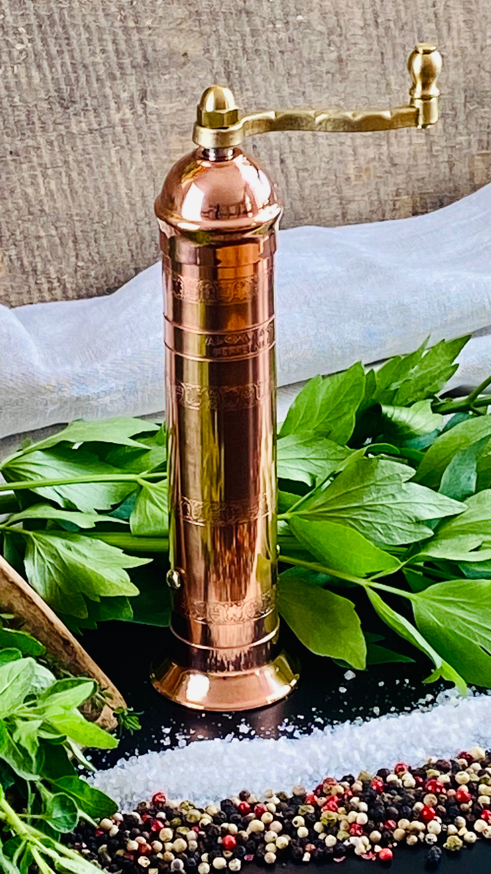 High-quality spice mill, handmade from copper. The mill weighs approximately 230 g, is approximately 23 cm high, and has a diameter of approximately 5.5 cm. It is made of solid copper and features a cast iron grinder for perfectly grinding your spices. The mill is not decorated.