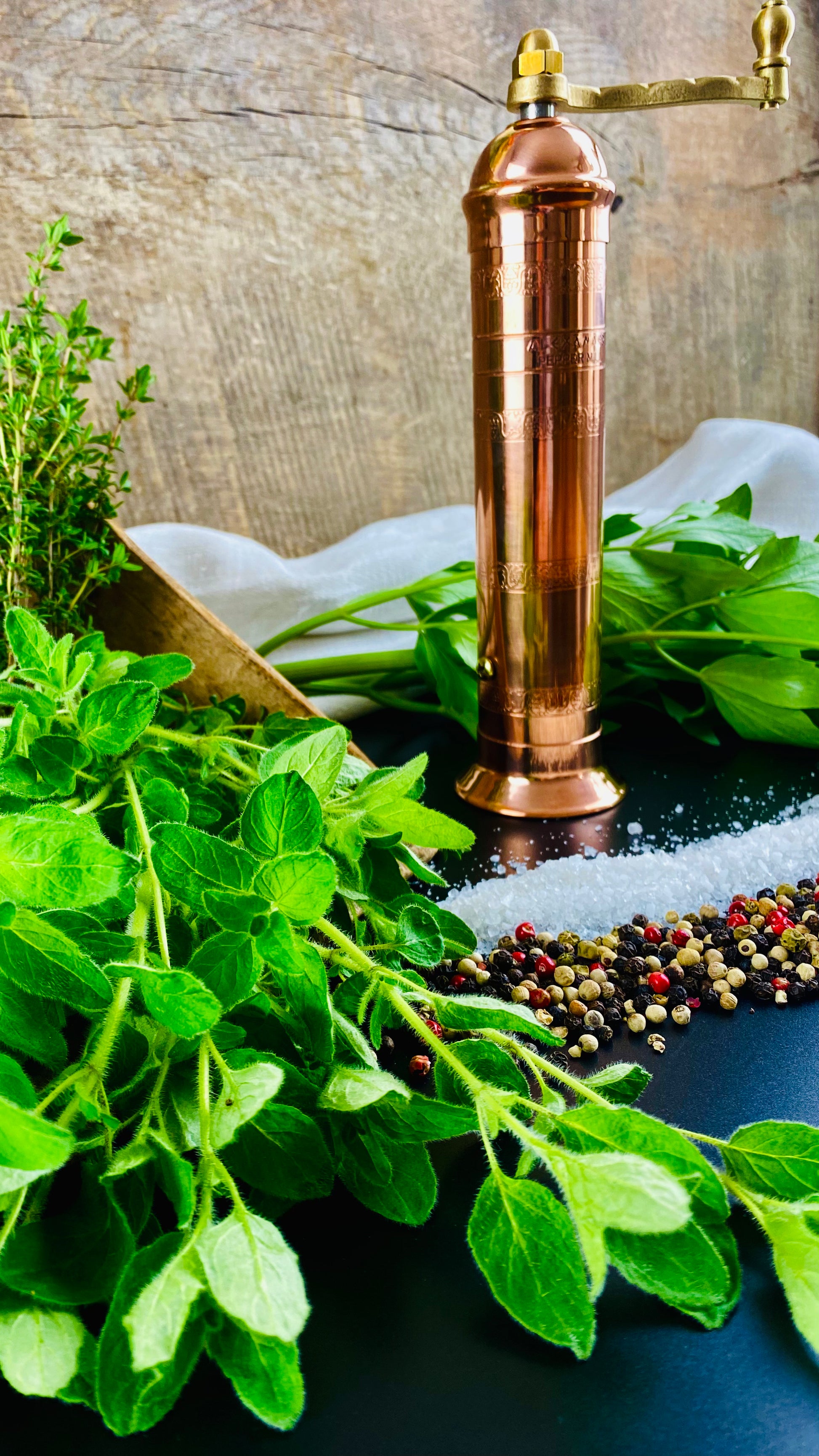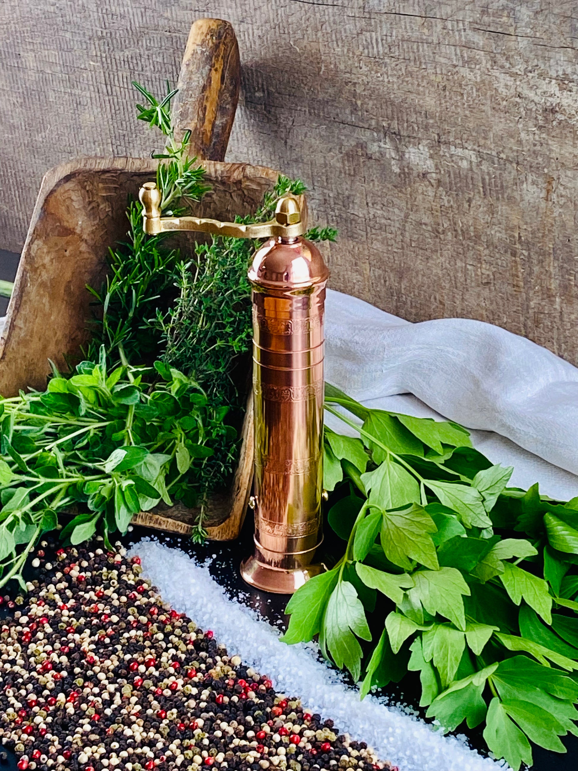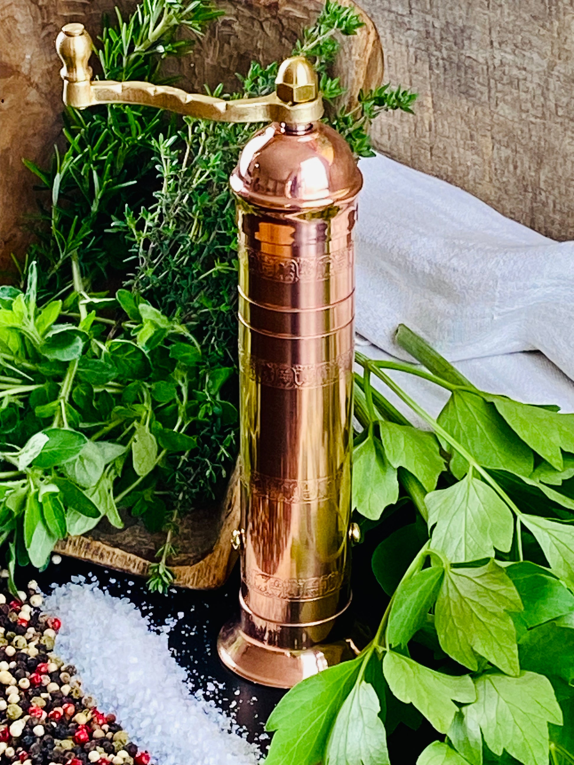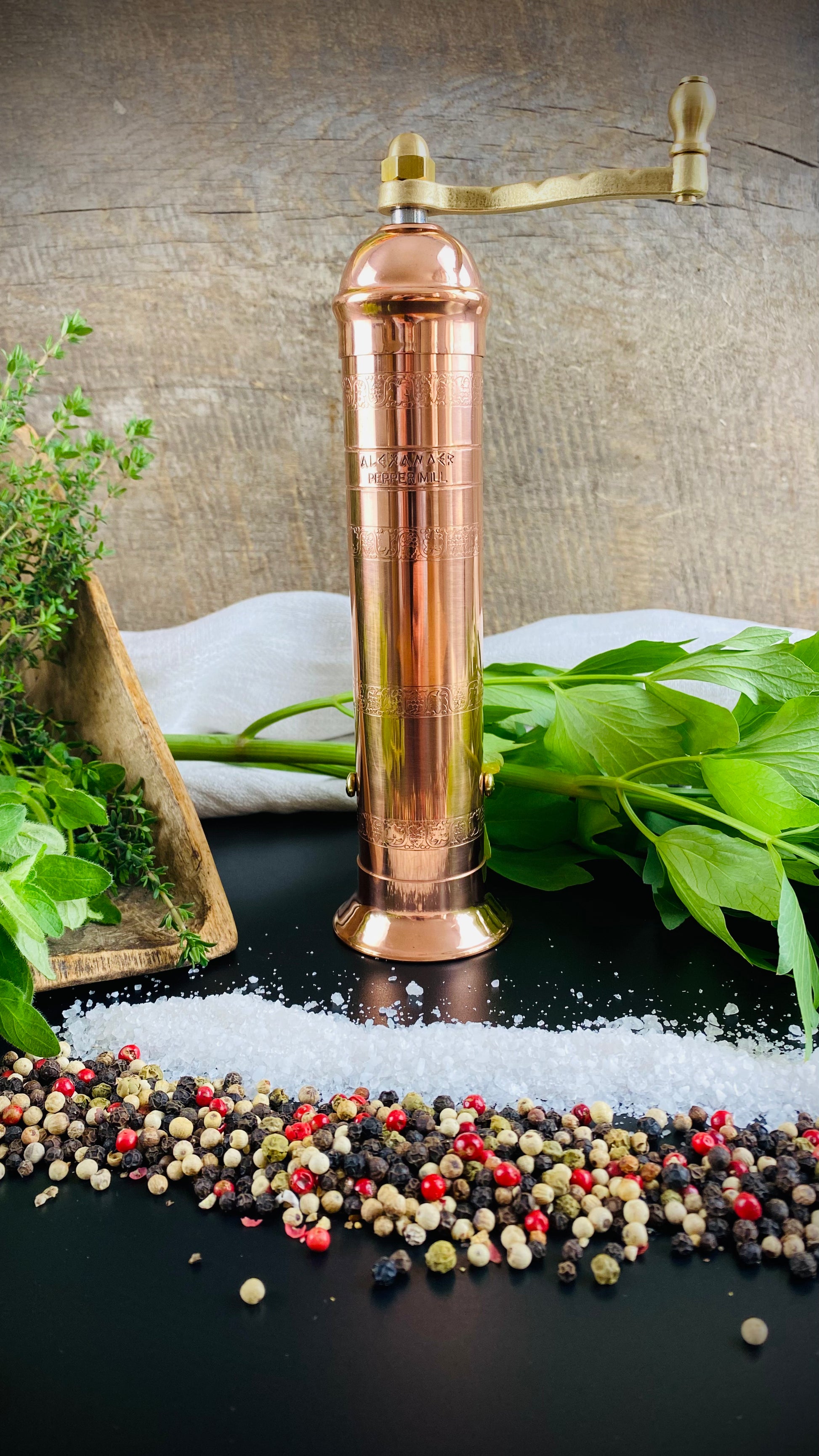 High-quality spice mill, handmade from copper. The mill weighs approximately 230 g, is approximately 23 cm high, and has a diameter of approximately 5.5 cm. It is made of solid copper and features a cast iron grinder for perfectly grinding your spices. The mill is not decorated.