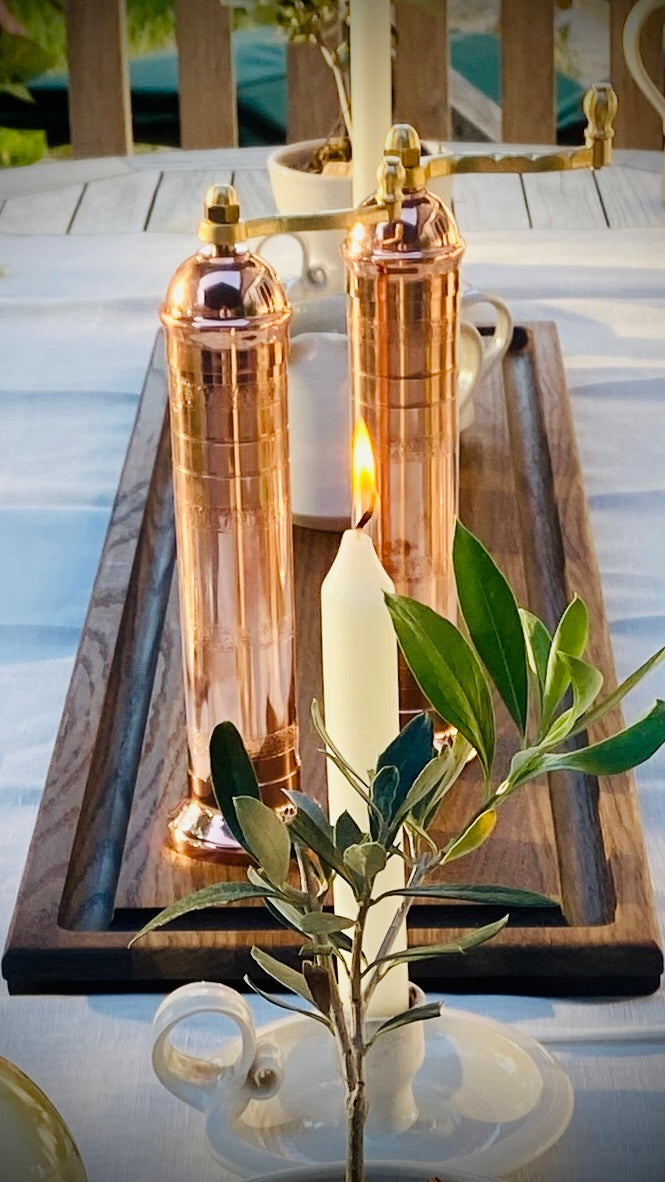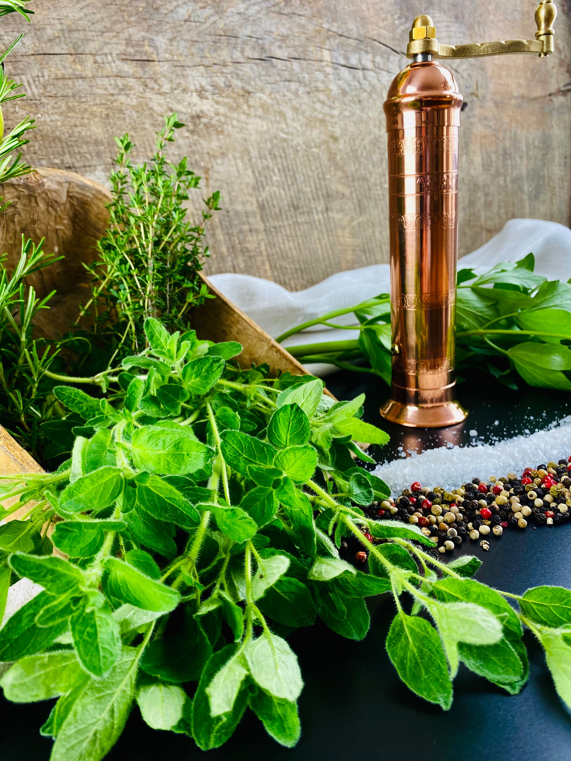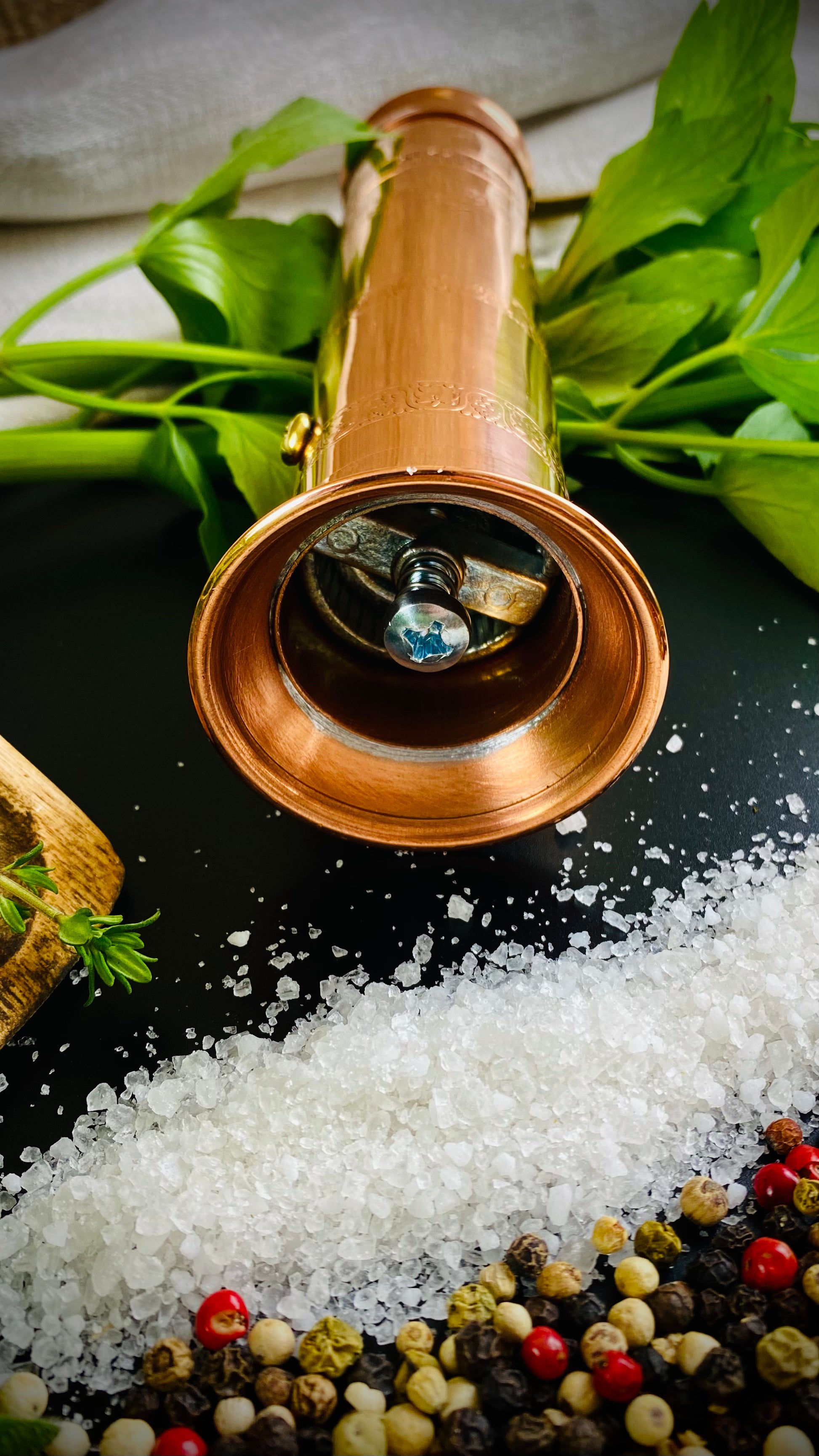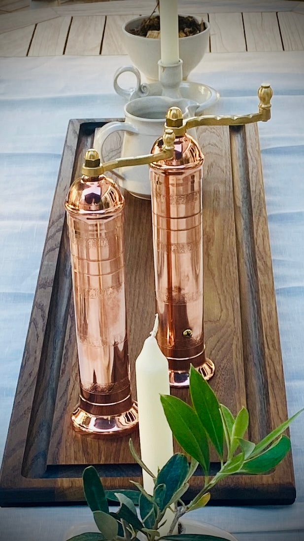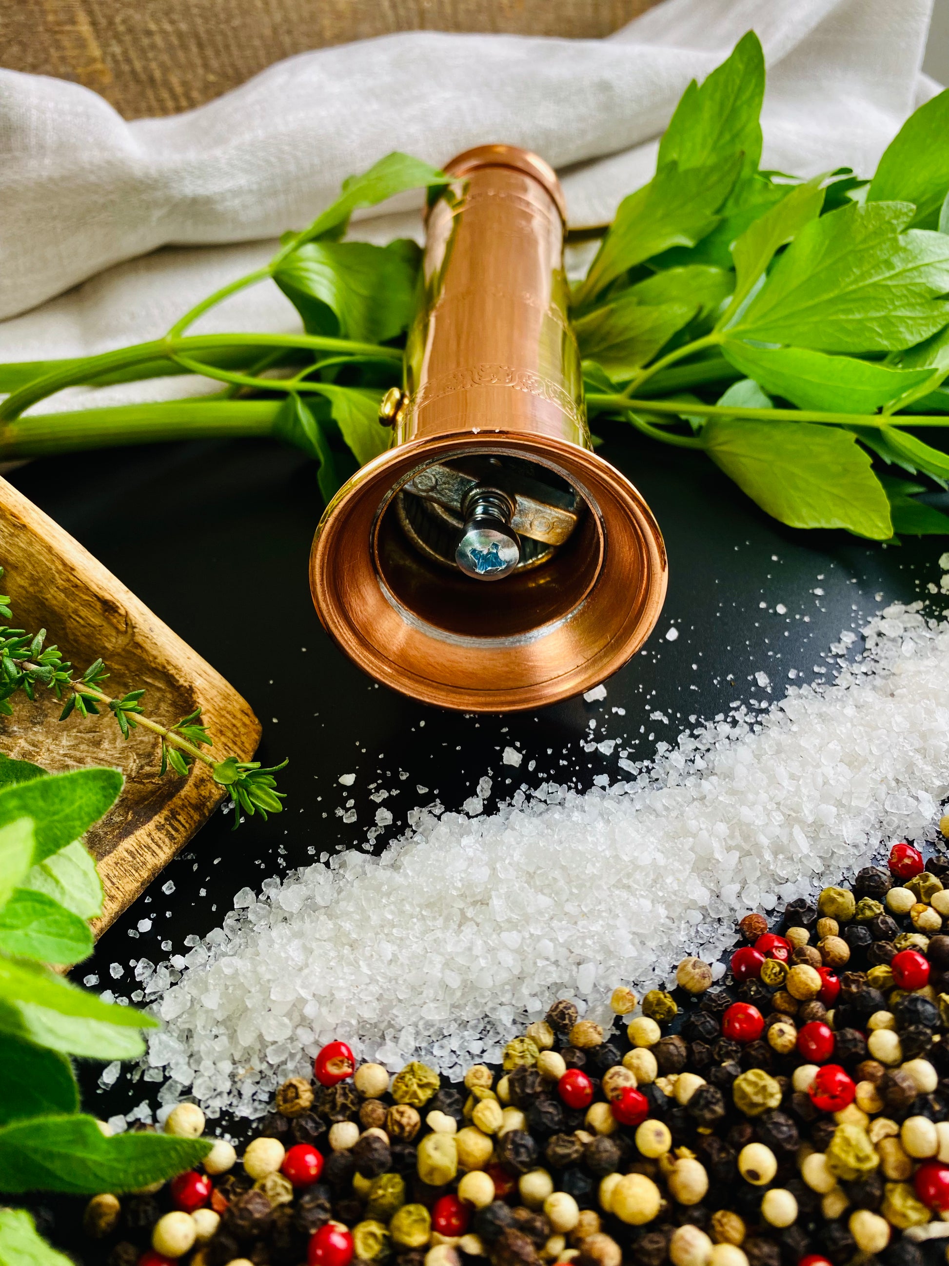 High-quality spice mill, handmade from copper. The mill weighs approximately 230 g, is approximately 23 cm high, and has a diameter of approximately 5.5 cm. It is made of solid copper and features a cast iron grinder for perfectly grinding your spices. The mill is not decorated.