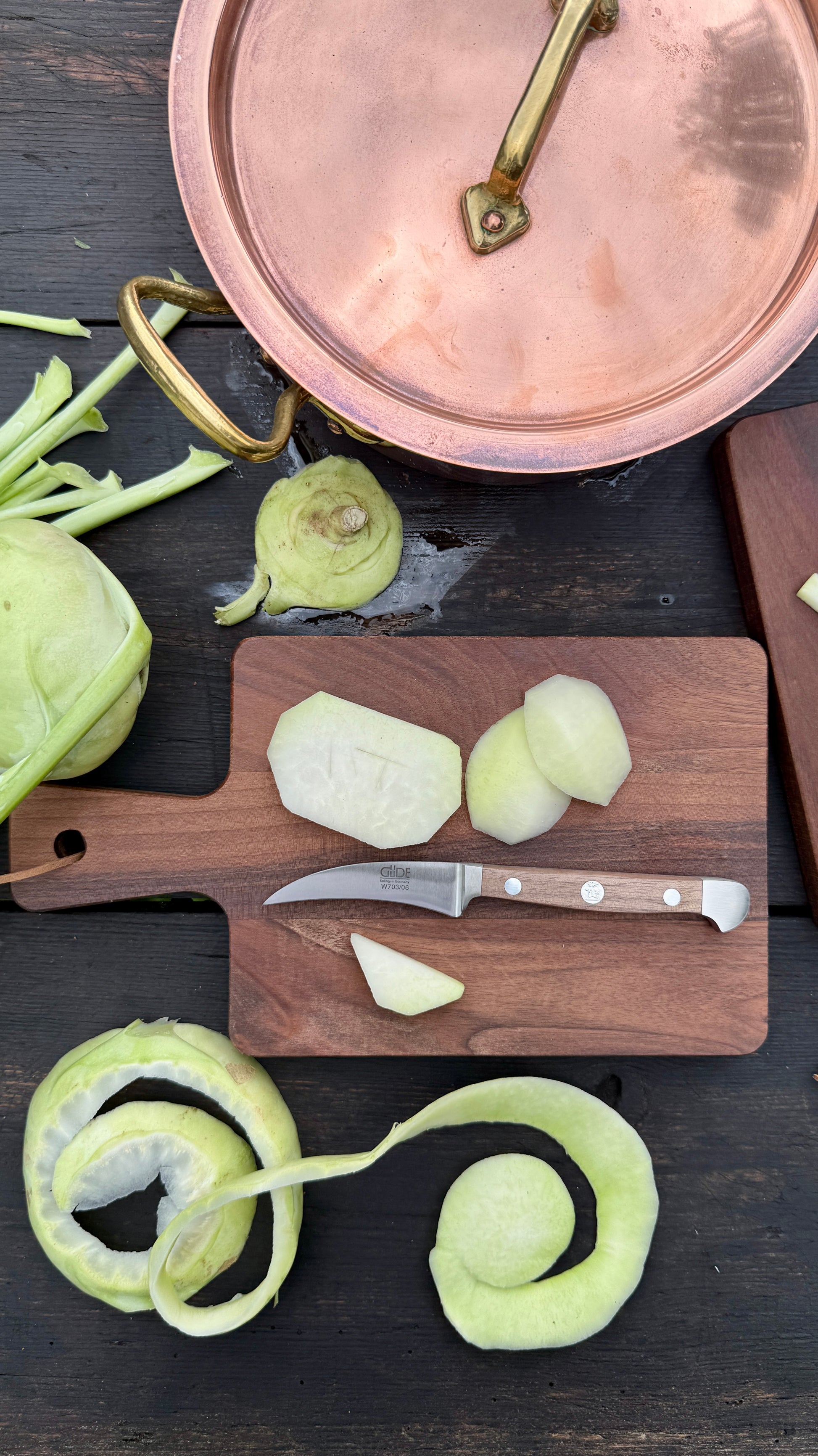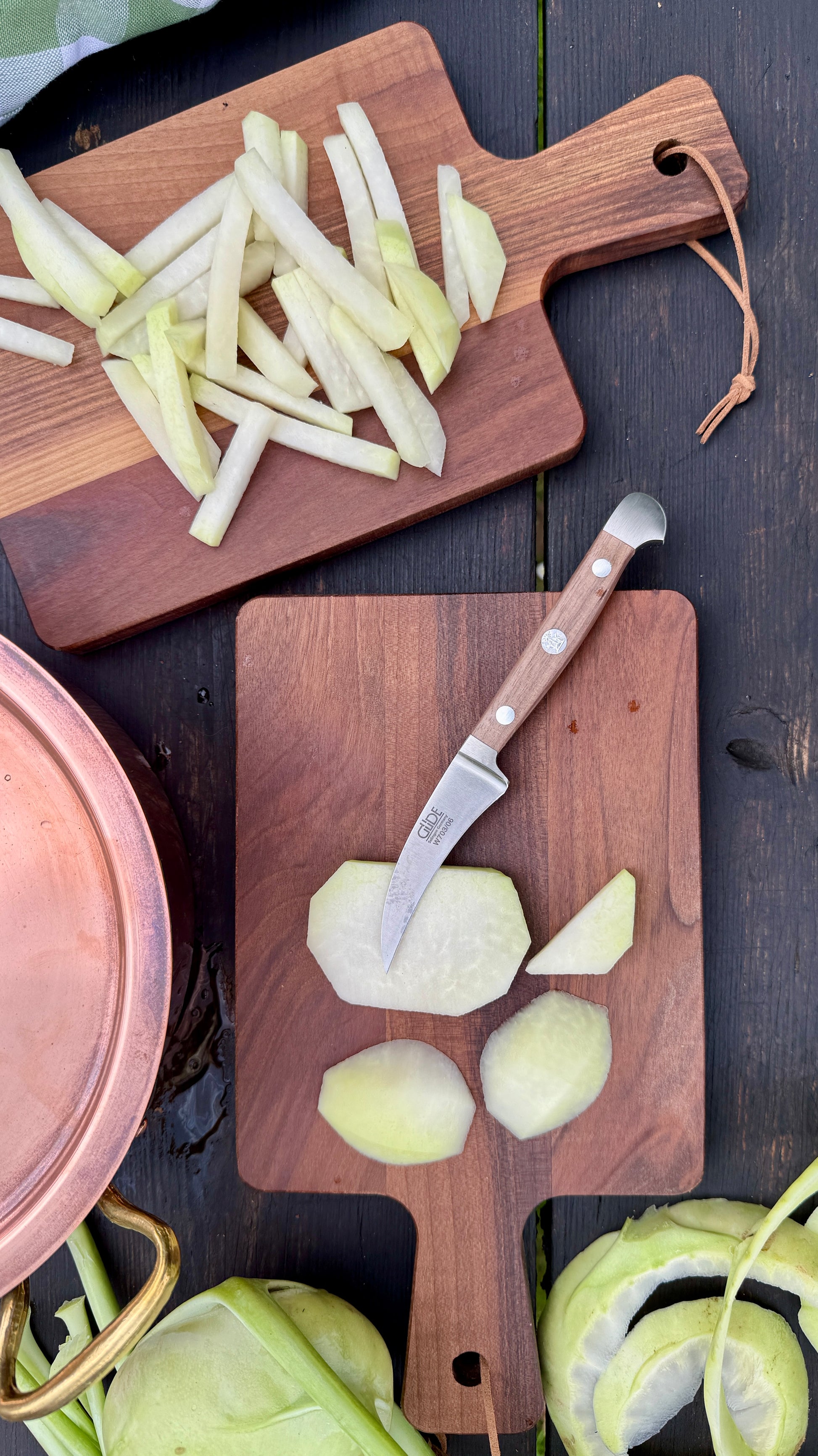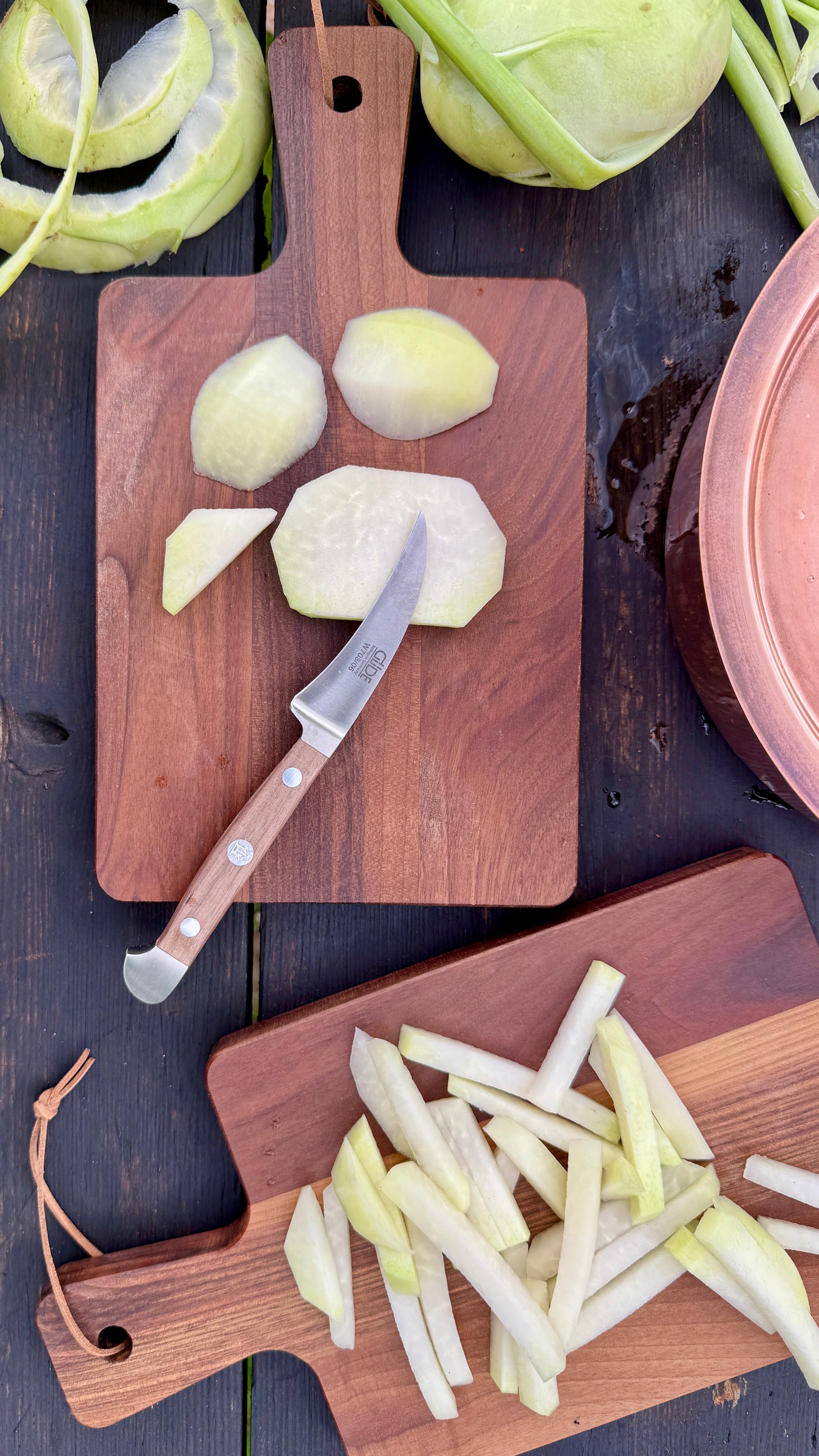 The paring knife from Güde's Alpha Walnut series is a handcrafted masterpiece of Solingen-based blacksmithing. With its short, curved blade, it's ideal for peeling, cleaning, and processing fruit and vegetables. The combination of high-quality steel and fine walnut wood represents outstanding functionality and timeless elegance.