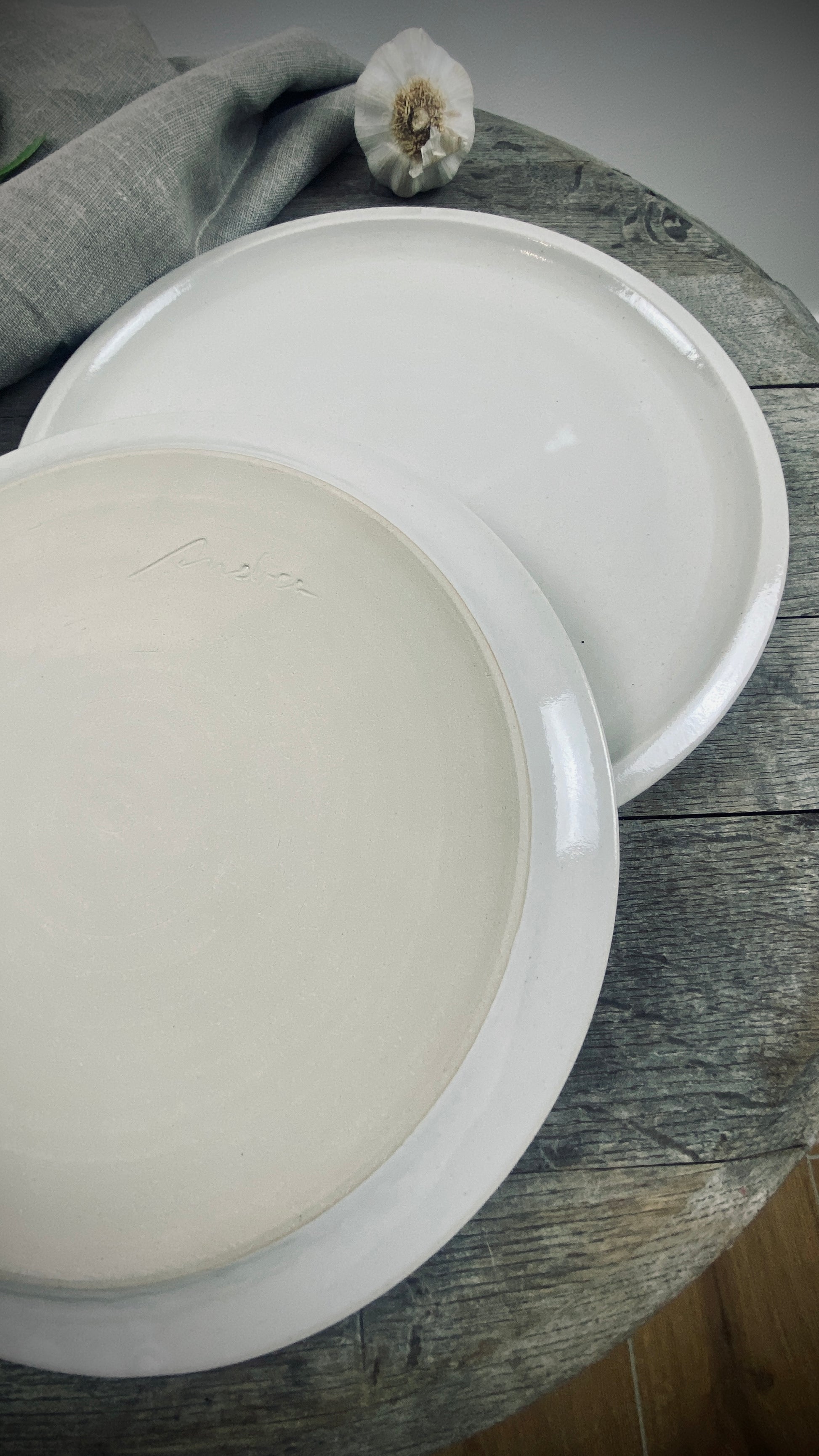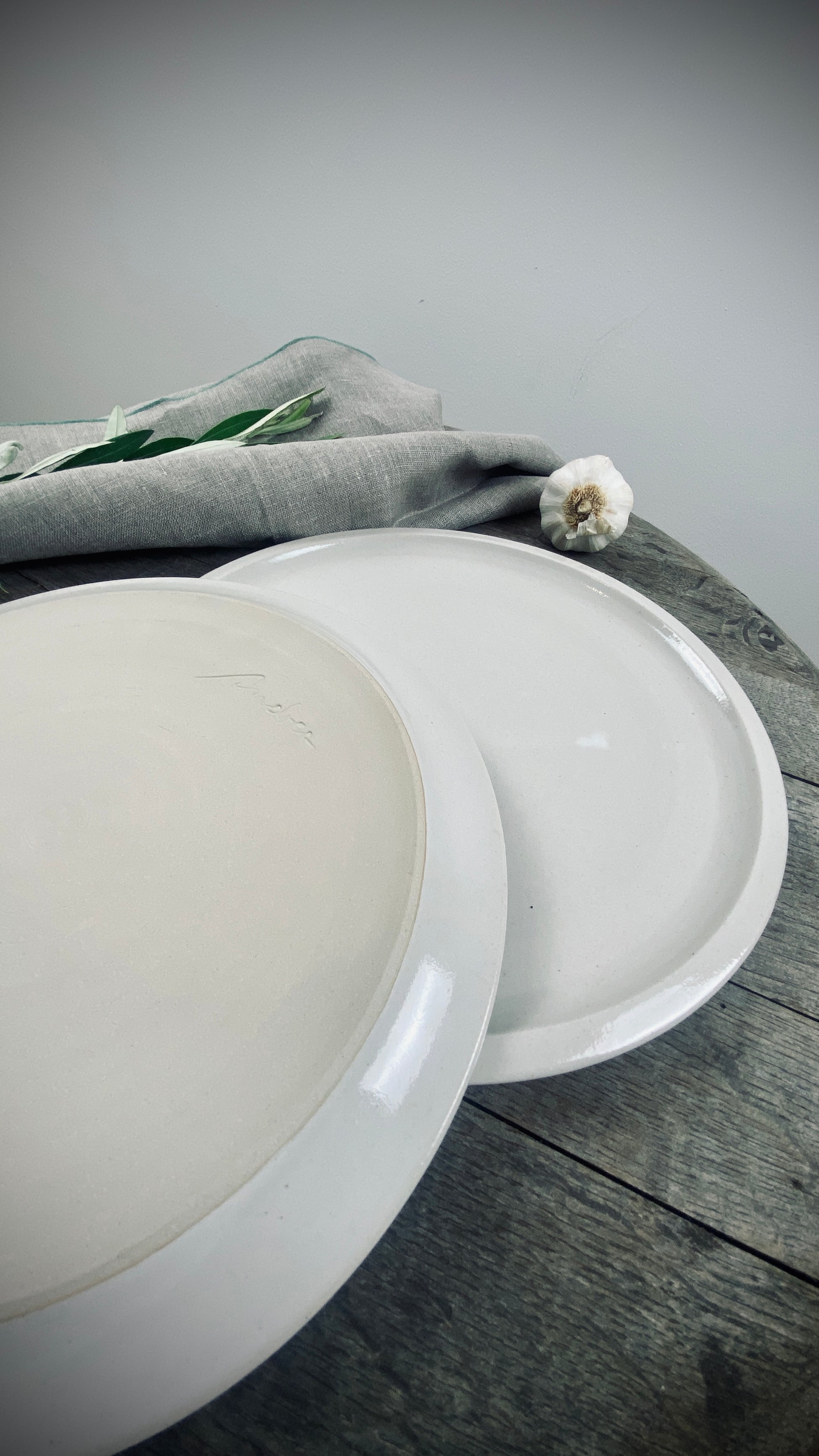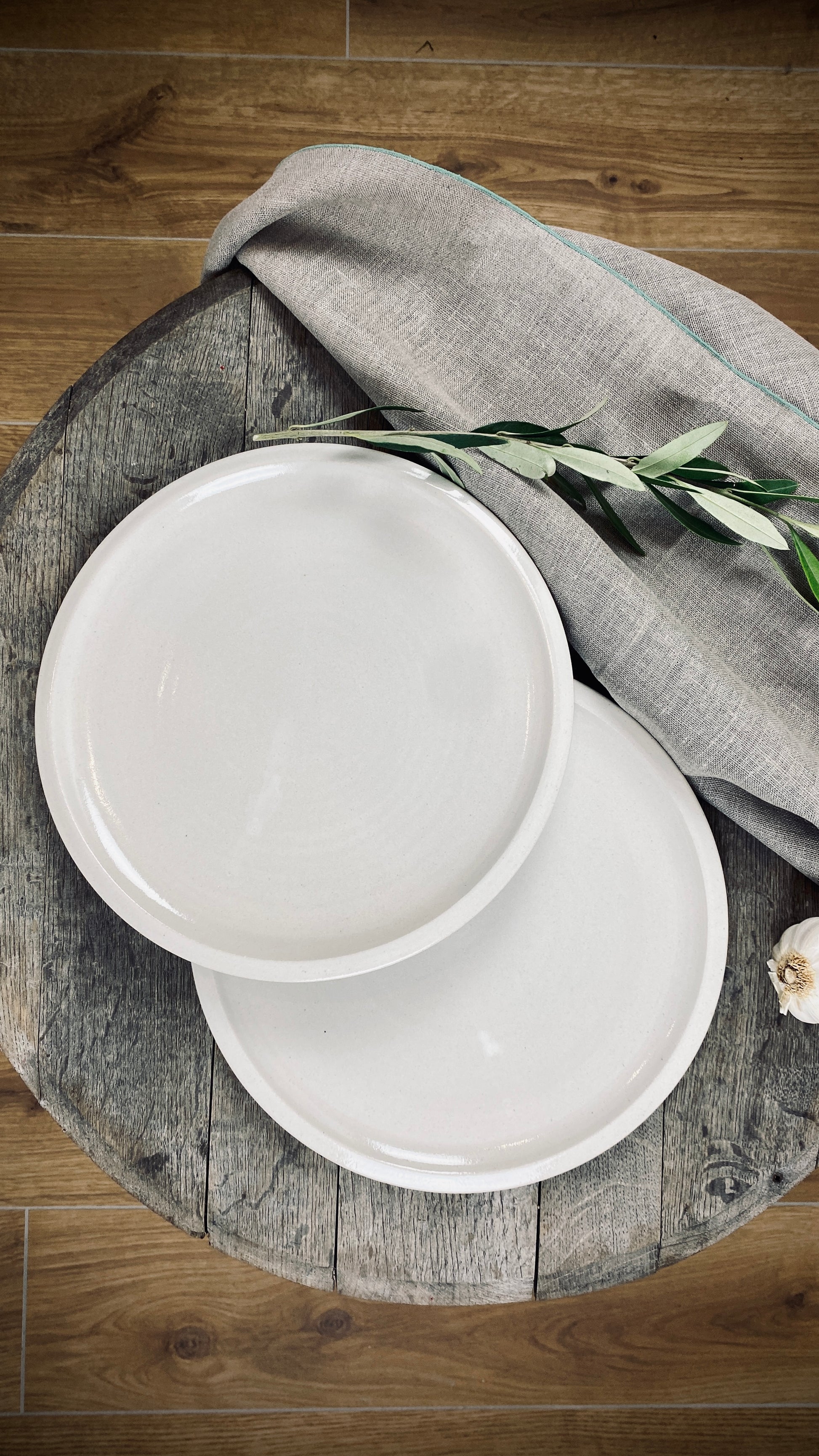 Our hand-thrown Classic tableware set of two, featuring two large dinner plates, each approximately 28 cm in diameter and 2 cm high, will delight you and your guests. The smooth, cream-colored glaze gives the plates a pleasant texture and allows the food to stand out.