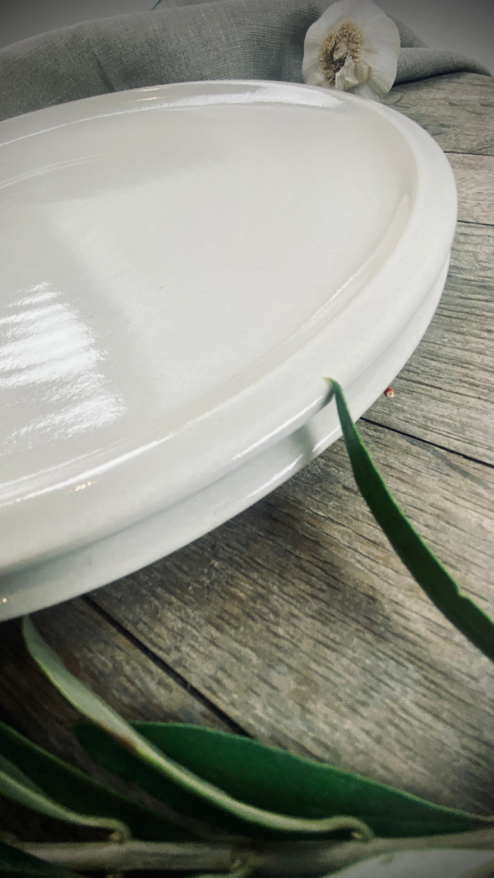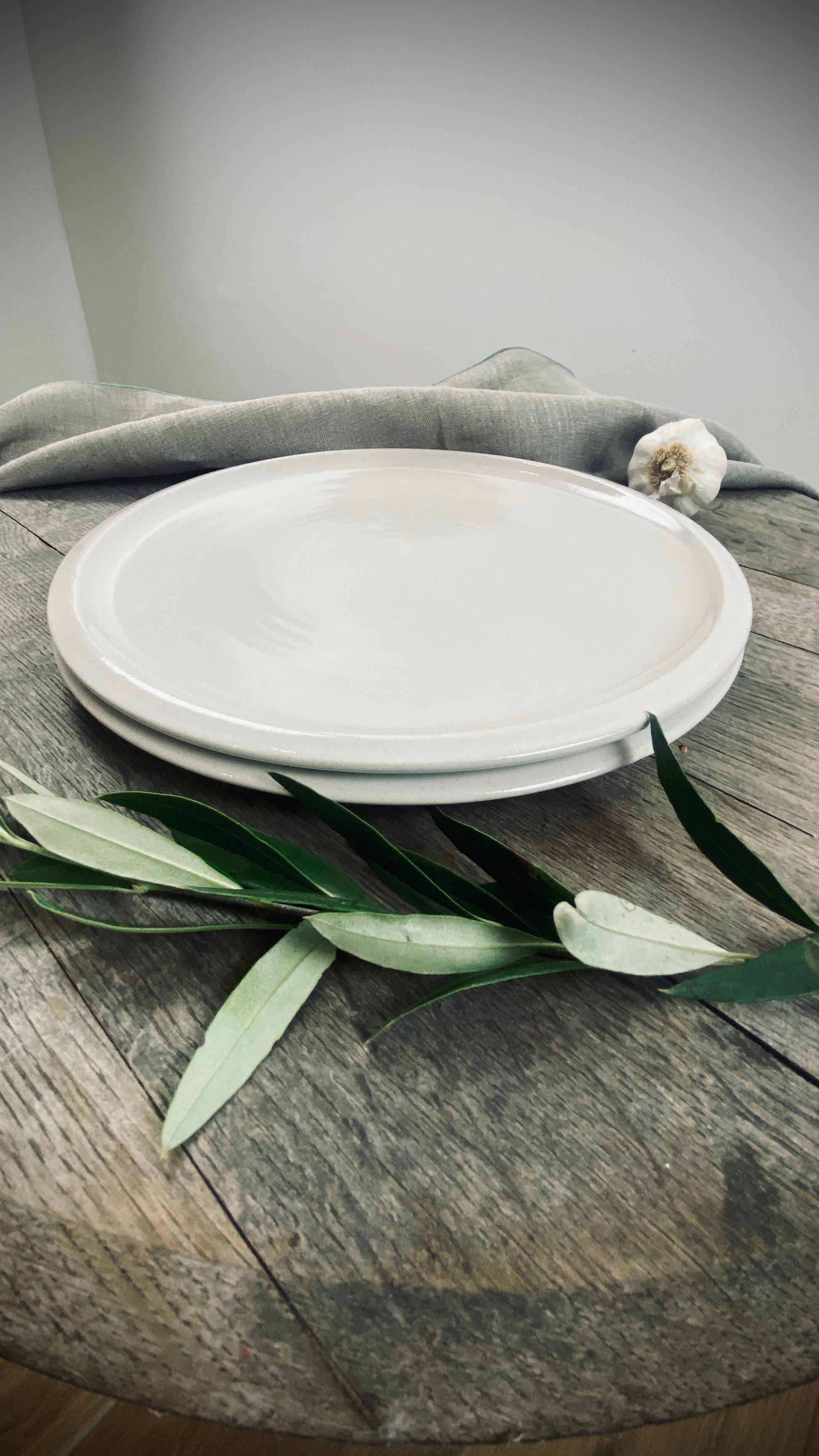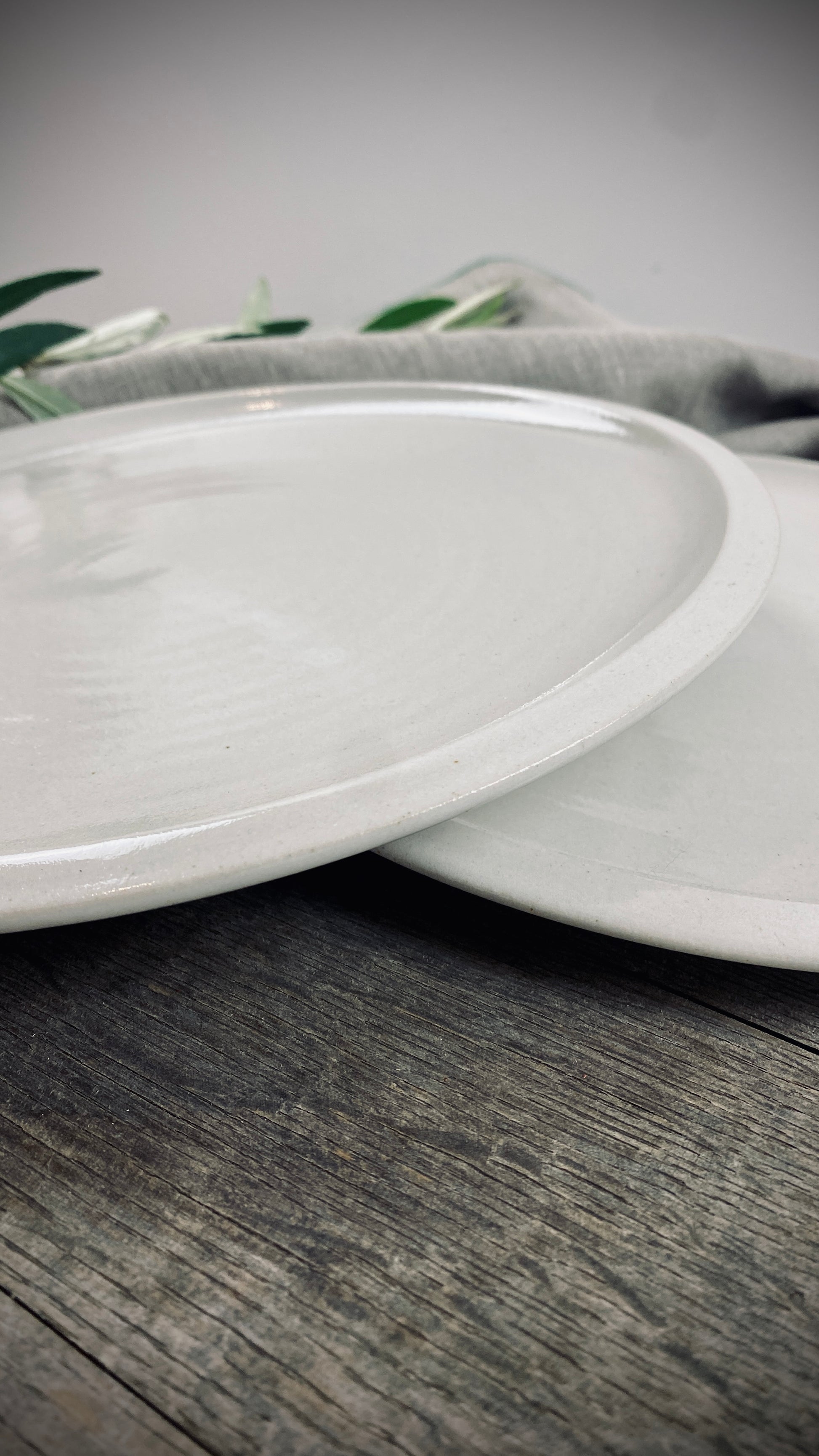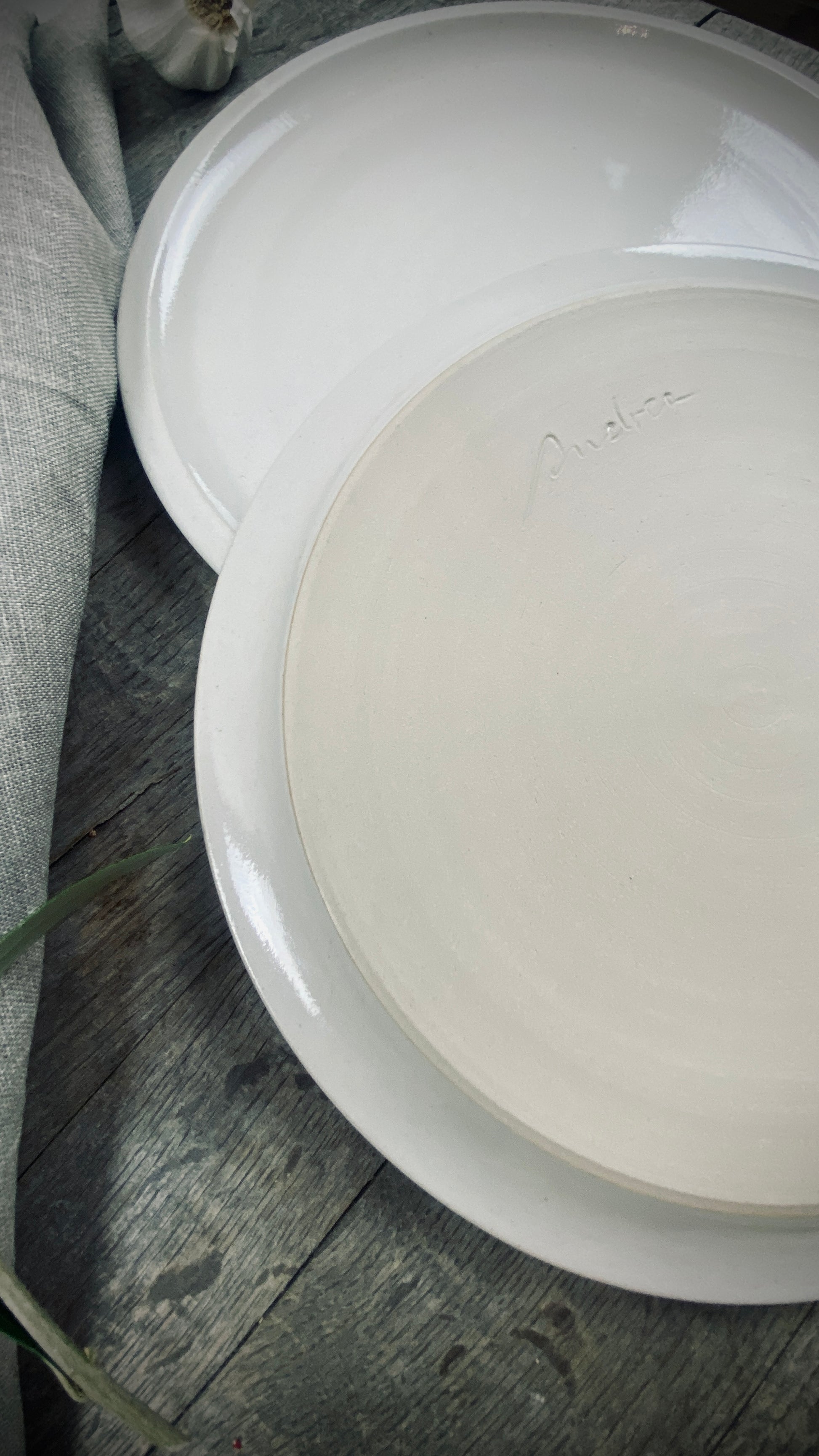 Our hand-thrown Classic tableware set of two, featuring two large dinner plates, each approximately 28 cm in diameter and 2 cm high, will delight you and your guests. The smooth, cream-colored glaze gives the plates a pleasant texture and allows the food to stand out.