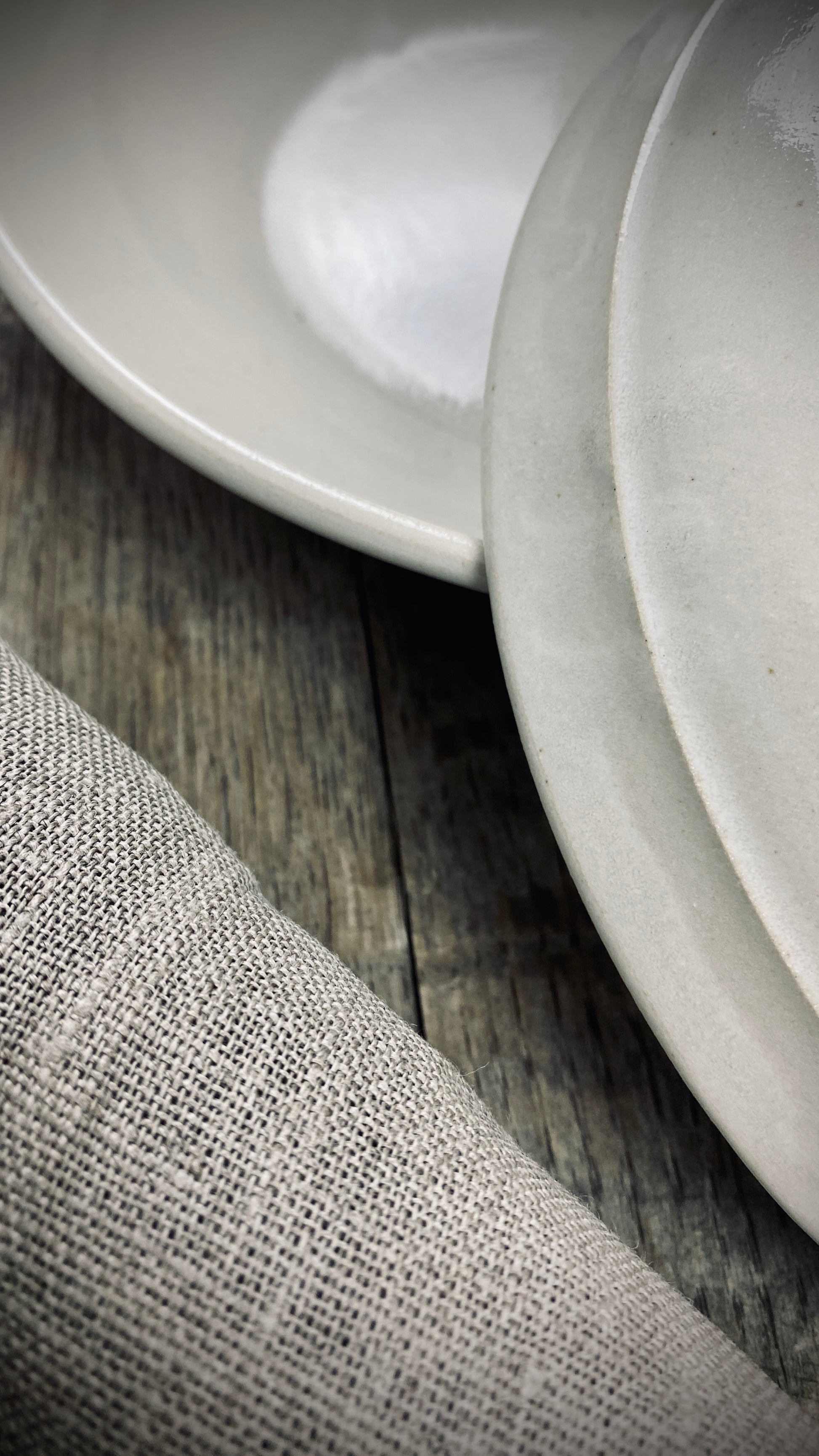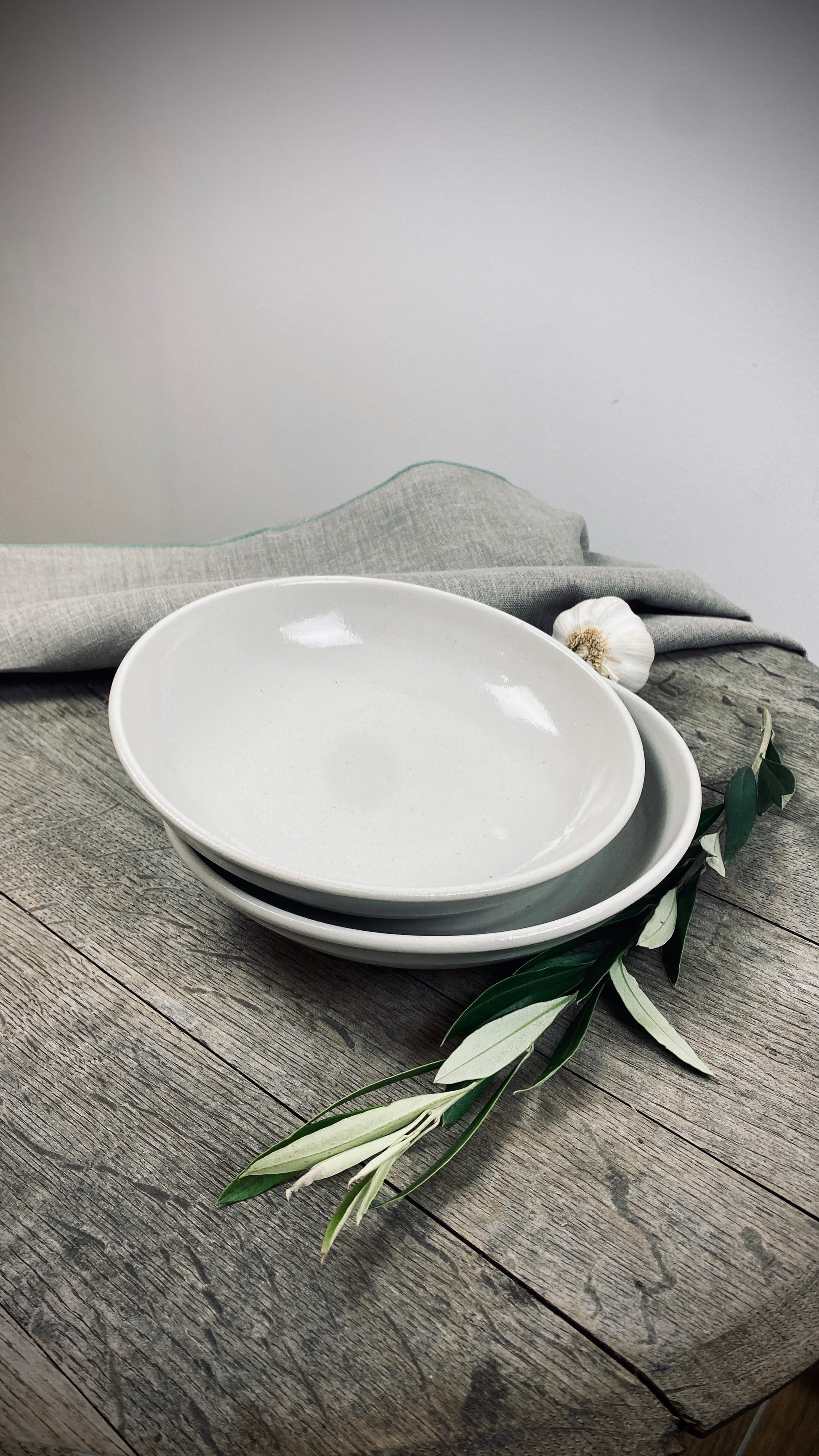Our hand-thrown Classic tableware set of two, featuring two deep plates with a diameter of approximately 21 cm and a slightly curved shape with a height of approximately 5 cm and a capacity of approximately 500 ml, will delight you and your guests. The smooth, cream-colored glaze gives the plates a pleasant texture and allows the food to stand out.