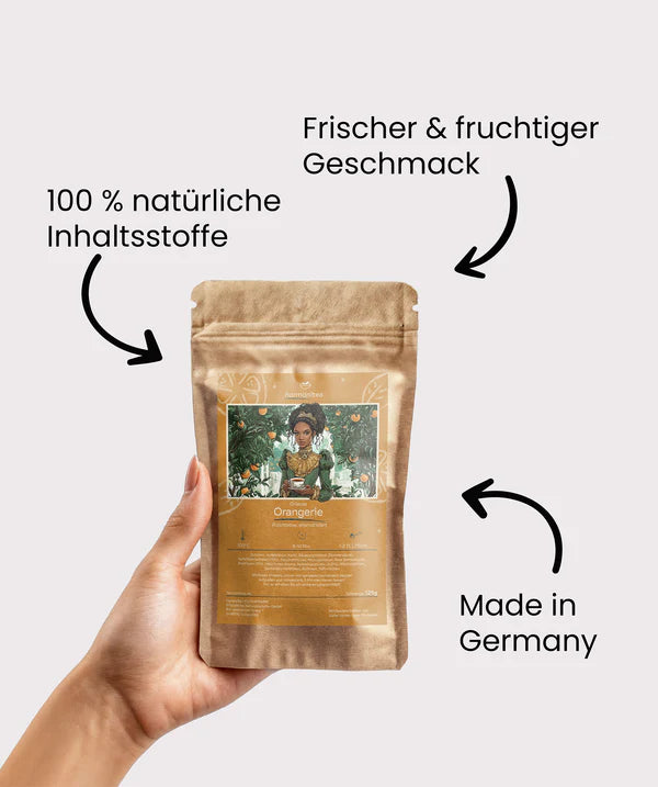 Sonnige Zitrusfrische, sanfte Kräuternoten und eine Spur mediterraner Gelassenheit: Orianas Orangerie vereint fruchtige Apfelsine mit feinem Basilikum und ausgewählten Blüten zu einem erfrischend-entspannten Früchtetee. Perfekt für Momente, die nach Leichtigkeit, Sommer und einem Hauch Urlaub schmecken.