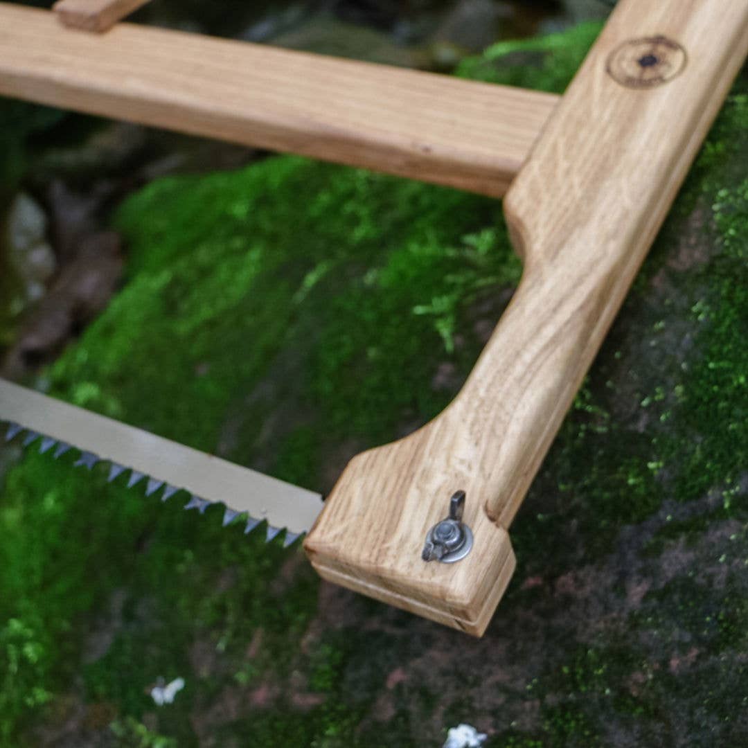 Handcrafted beechwood folding saw. Used for sawing firewood in the wilderness, a great tool for bushcraft, woodworking, and carving. Features: - The frame folds to cover the saw blade and protect the user from the sharp teeth. - Ergonomic handle for comfort. - Compact design. - 21" saw blade with rake teeth Dimensions: Folded: 21" x 2" x 2" Assembled: 21" x 12" x 1"
