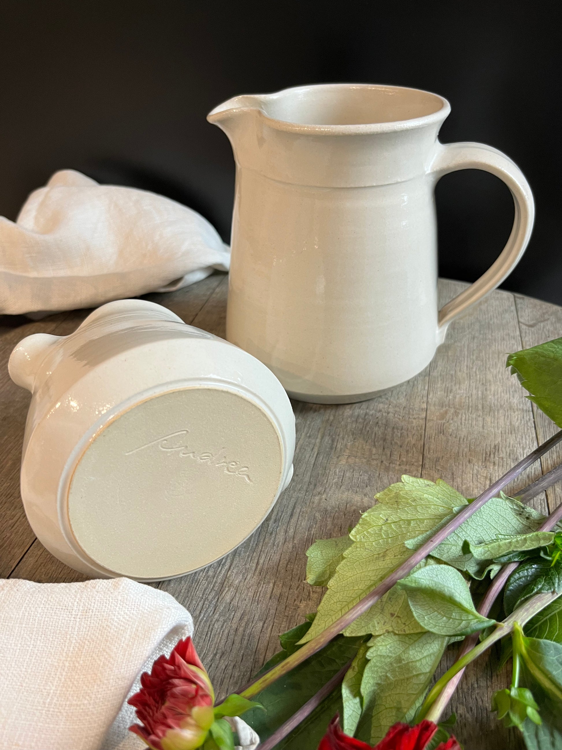 Immerse yourself in the world of craftsmanship with our exquisite set of two hand-thrown pitchers. These pitchers are not only practical vessels for your favorite beverages or for your table decoration, but also true works of art, crafted with attention to detail by our talented master ceramist Andrea Berger.
