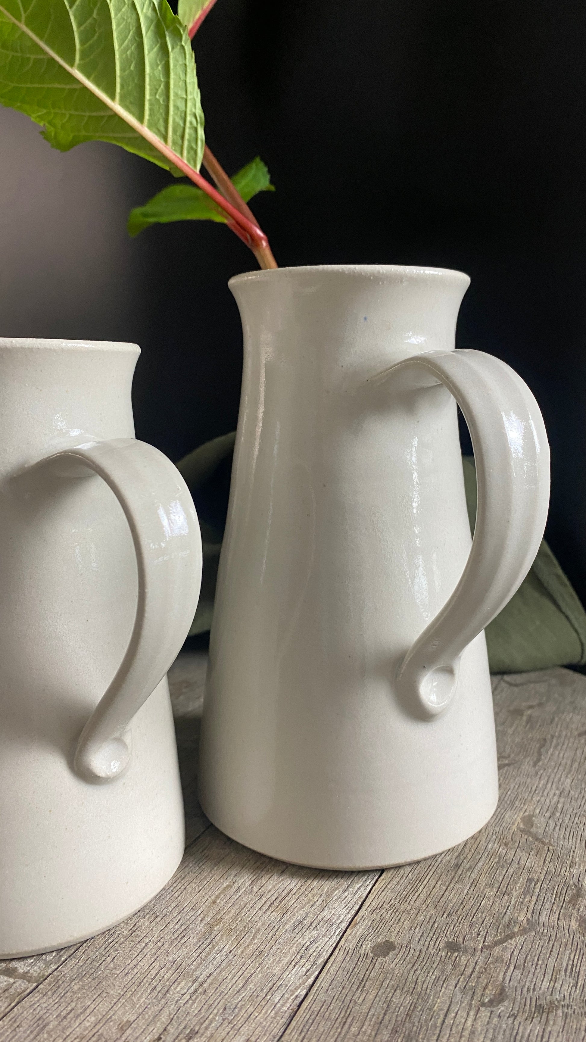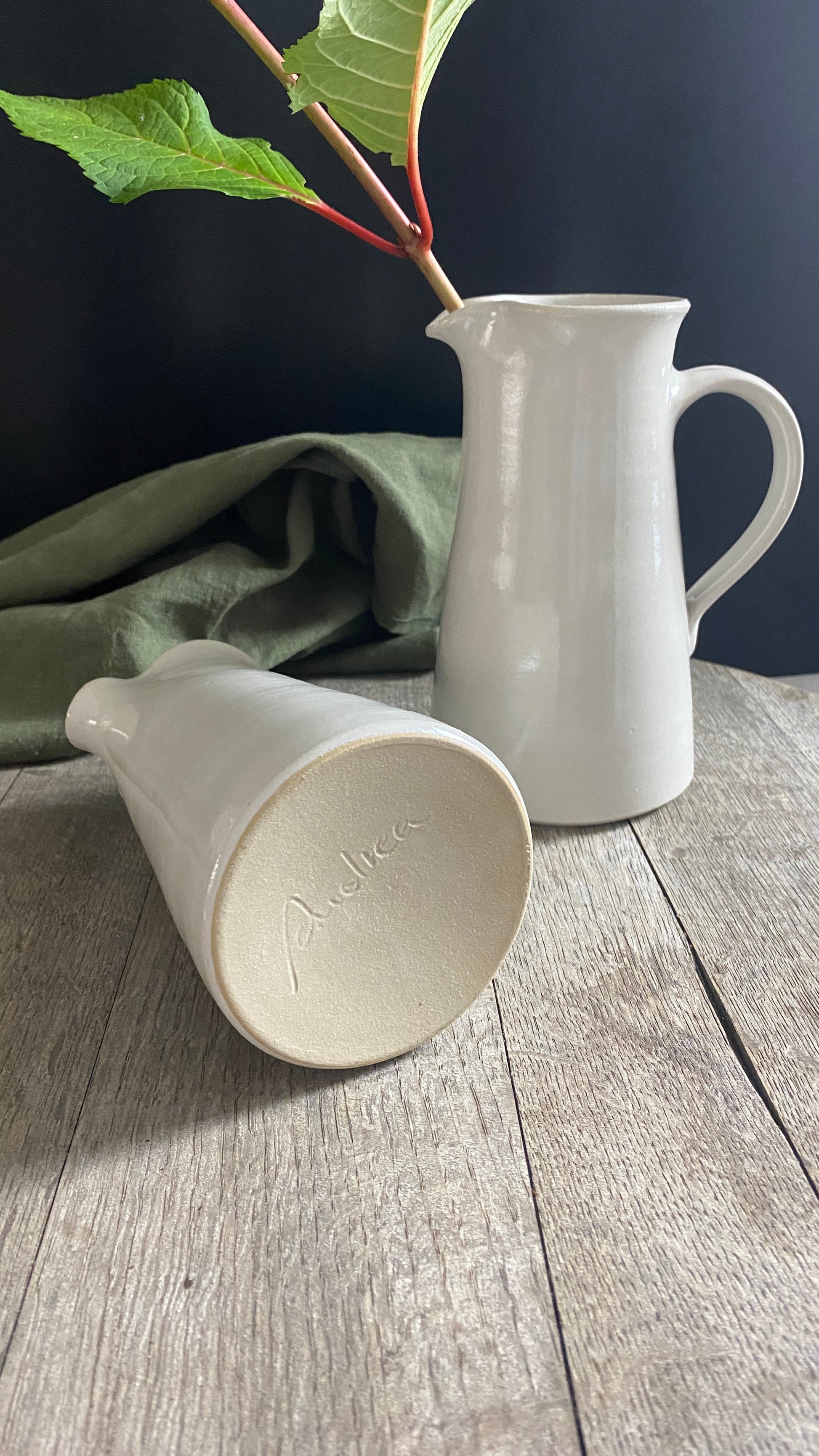Immerse yourself in the world of craftsmanship with our exquisite set of two hand-thrown pitchers. These pitchers are not only practical vessels for your favorite beverages or for your table decoration, but also true works of art, crafted with attention to detail by our talented master ceramist Andrea Berger.
