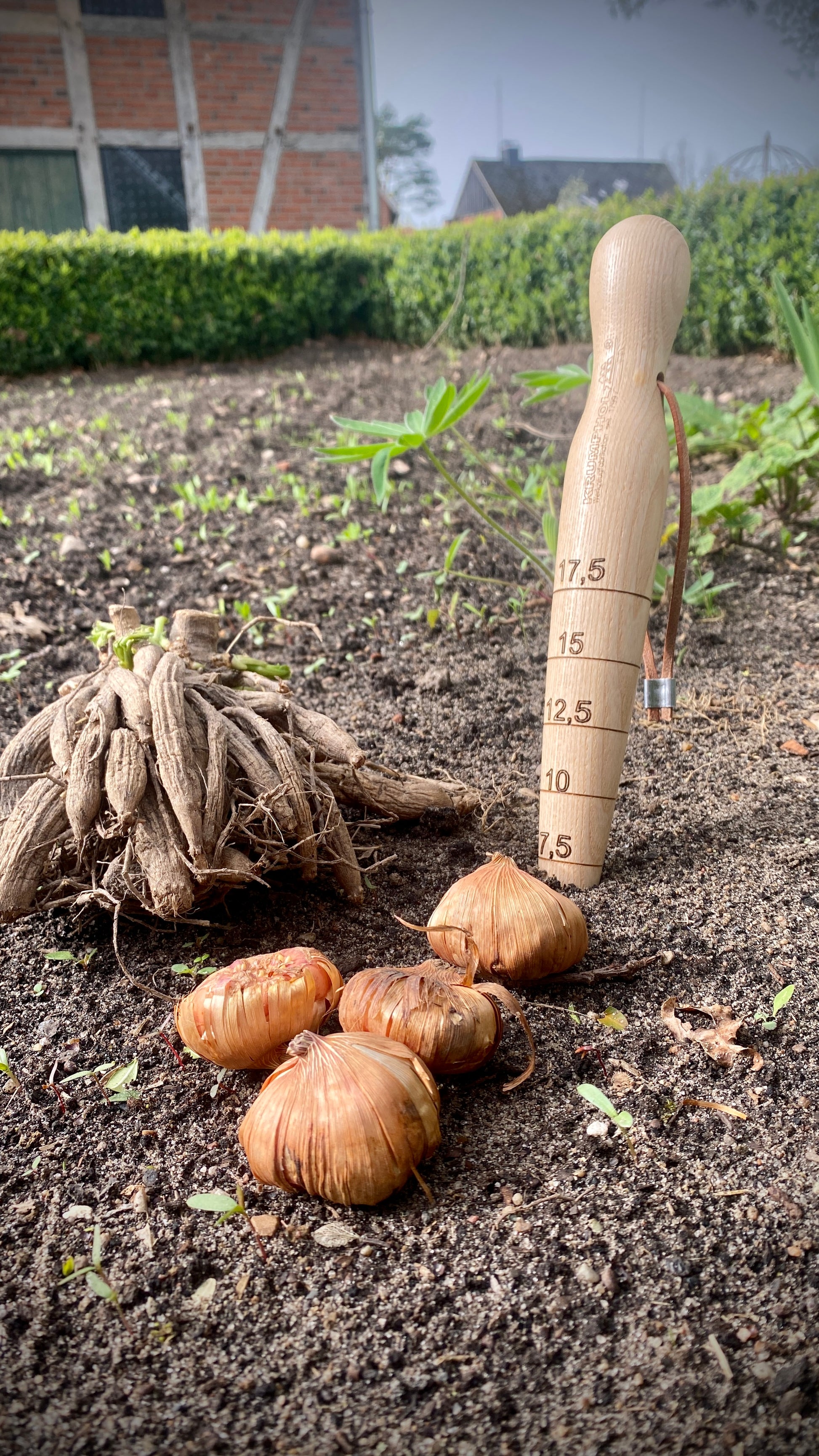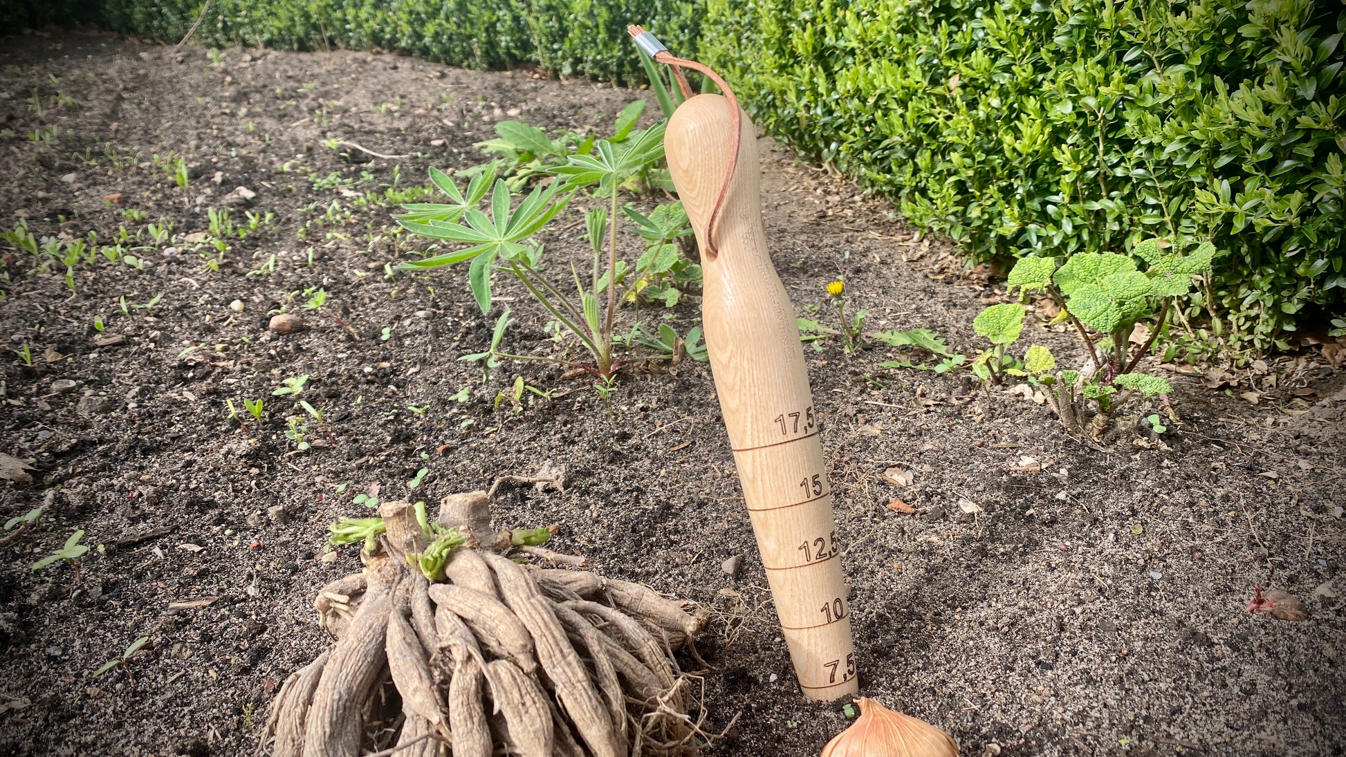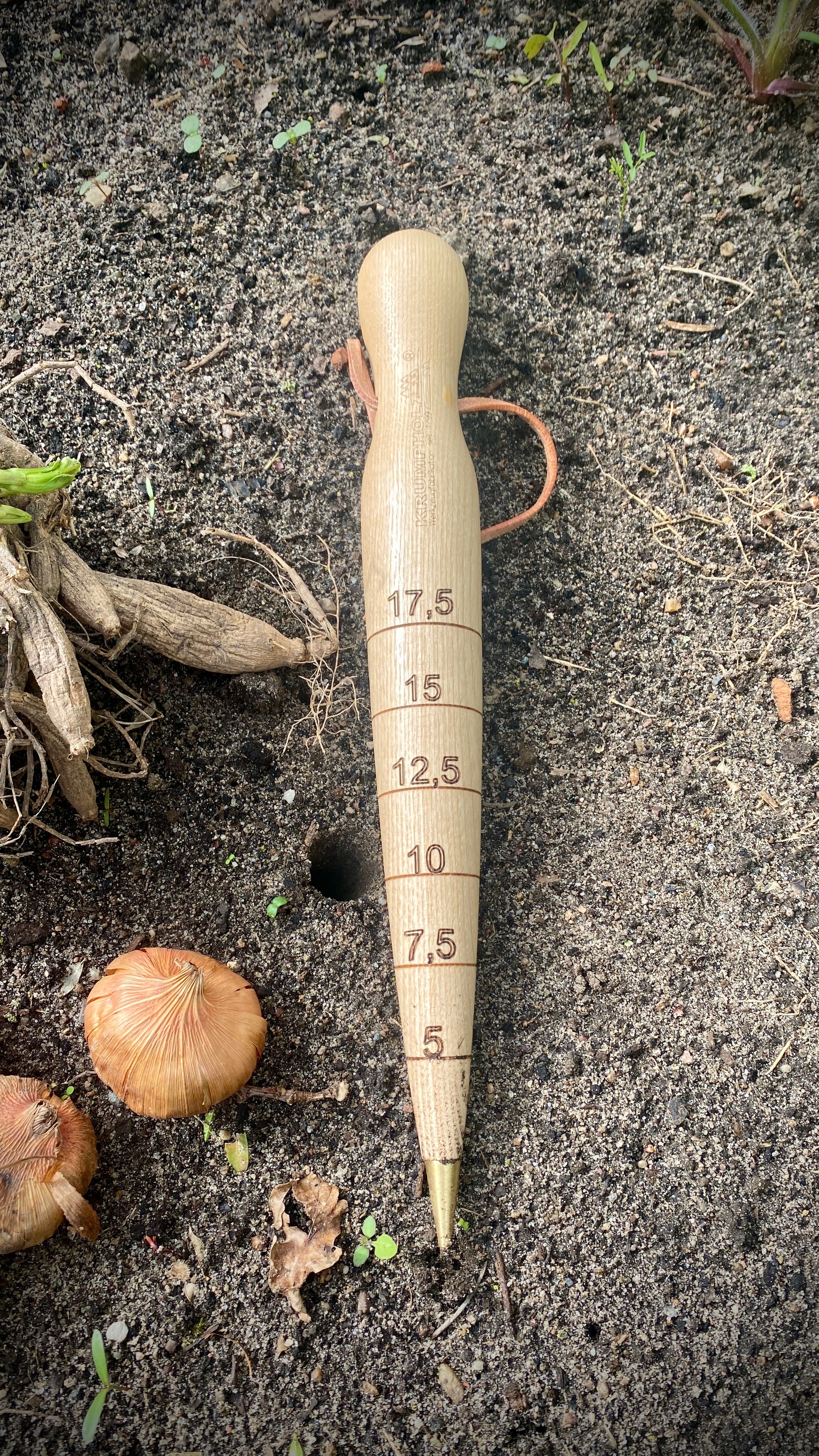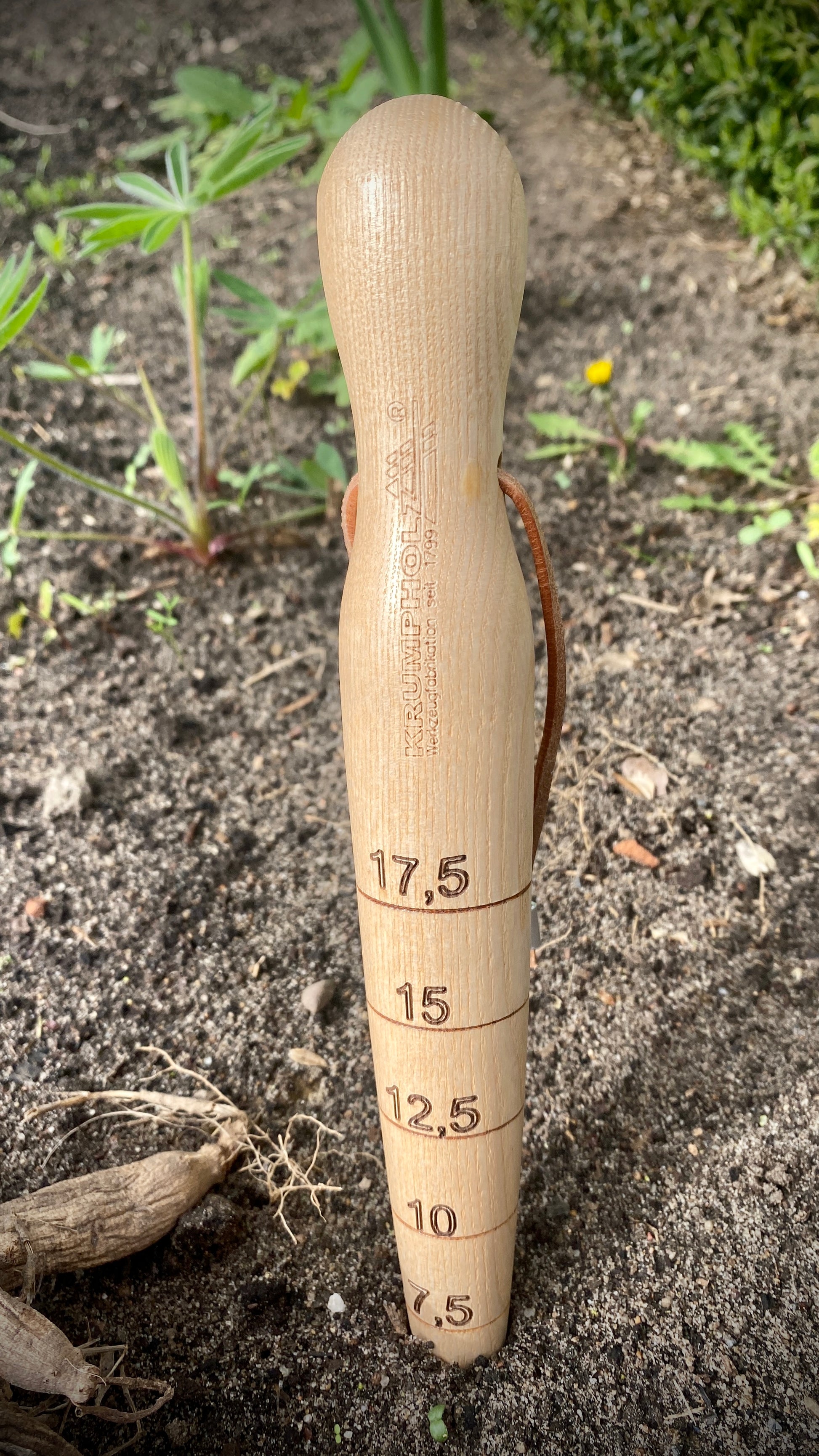 The robust brass tip allows for effortless penetration into the soil and protects the wood from moisture. An engraved centimeter scale precisely indicates the planting depth, while the ergonomic knob handle provides comfort even when gripping firmly. This classic gardening tool is crafted by a traditional blacksmith shop in Franconia.