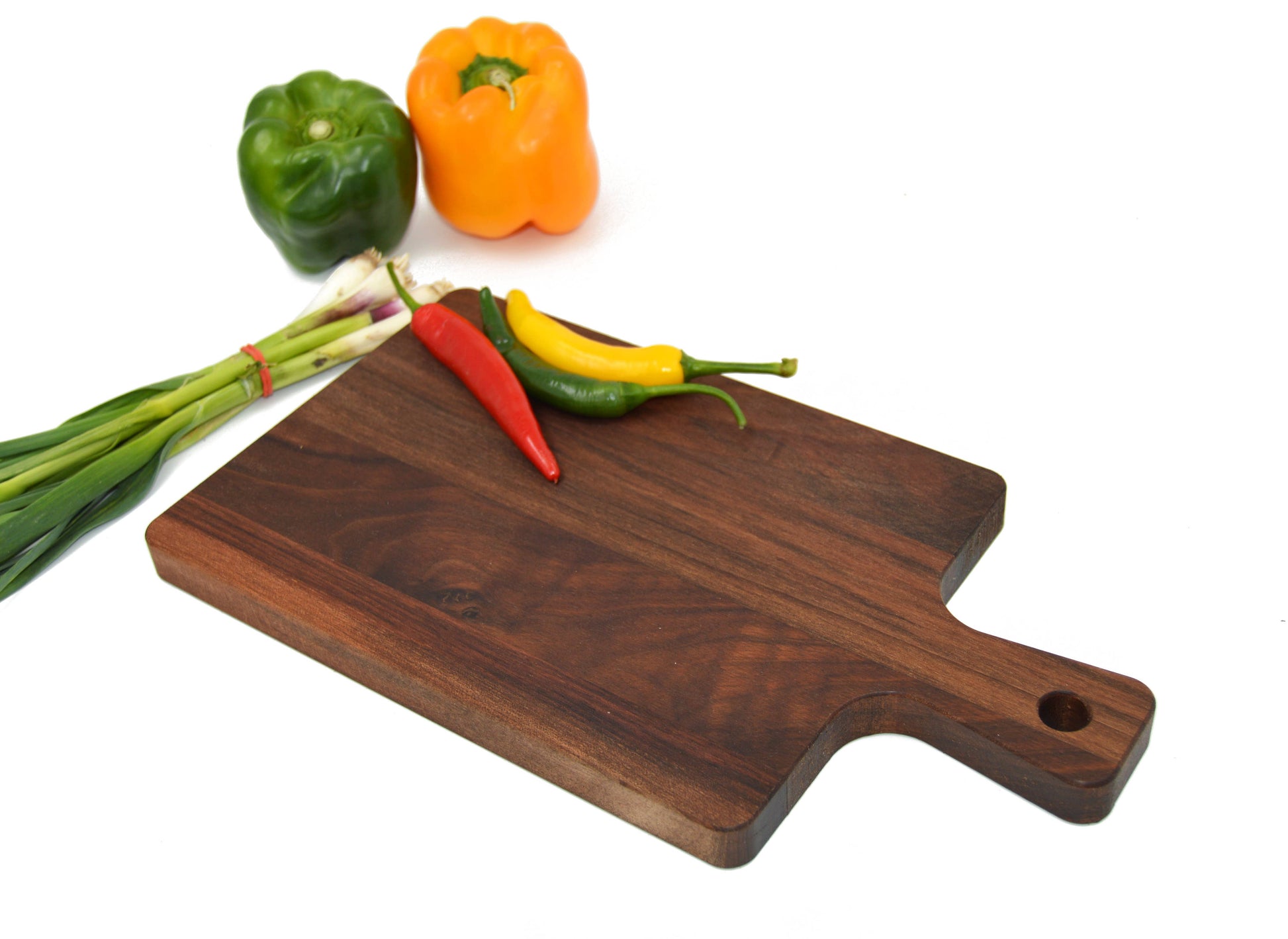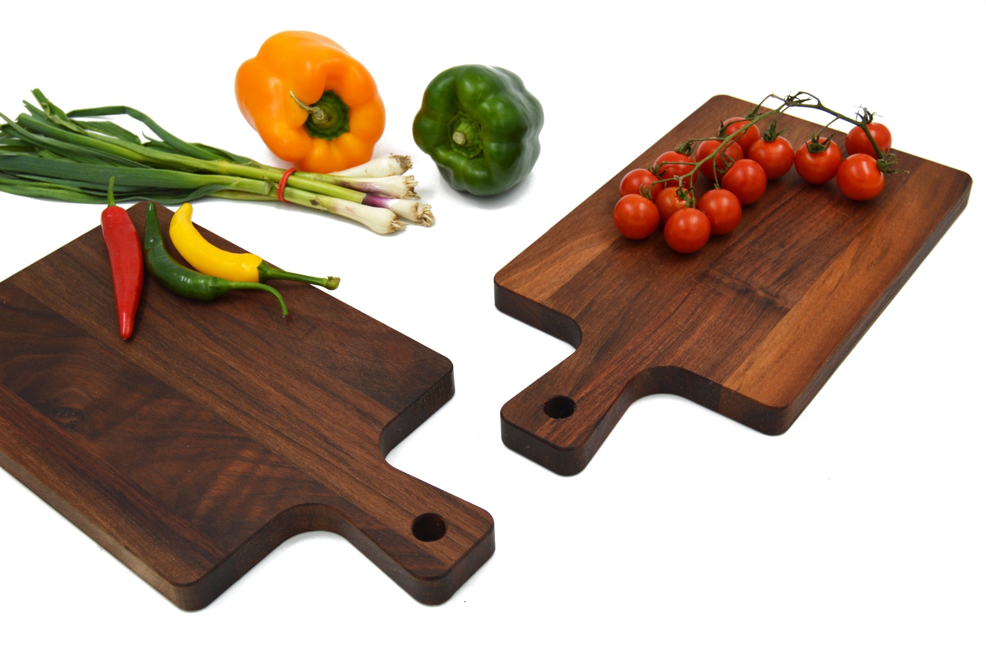 These boards are made of beech and walnut wood in beautiful, natural tones that are unique to each piece. They are finished with food-grade oil, which means each board varies in color. The size of the boards includes a handle.