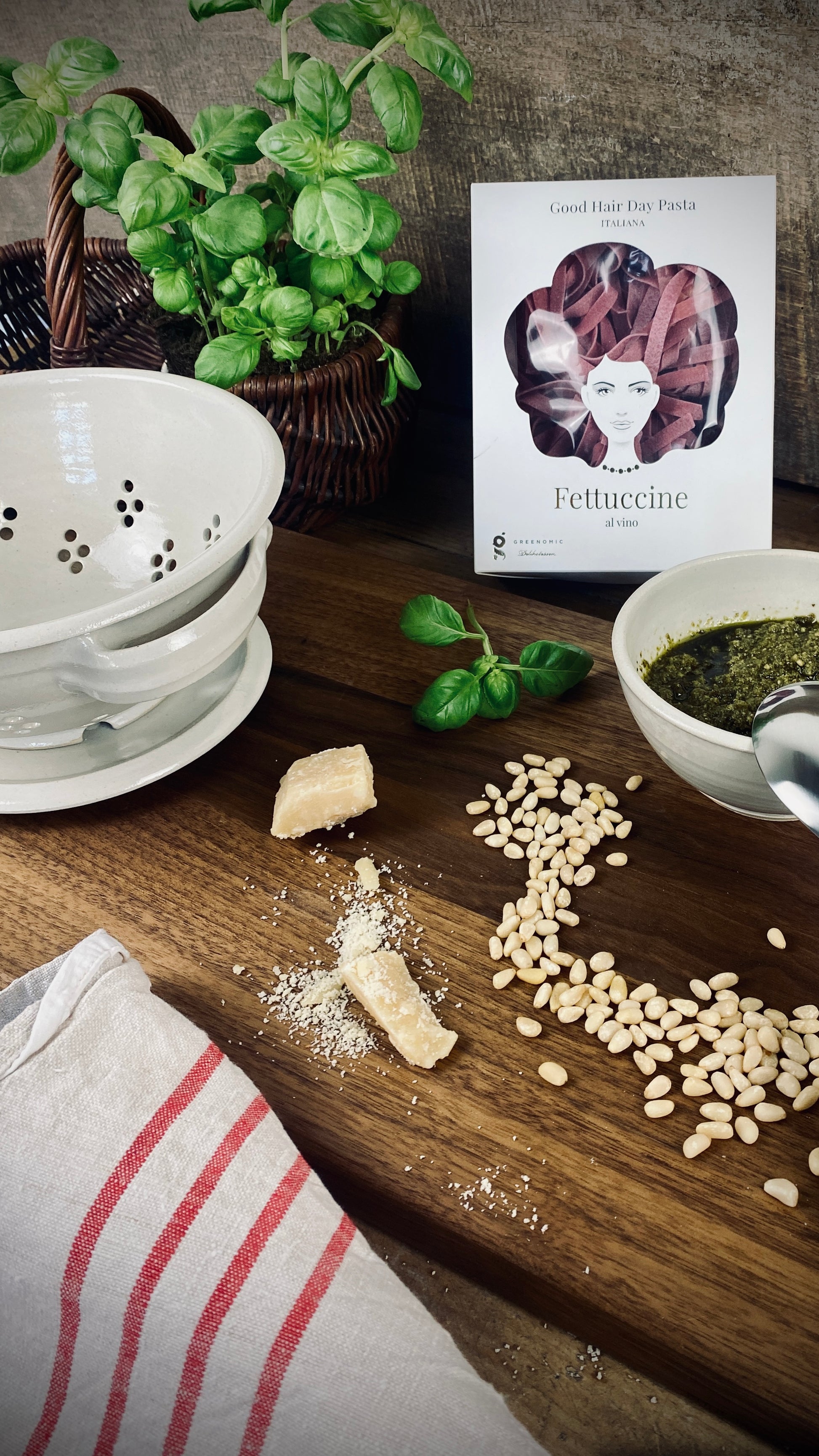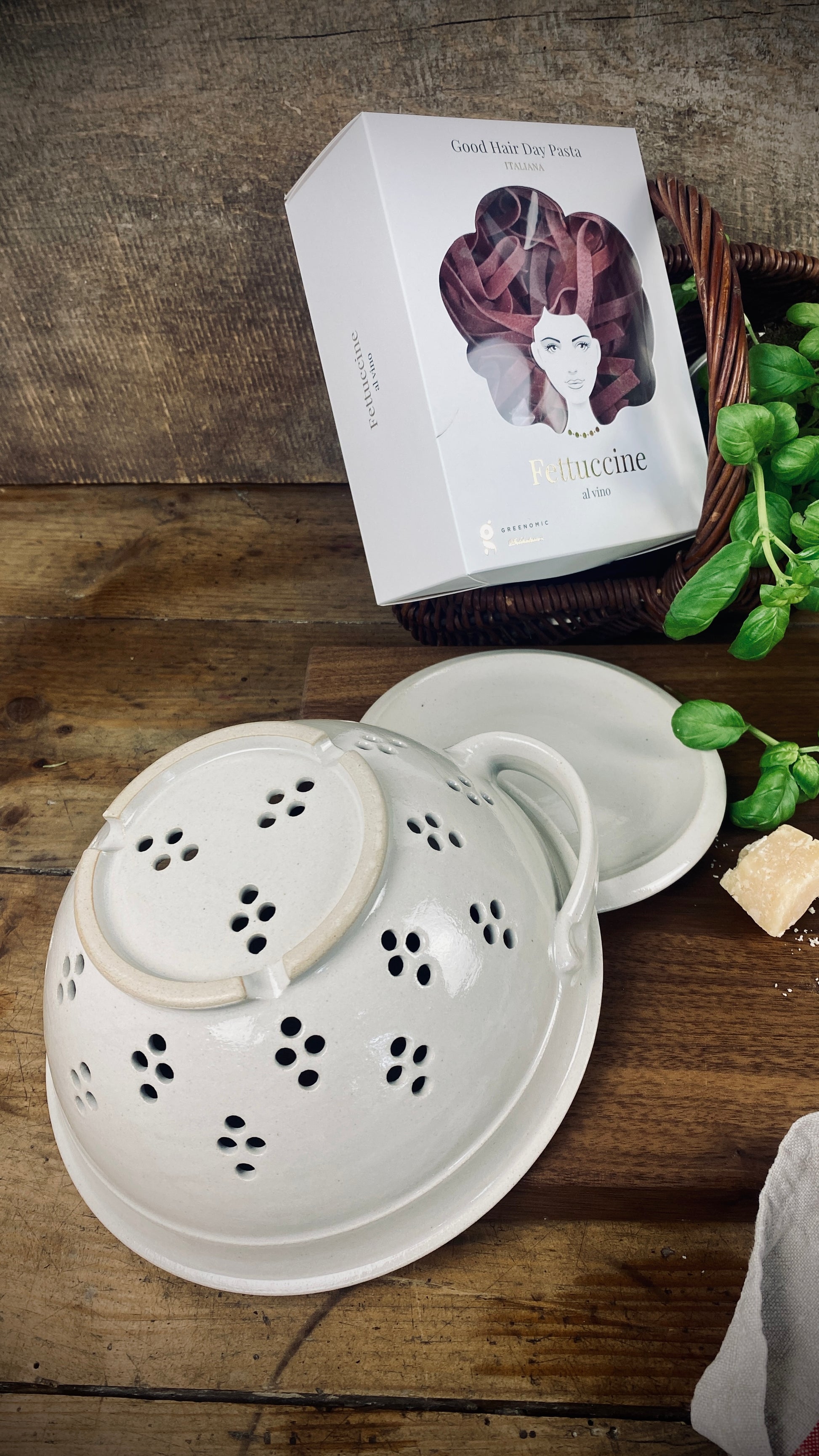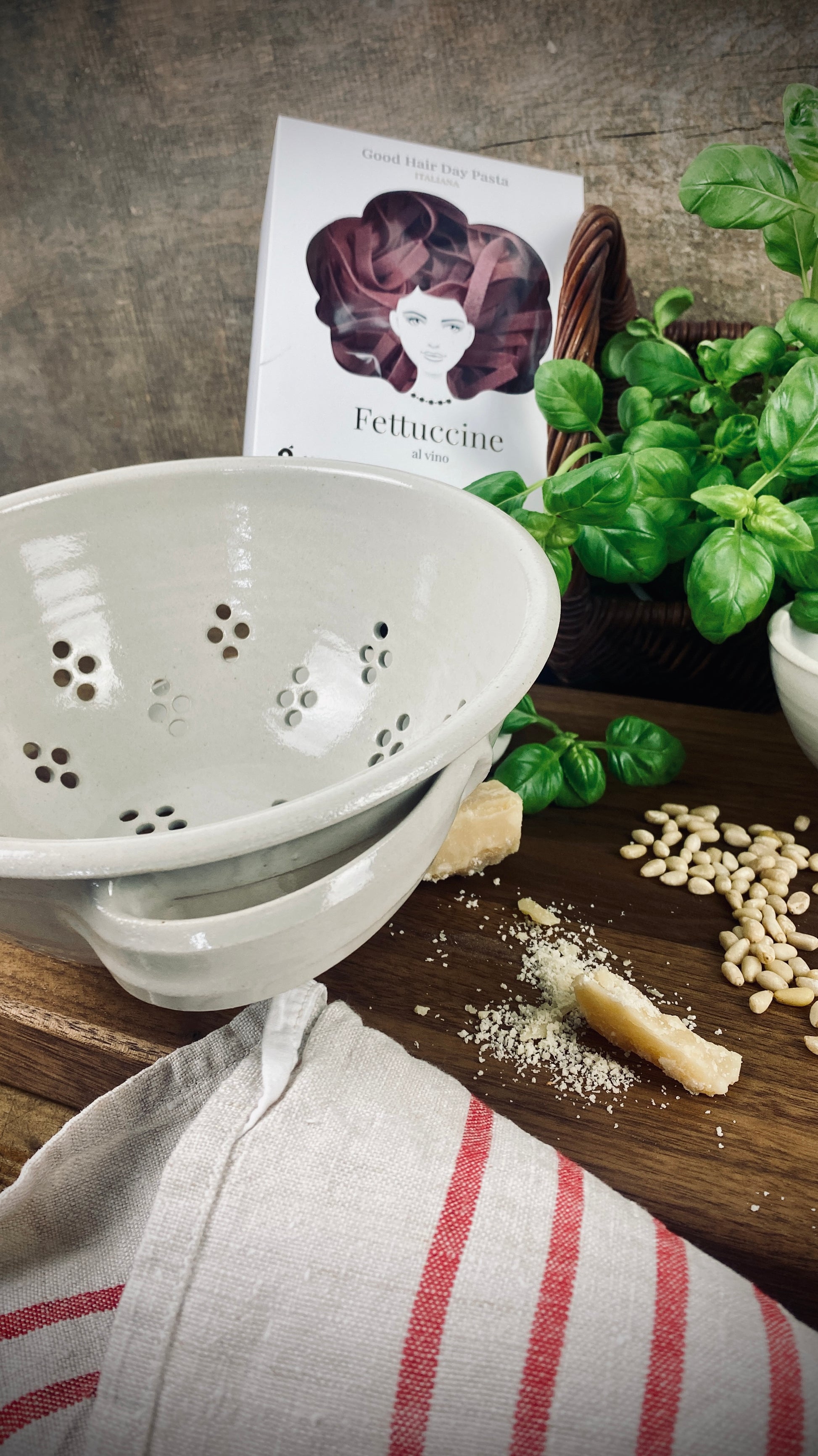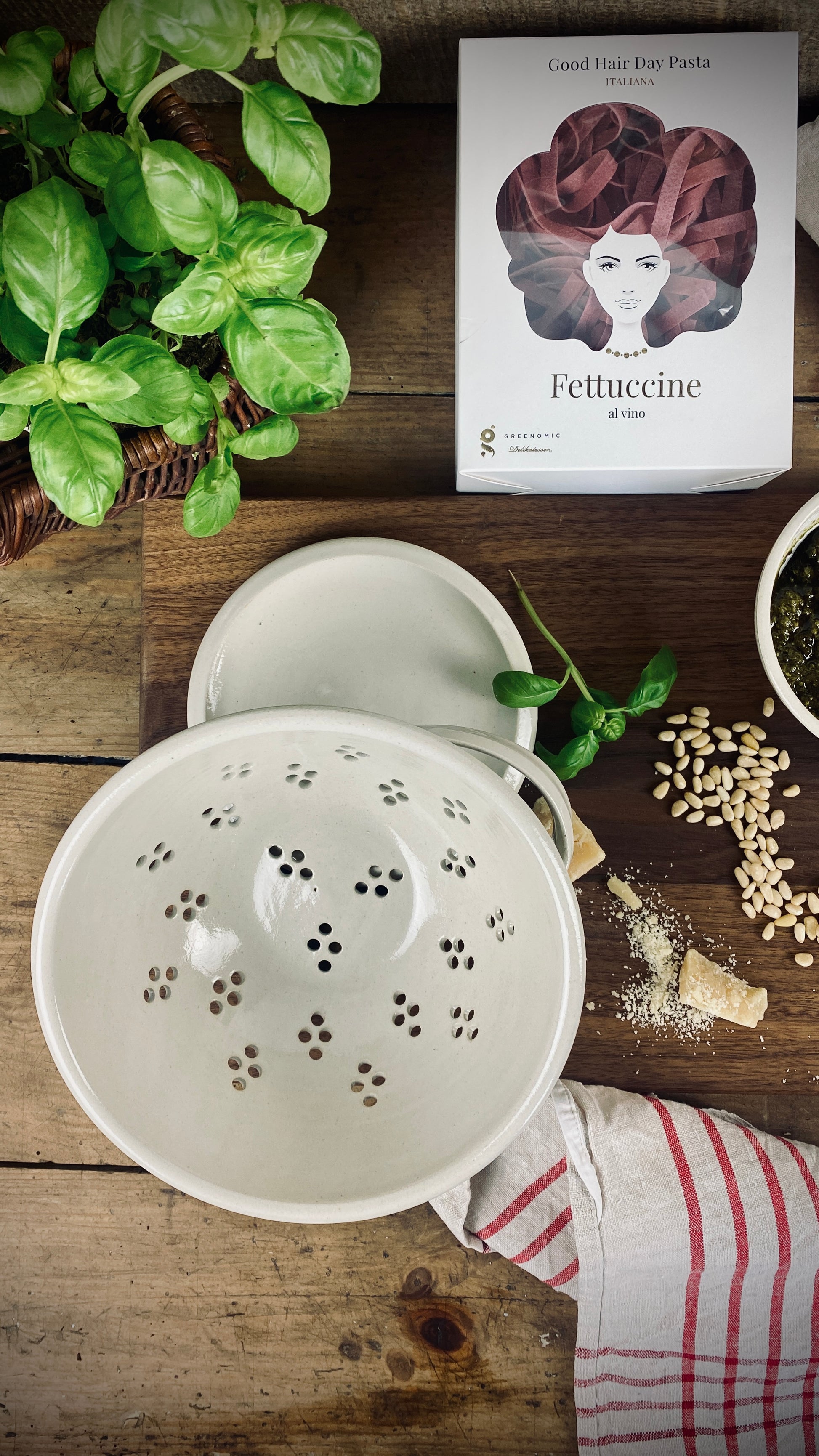 Fettuccine al Vino are traditionally made using the bronze process, which gives the pasta a rough surface and a denser texture – ideal for absorbing sauces. Made from durum wheat semolina, eggs, red wine, and beetroot powder, this Good Hair Day creation delights not only with its delicate flavor but also with its characteristic red-pink color. Combined with the hand-thrown colander and saucer from Andrea's studio in Lower Saxony, this creates a unique gift set – each piece is unique, crafted with love and care.