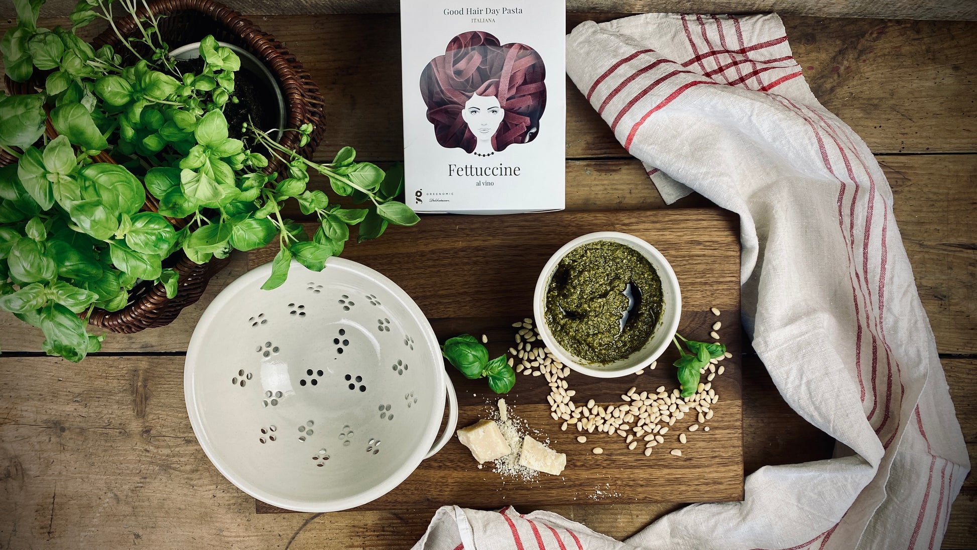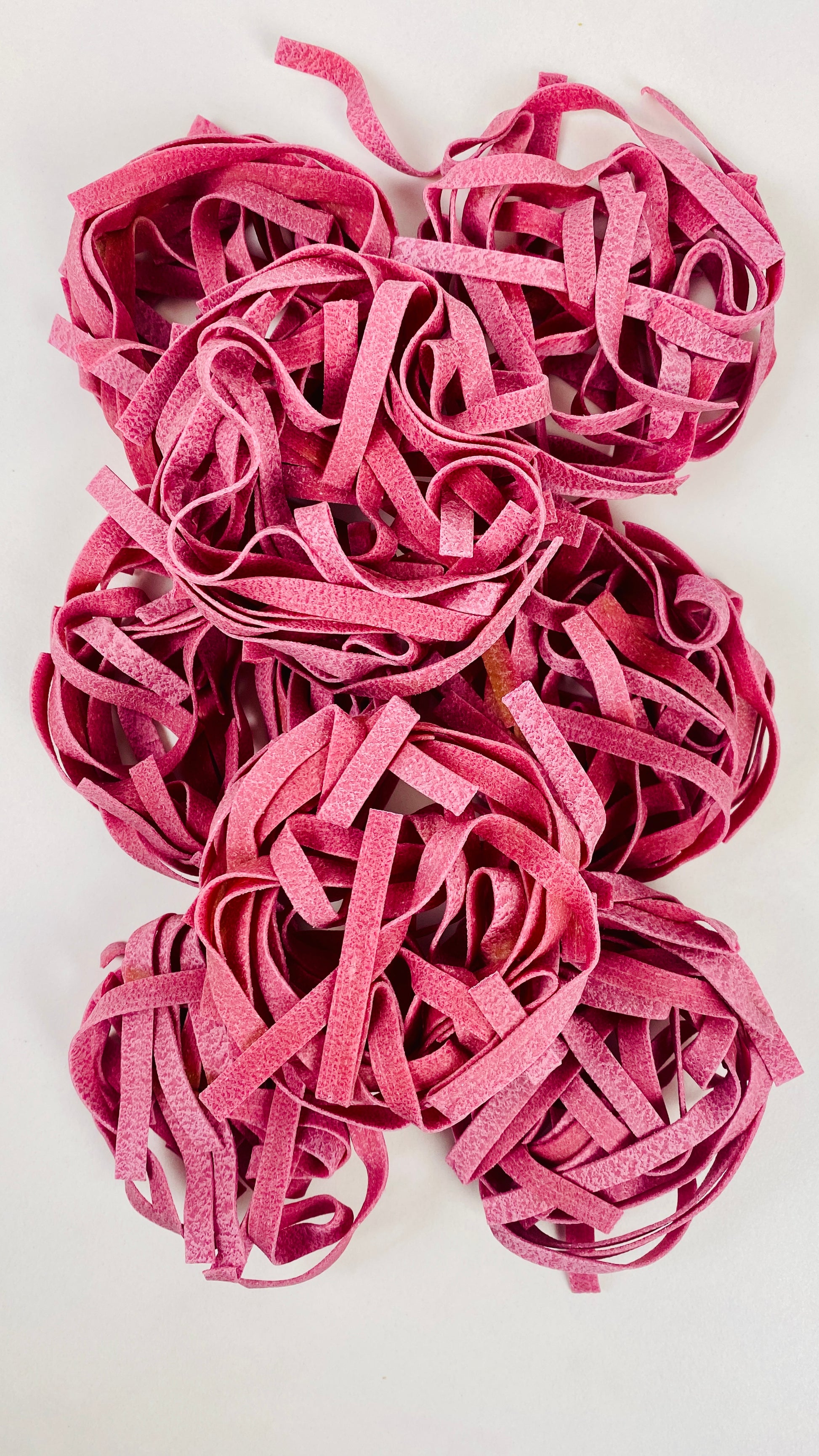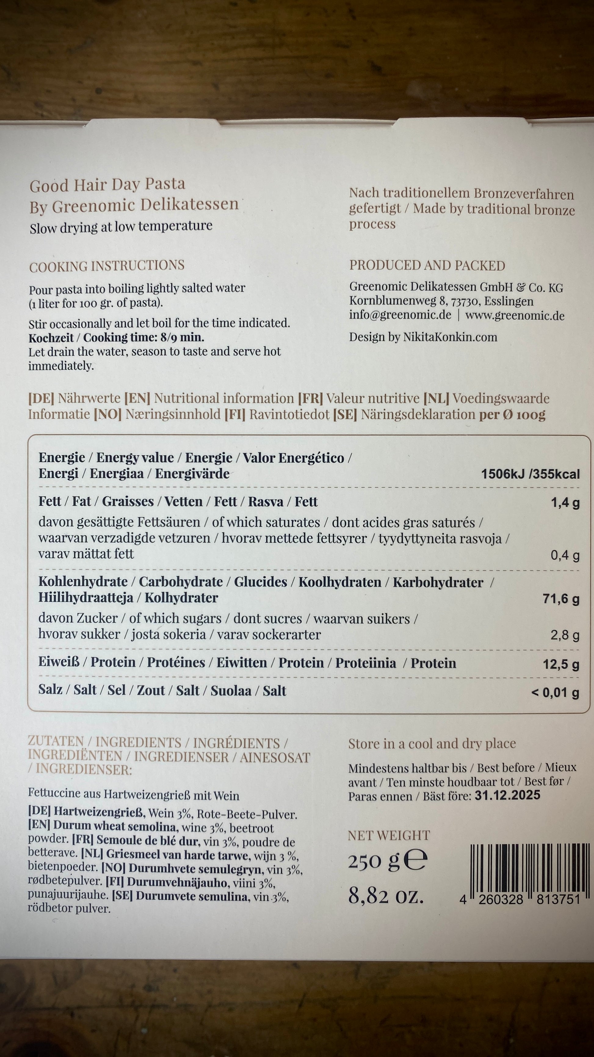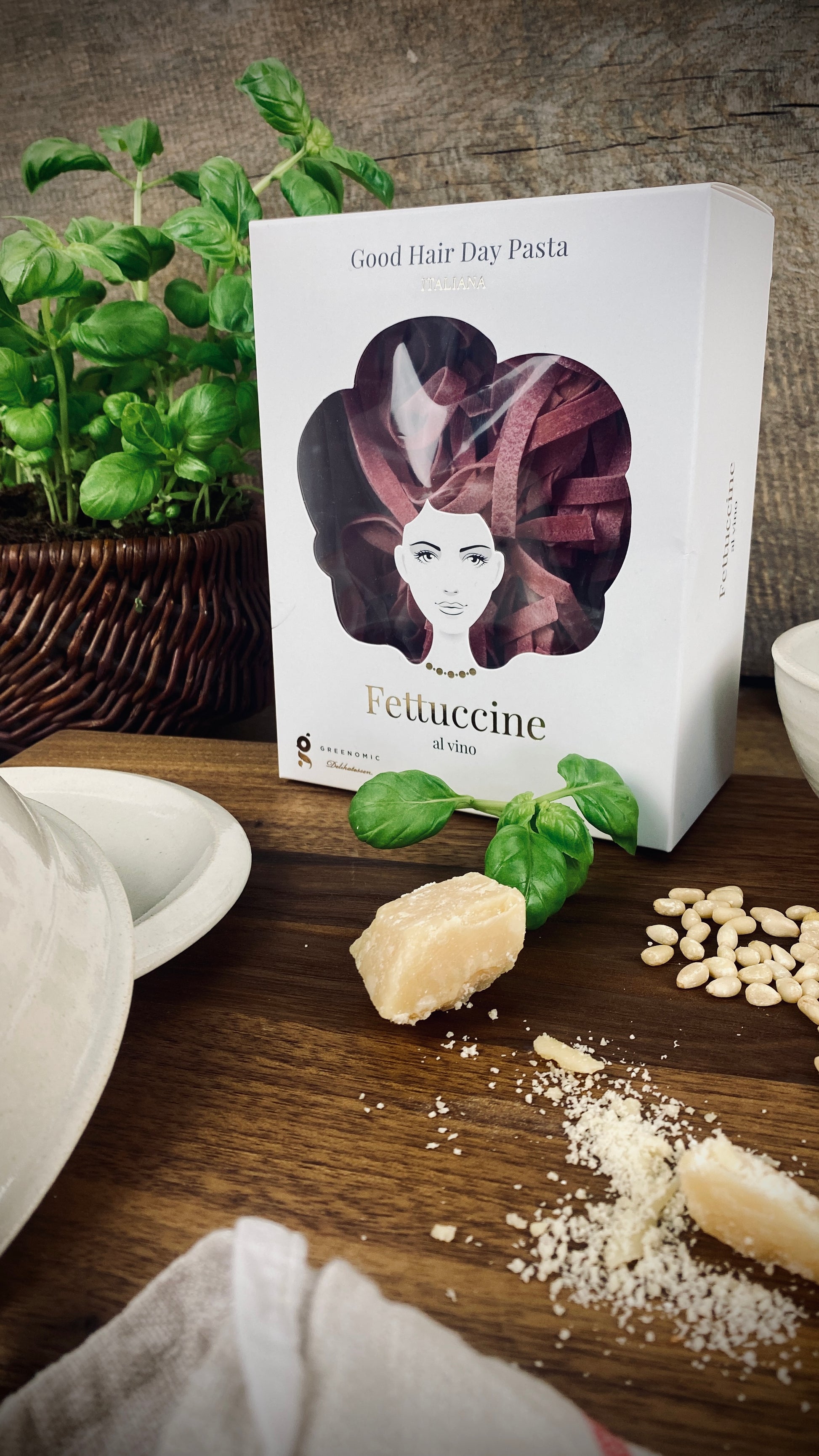 Fettuccine al Vino are traditionally made using the bronze process, which gives the pasta a rough surface and a denser texture – ideal for absorbing sauces. Made from durum wheat semolina, eggs, red wine, and beetroot powder, this Good Hair Day creation delights not only with its delicate flavor but also with its characteristic red-pink color. Combined with the hand-thrown colander and saucer from Andrea's studio in Lower Saxony, this creates a unique gift set – each piece is unique, crafted with love and care.
