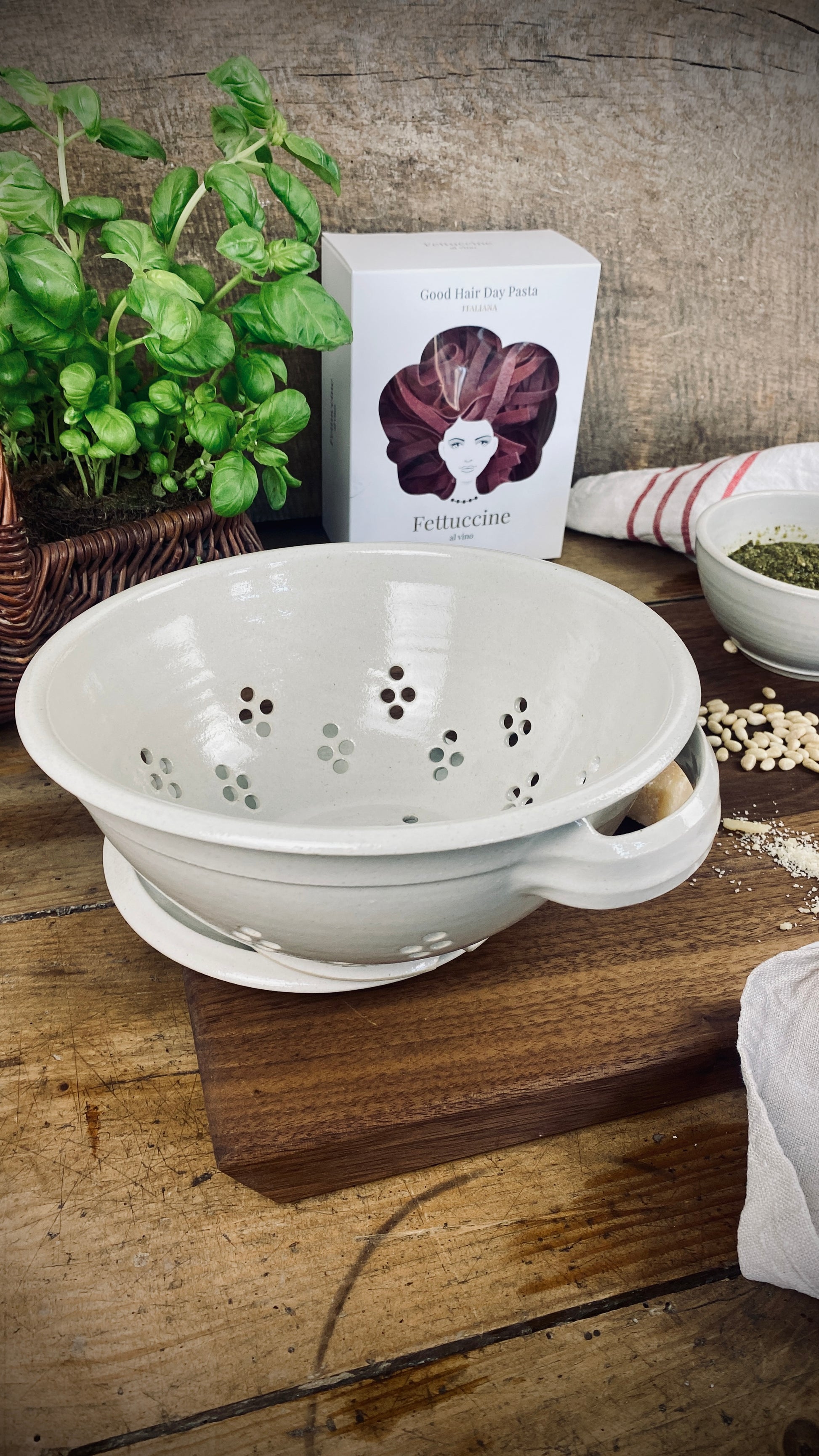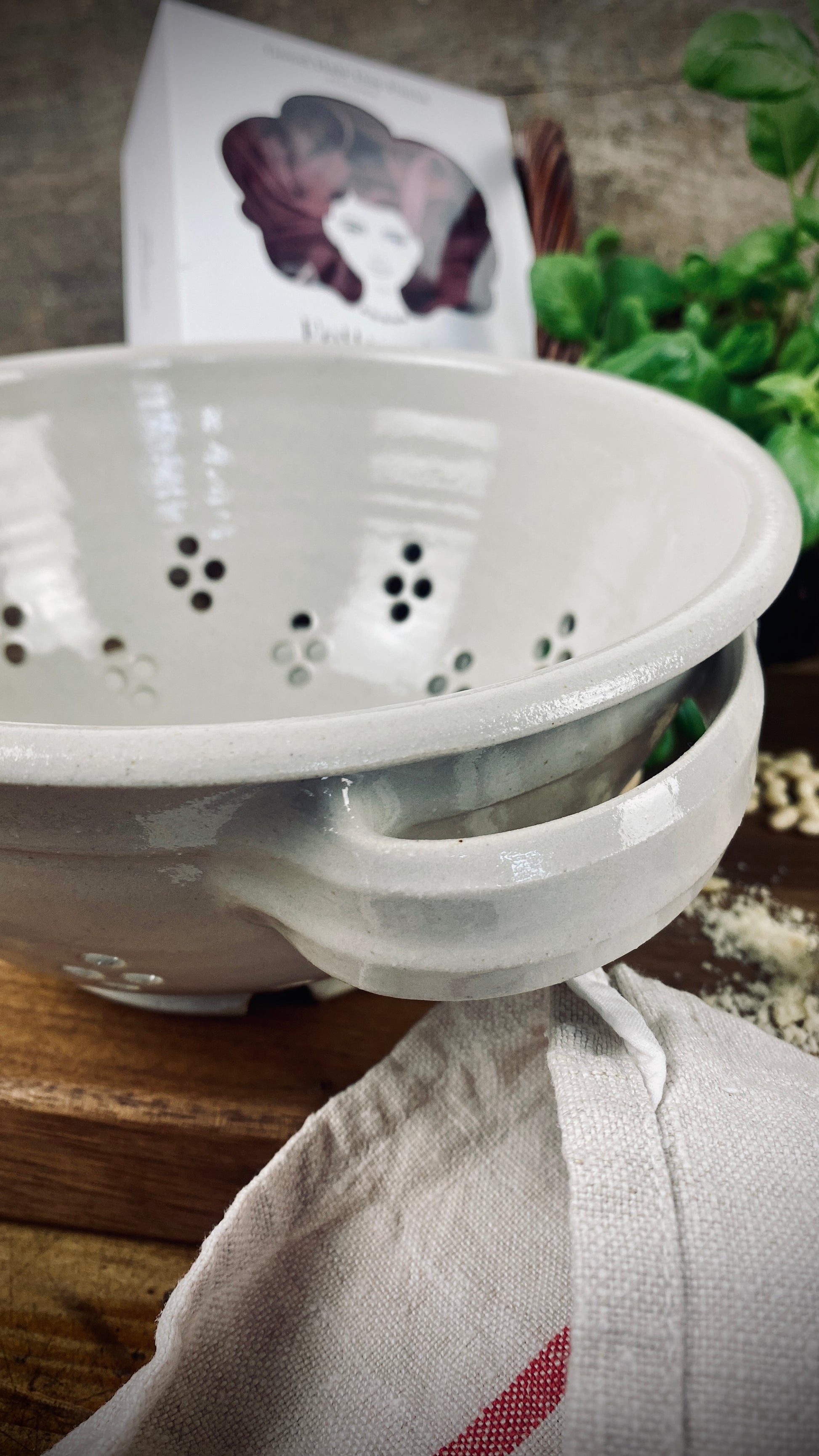 The gift set contains a hand-made sieve with saucer, manufactured in all steps by Andrea's Lower Saxony studio. Please note: Due to the handmade nature, slight variations in color, shape and size may occur. The ceramic sieve is fragile – please handle it carefully and protect it from impacts or drops. We recommend gentle hand washing. Not suitable for dishwasher or microwave use.