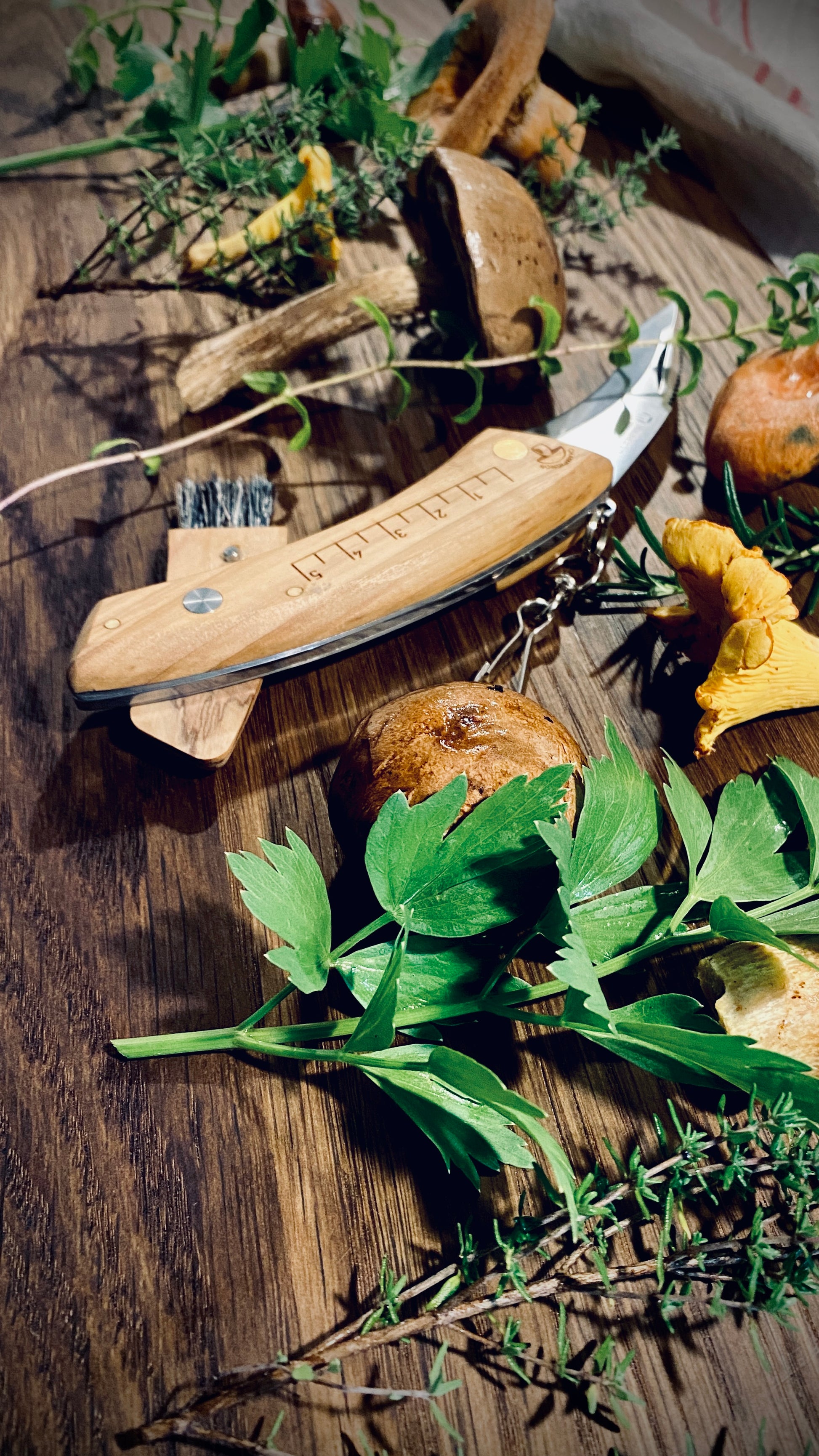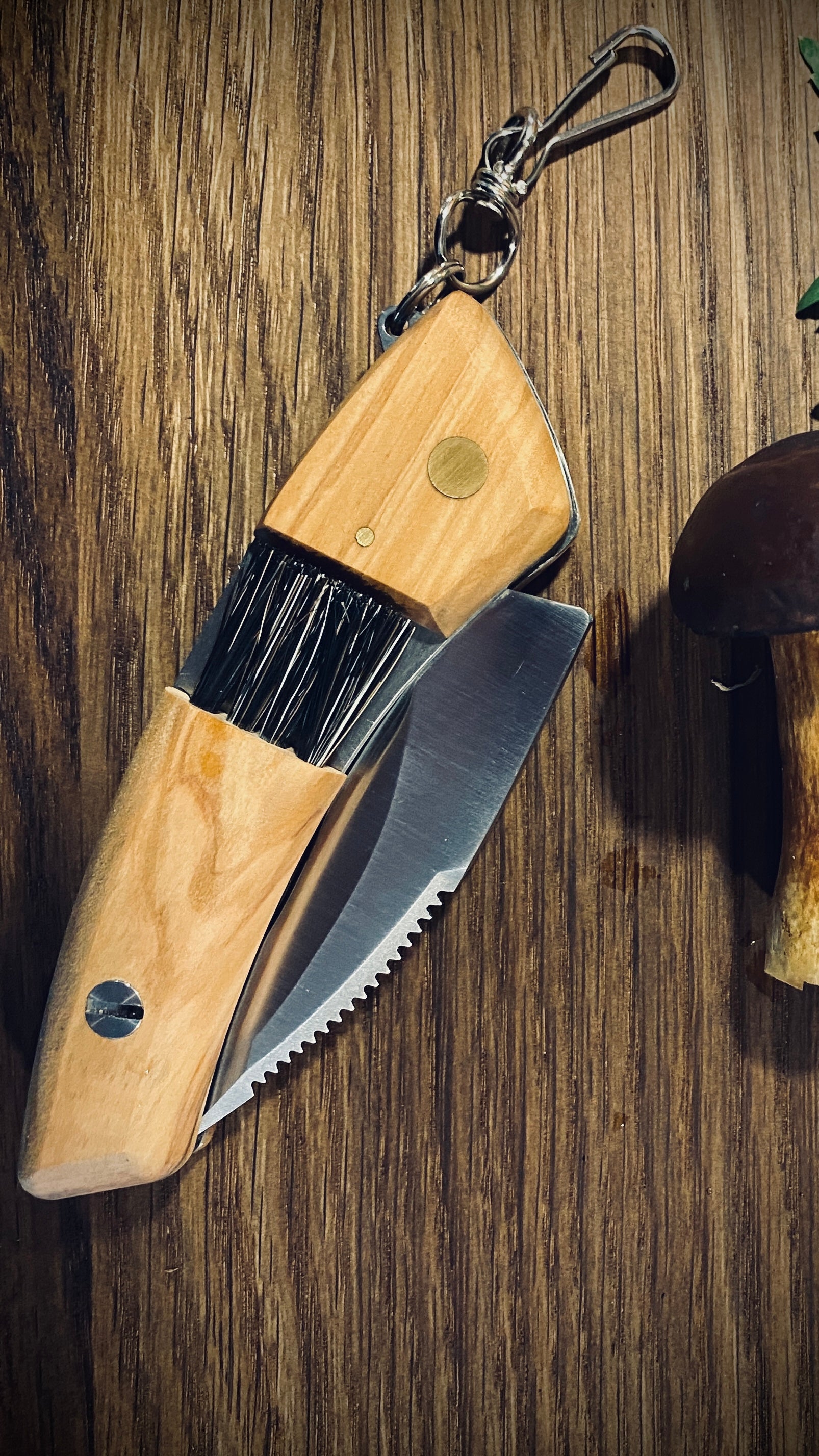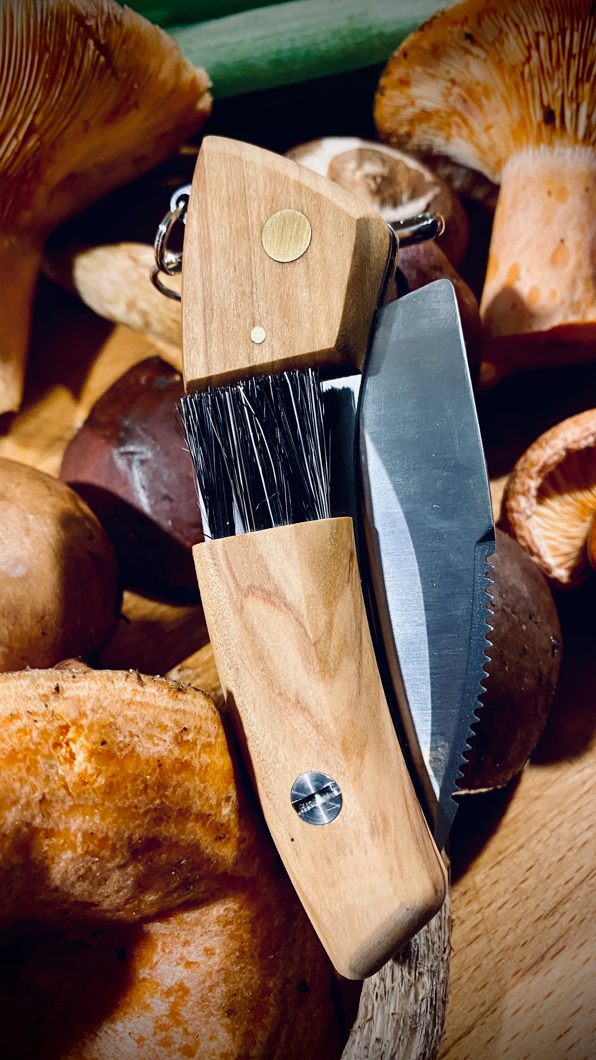 The knife impresses with a patented folding feature – a brush made of wild boar bristles. This gently removes sand and dirt from the collected mushrooms. The serrated blade back is ideal for removing coarse soil residue. The ergonomic olive wood handle ensures maximum comfort during every use.