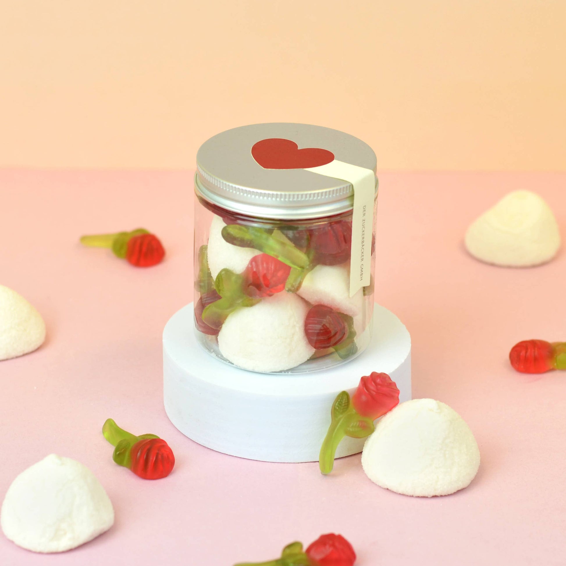 Sweeten up Valentine's Day or a wedding with this lovingly filled candy tin from Der Zuckerbäcker. The delightful combination of delicate fruit gum roses and fluffy marshmallow balls will put a smile on everyone's face. Every bite becomes a little taste experience and evokes unforgettable memories. Handmade with love and care, these sweets will make hearts beat faster and delight young and old alike.