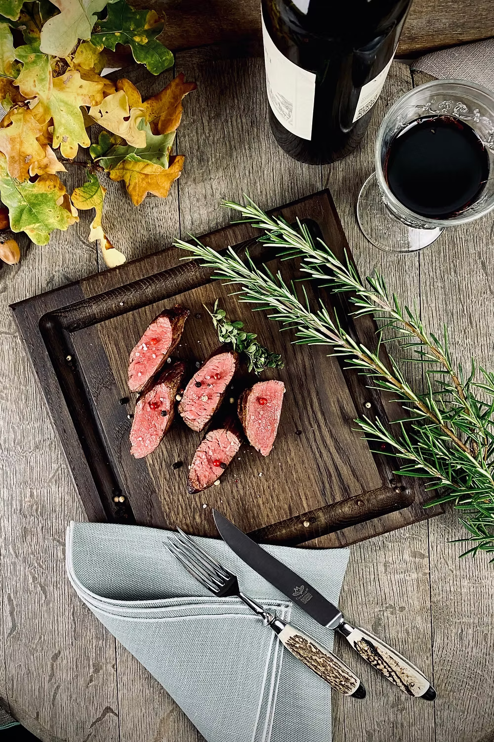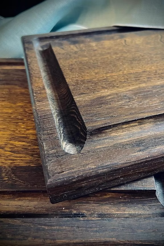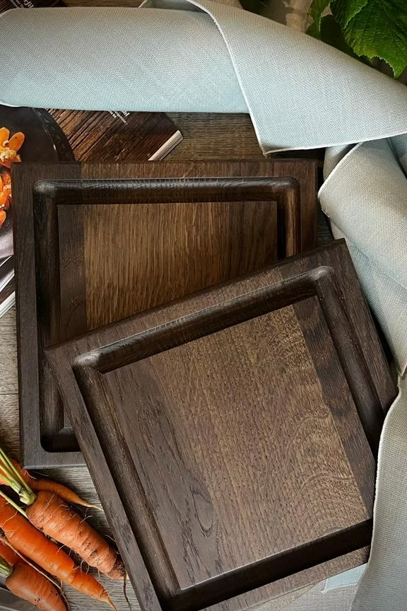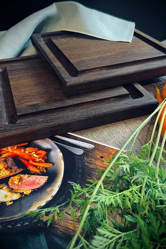 This elaborately handcrafted steak serving board, made of solid dark or natural oak, features a juice groove on one side and was specially crafted in a 25x25 cm square shape. This steak board can be set up for each guest. The juice groove is 2 cm wide and approximately 1 cm deep, allowing for a large amount of liquid. A step is incorporated at each of the elongated ends, allowing the steak board to be placed comfortably on the table.