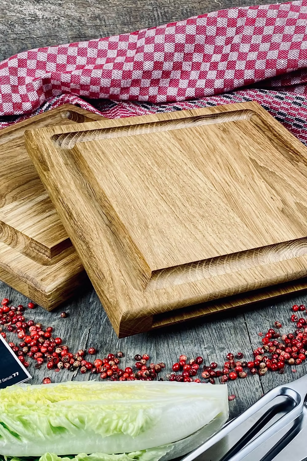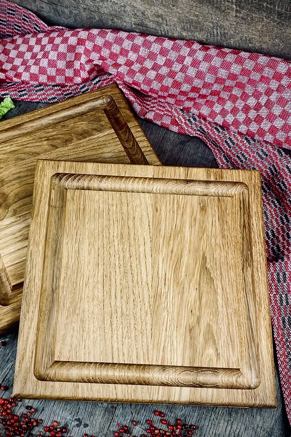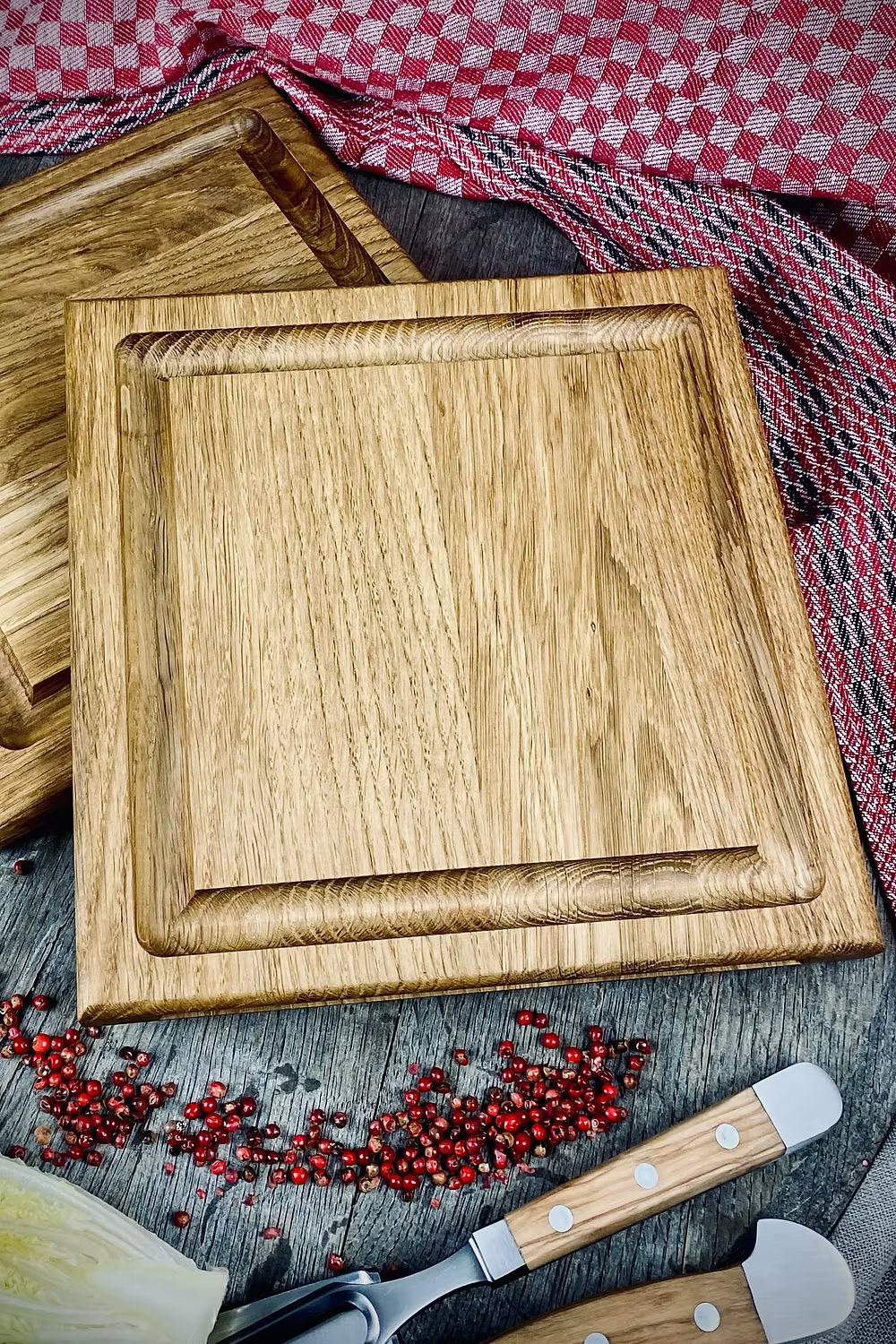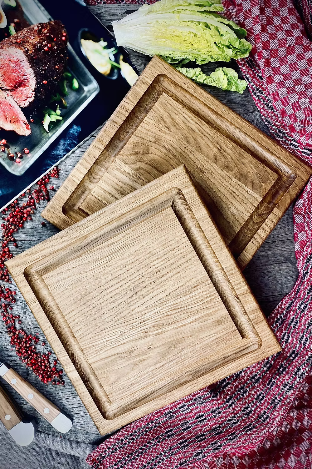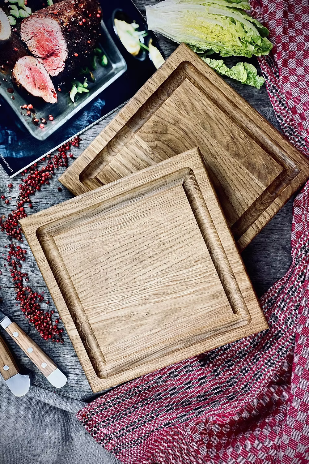 These two elaborately handcrafted steak serving boards, made of solid dark or natural oak, feature a juice groove on one side and were specially crafted in a 25x25 cm square shape. This steak board can be set up for each guest. The juice groove is 2 cm wide and approximately 1 cm deep, allowing for a large amount of liquid. A step is incorporated into each side, allowing the steak board to be placed comfortably on the table.