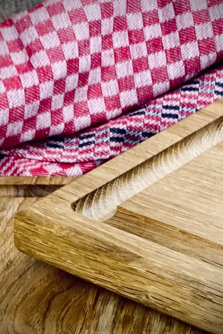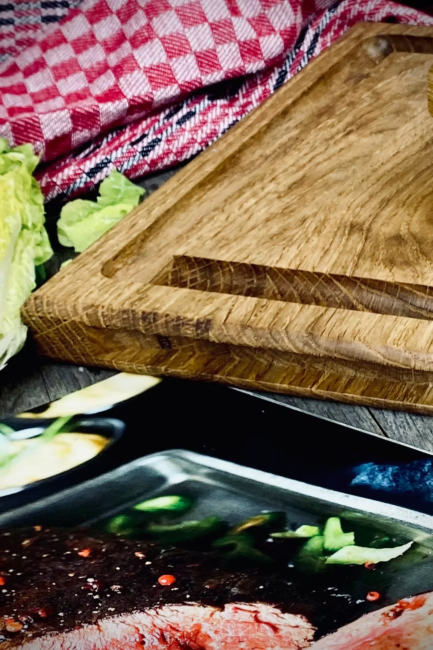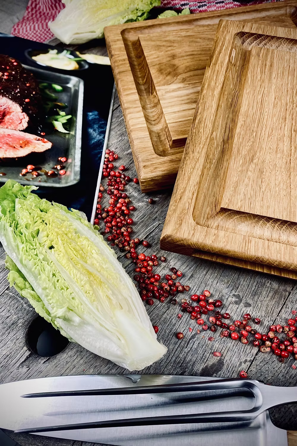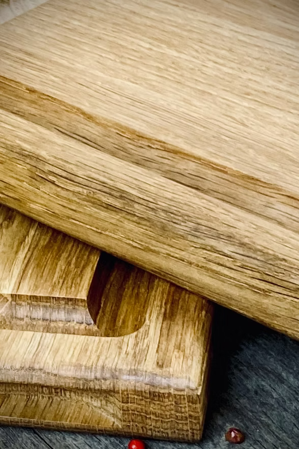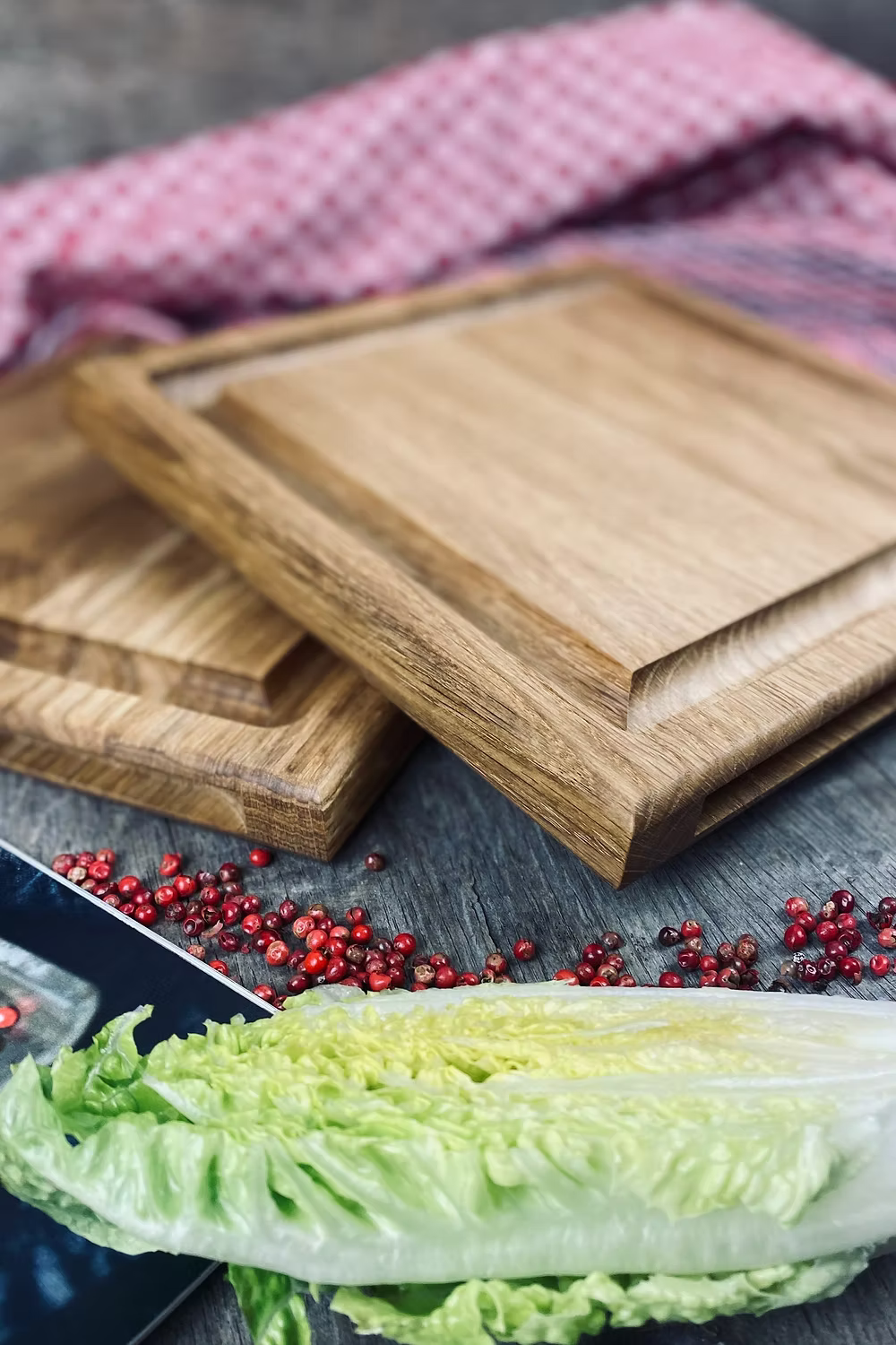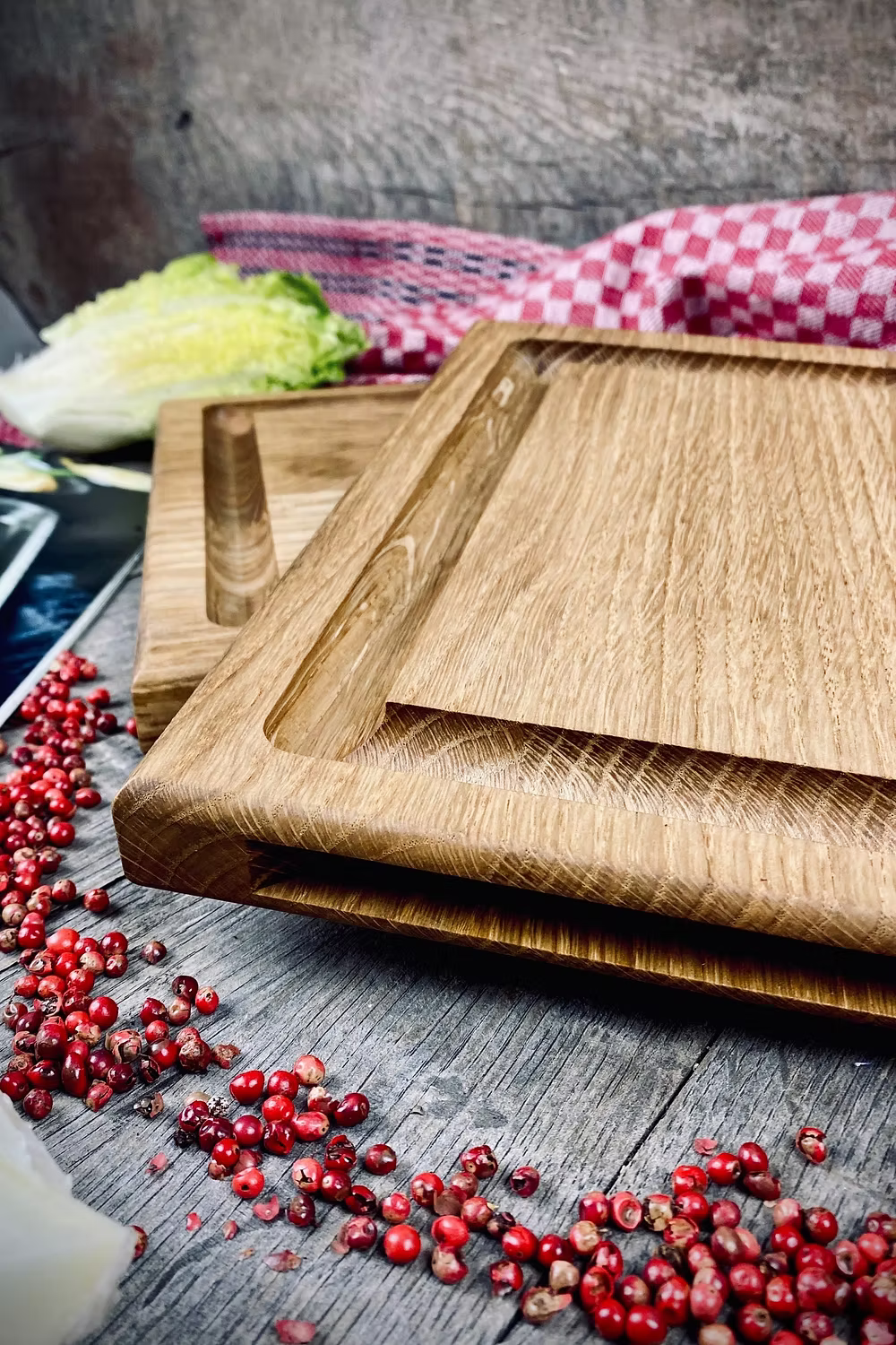 These two elaborately handcrafted steak serving boards, made of solid dark or natural oak, feature a juice groove on one side and were specially crafted in a 25x25 cm square shape. This steak board can be set up for each guest. The juice groove is 2 cm wide and approximately 1 cm deep, allowing for a large amount of liquid. A step is incorporated into each side, allowing the steak board to be placed comfortably on the table.