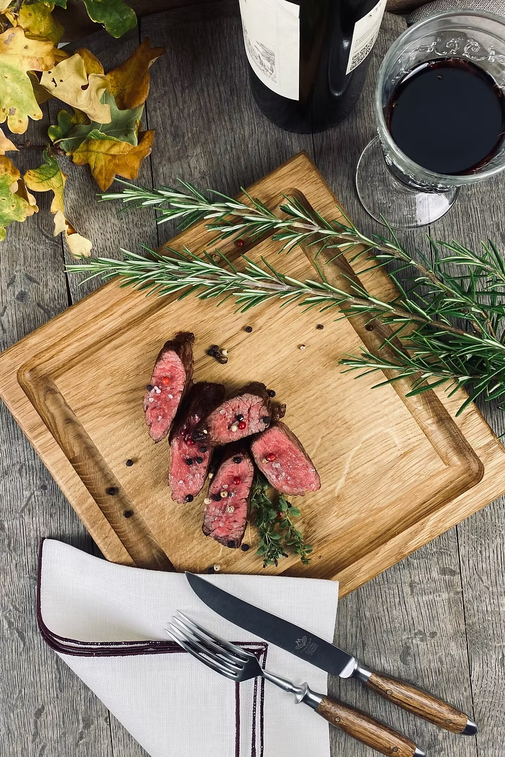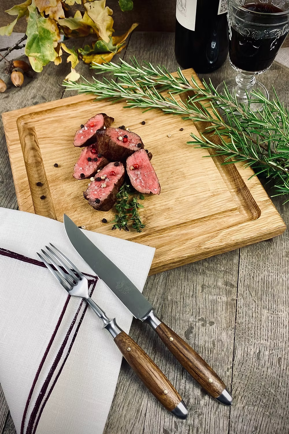 Steak board set of 2 made of solid oak in natural or dark with juicer