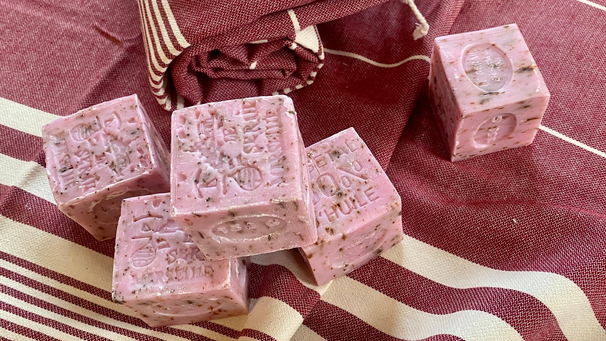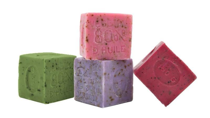Each soap cube weighs approximately 150g and is available in the scents rose petal, red vine, mint, and lavender.