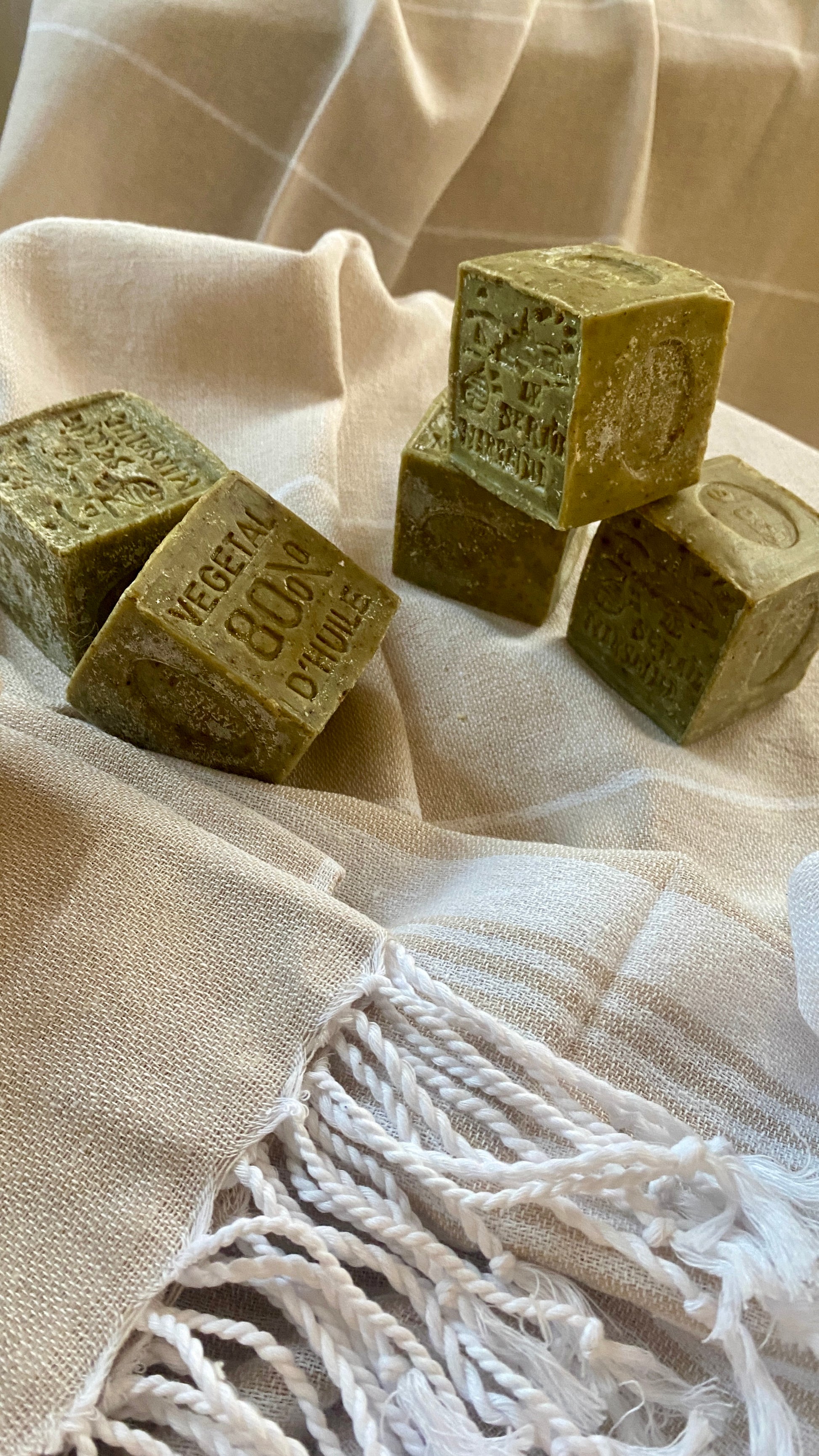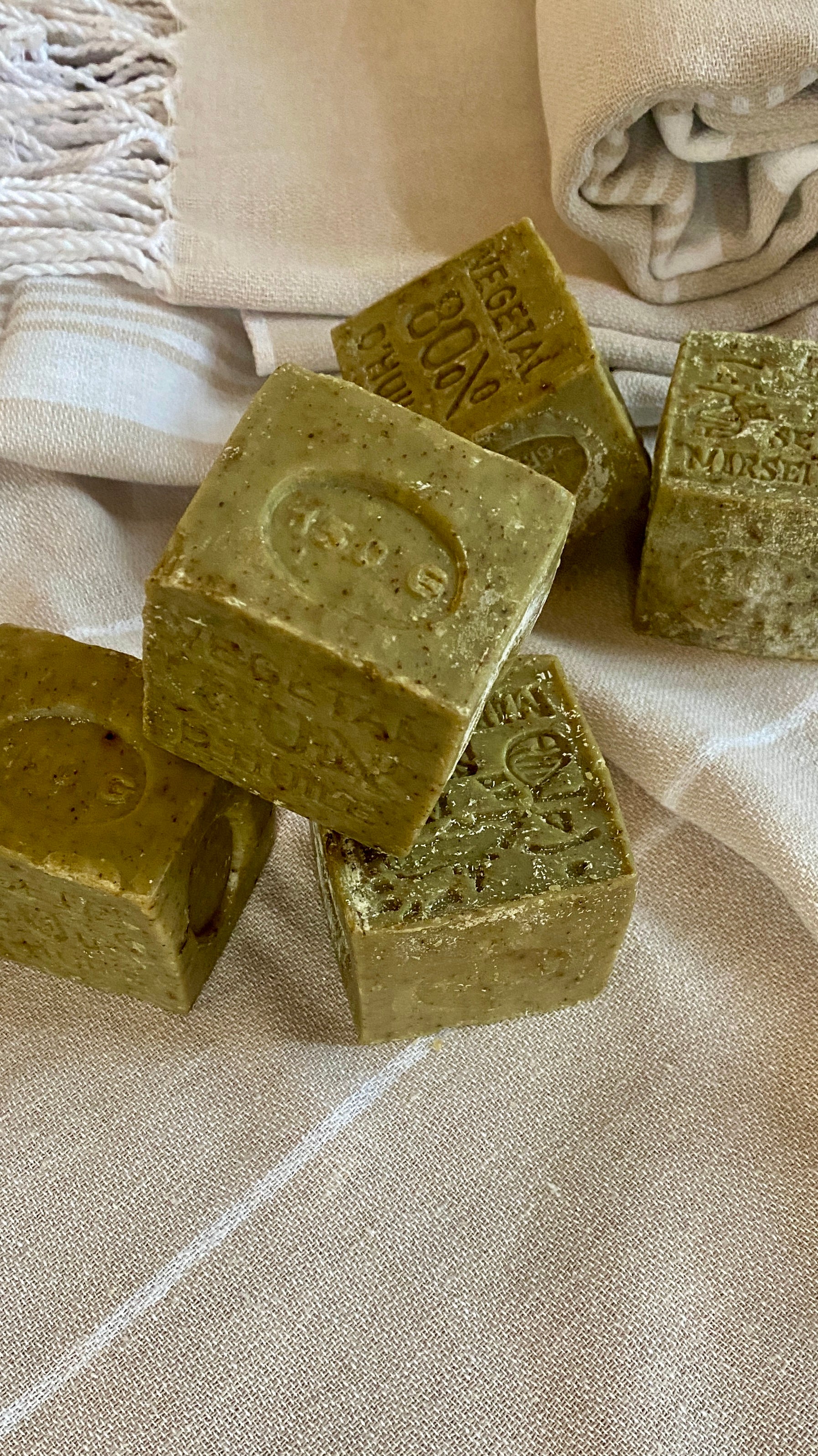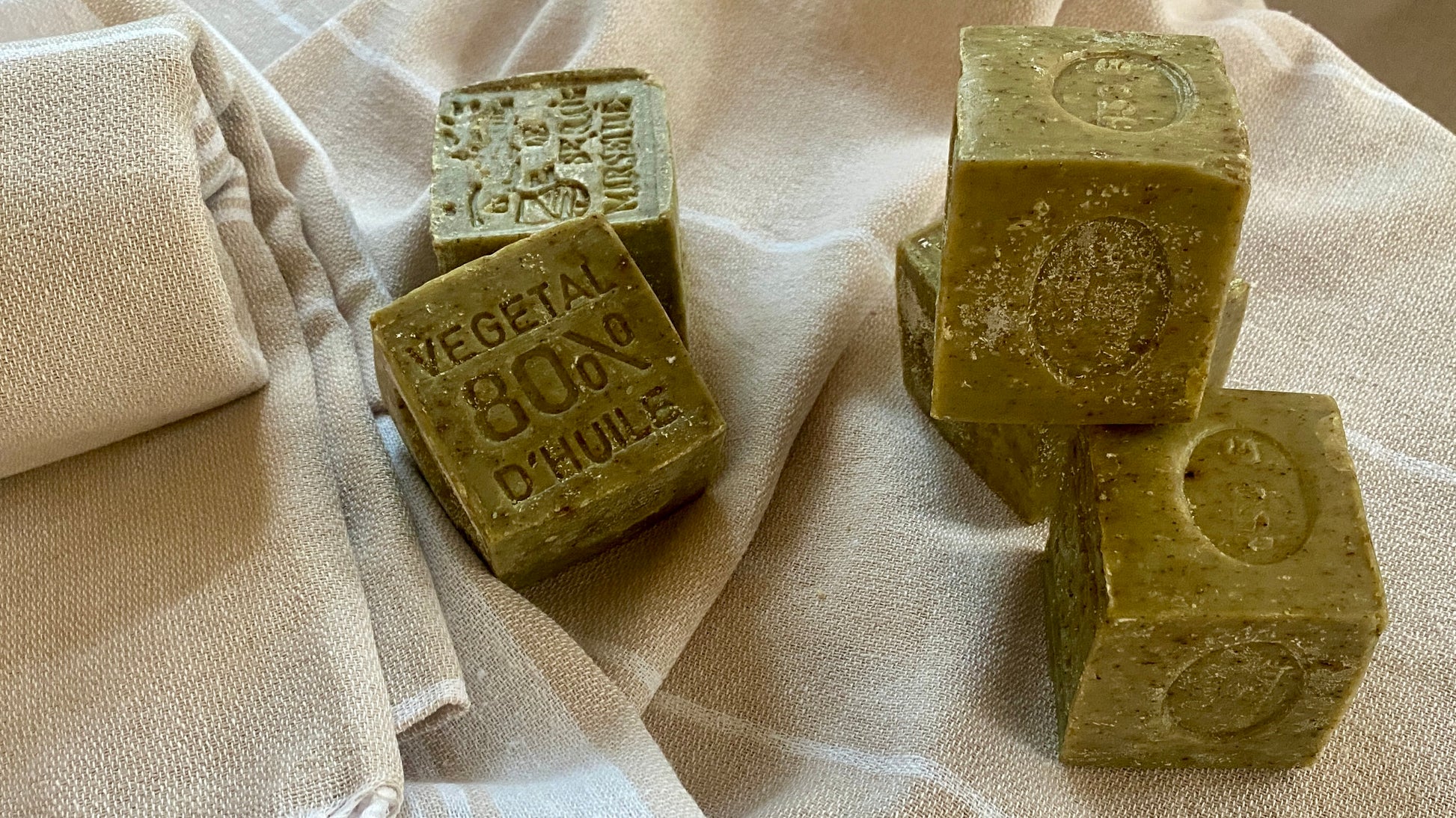 These genuine French Marseille soap cubes with olive oil are guaranteed free of palm oil, dyes, preservatives, or perfume. They are made in a cauldron using an ancestral process dating back over 300 years and bear the "Entreprise du Patrimoine Vivant" (EPV) quality seal.